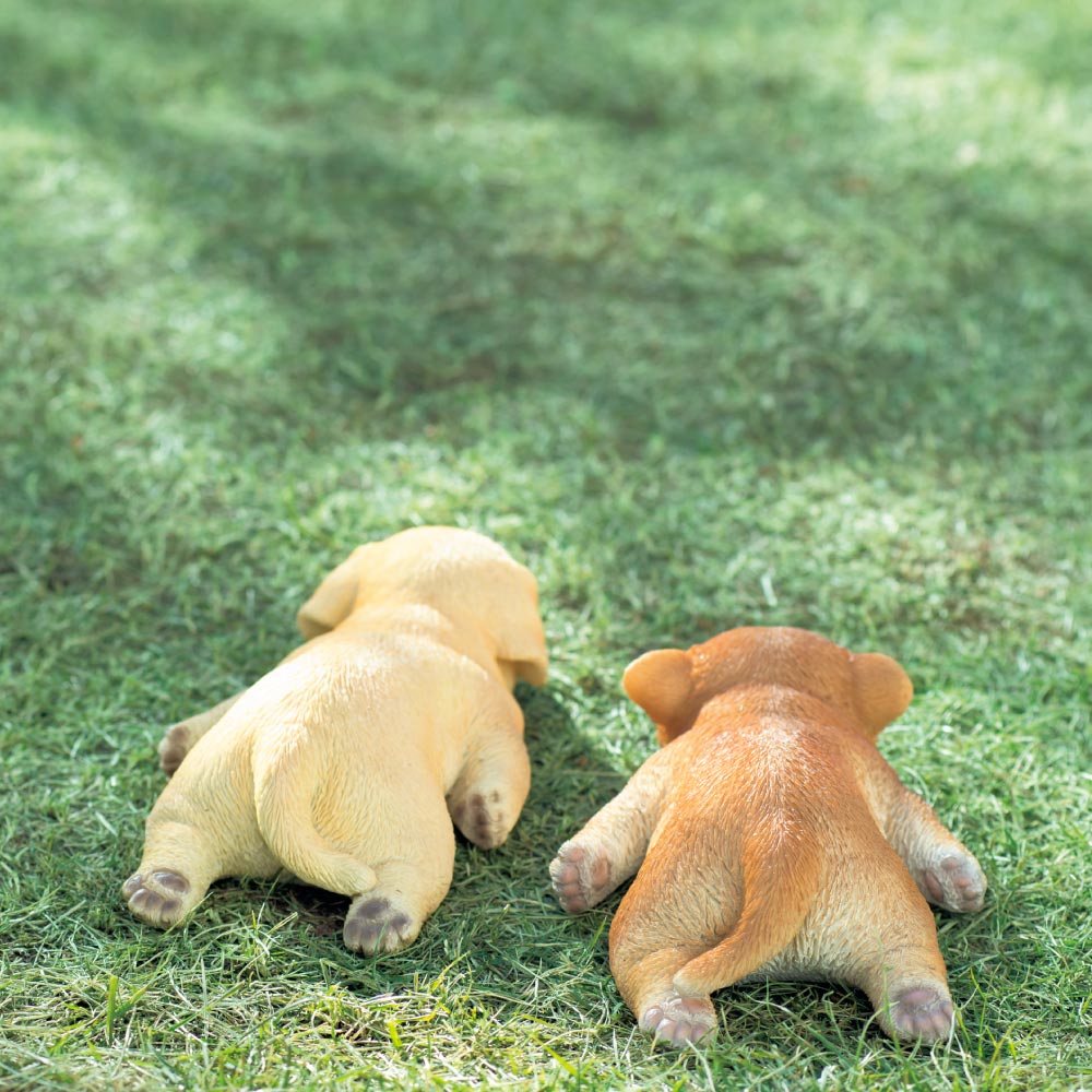 柴犬とレトリーバーの伸び犬オーナメント。春は「ぽかぽかだワン」、夏は「暑すぎだワン」という声が聞こえてきそう。