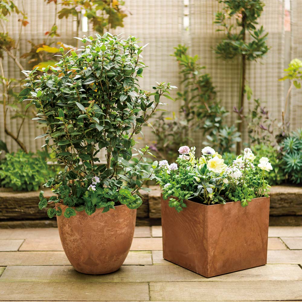まるで石のような見た目なのに、とっても軽い!マットな質感で植物をおしゃれに見せてくれる、アートストーンプランター。◆天然石のような質感!なのに軽い。・ストーンパウダーを混ぜ込んだ樹脂製。・素材感たっぷりなのに、片手でひょいっと持ち上げられるほどの軽さ。◆植物と相性のいい2色展開・ラスティブラウンテラコッタ風のイメージ。黄色やオレンジ、白い花の寄せ植えに。グラス系をメインに据えた寄せ植えでモダンにまとめても。・グレーモダンな雰囲気。ラベンダーなどのパープル系、ホワイトの薔薇などに。リーフのみの寄せ植えも素敵です。シンボルツリーを植えても。
