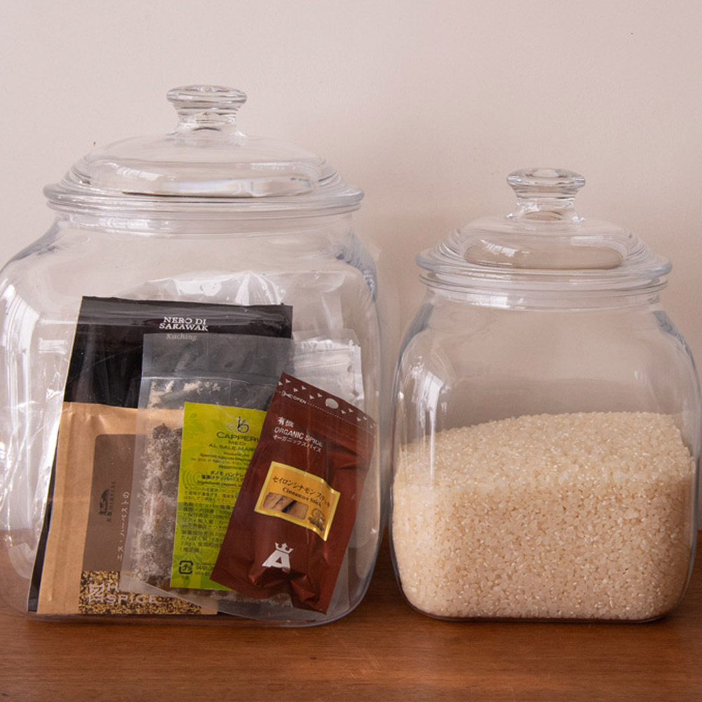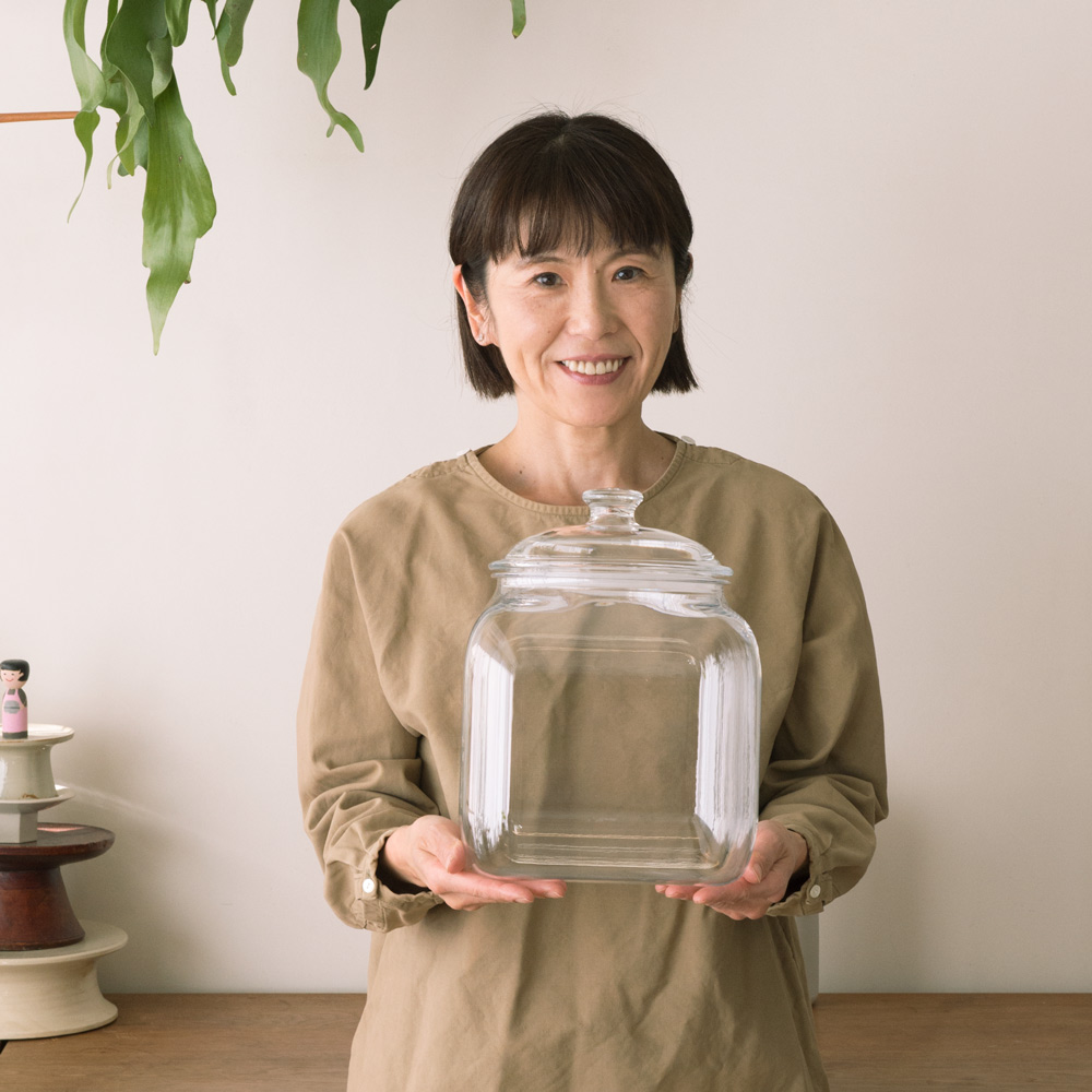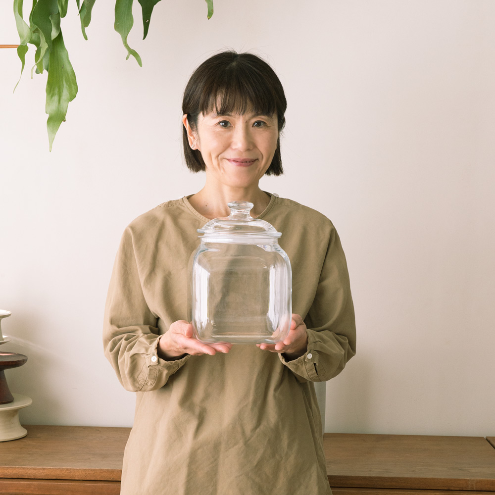 ワタナベマキさんの手放せない道具まるでガラスのような透明感と美しさが自慢。軽量で割れにくいポリカーボネート製キャニスター。軽くて丈夫。インテリアとしても美しい。「ガラスが好きなので、我が家にはお気に入りの店や旅先で少しずつ集めたグラスやガラスの器がいっぱい。それらと並んでも見分けがつかないほど“ガラス見え”するのに、持ち上げるとその軽さにびっくり。お米など重いものの保存にもうれいしですね。」3800mLサイズは、お米約3.2kgが入ります。「おしゃれな米びつとしてはもちろん、グラノーラやショートパスタなどを入れてキッチンに並べても映えそうです。」7800mLサイズは、お米約6.5kgが入ります。「米びつとしても絵になりますね。キャニスター自体がとても軽いので、重量のあるものをたっぷり入れても扱いやすいです。」開口部が広く、出し入れしやすい。「愛猫のペットフード入れとして使っています。開口部が広いので、袋から移し替えたり、すくい出したりしやすく、とても使い勝手がいいですね。」インテリアに溶け込むデザイン。「出しっぱなしでもインテリアを損ねないから、ペットフードなど毎日使うものの保存に重宝します。食品に限らず“見せる収納”として幅広く使えそうです。」割れる心配がなく、安心して使える。「大好きなガラス製品は安全を考えて扉付きの食器棚などにしまうことが多いですが、このキャニスターは樹脂製なので置く場所を選びません。ペットや子供のいるおうちでも安心して使えますね。」ふたはパッキン付きで、湿気やにおい対策も。「ふたはパッキン付きでしっかり閉まるから、湿気を避けたい乾物の保存にもおすすめ。におい漏れもしにくいです。私は使いかけの乾物や調味料などの袋をまとめて入れています。中がクリアに見えるので、使い忘れも防げそう。」重厚感と透明感のある佇まい。「目の前で見てもガラスと見紛うほどの透明度!」分厚いガラスのようなラグジュアリーな輝き。それでいて落としても破損やヒビの心配のない、しっかりとした厚みのポリカーボネート製です。一流ホテルやレストランでも採用されています。高度な加工技術により新次元の高い透明度とラグジュアリーな質感を実現した新素材・ポリカーボネートガラス。世界の一流レストラン・ホテルで使用されています。