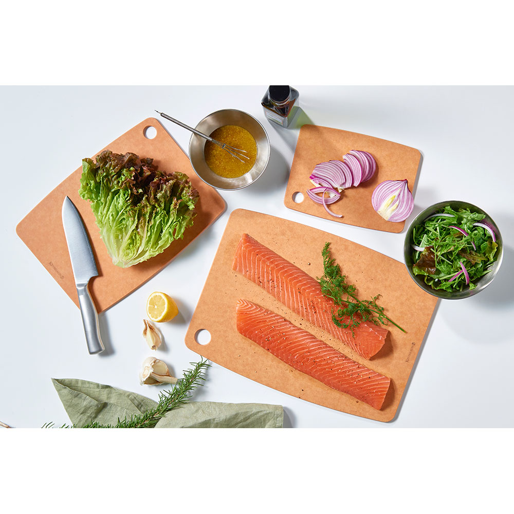 天然木の風合いと高い耐久性。水切れよくお手入れ簡単、抗菌性能※で清潔。多用途に使える美しいデザインのウッドファイバーカッティングボード。※JIS Z 2801による抗菌性評価済み