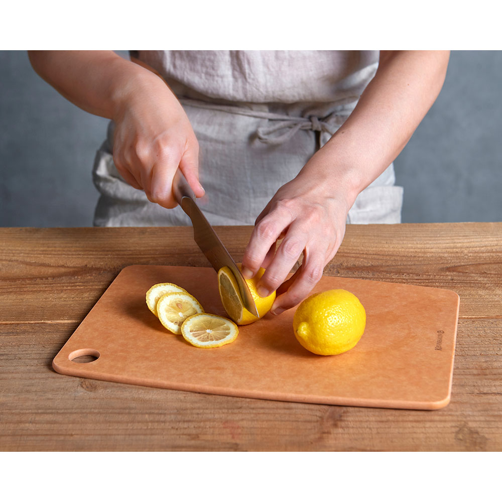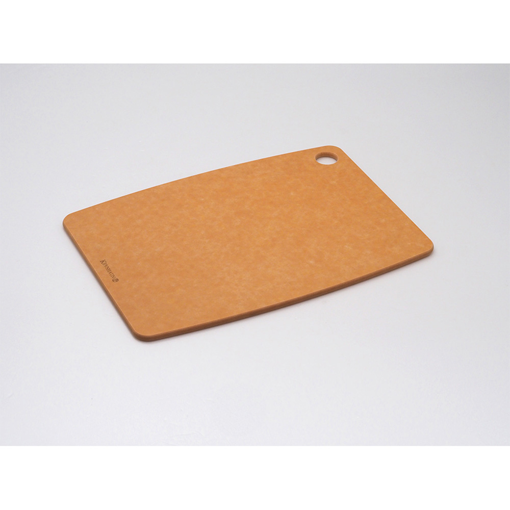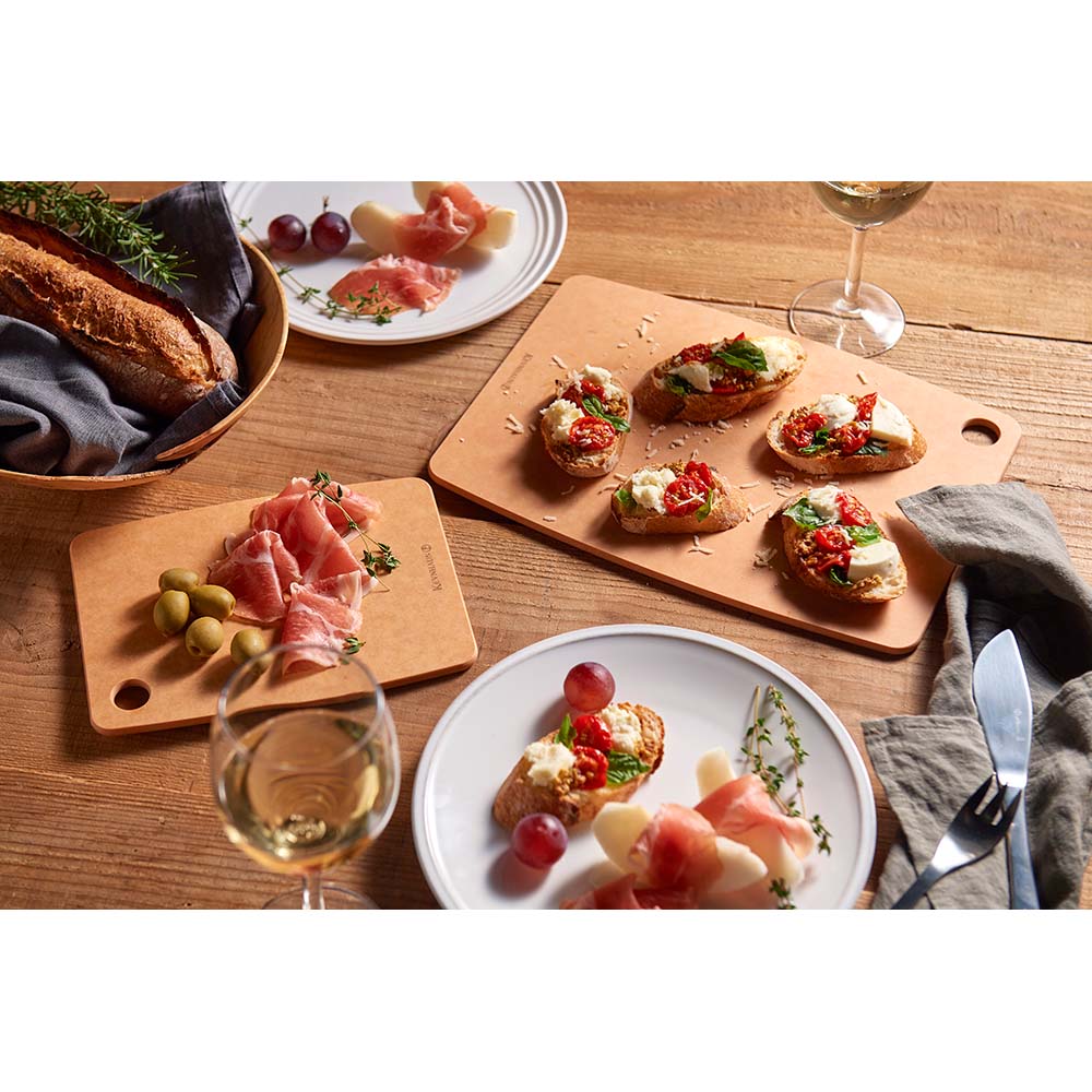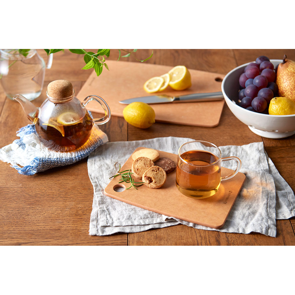 天然木の風合いと高い耐久性。水切れよくお手入れ簡単、抗菌性能※で清潔。多用途に使える美しいデザインのウッドファイバーカッティングボード。※JIS Z 2801による抗菌性評価済み天然木の風合いと高い耐久性ウッドファイバーカッティングボードは、天然木の繊維を合成した特殊素材を使用しています。しっかりとした硬さと、長く愛用できる耐久性を備えた一枚。プラスチック製の製品と比べて、深い傷がつきにくい素材です。いつも清潔、水切れの良さ水はけが良く、お手入れも簡単。乾きやすいので、使った後もすぐに収納できます。JIS Z 2801検査済みです!JIS Z 2801とは、抗菌加工された非繊維製品の表面における抗菌性を評価するための試験方法です。この試験では、黄色ブドウ球菌と大腸菌の2種類の菌が用いられます。第三者機関においてこの規格に基づいて試験を行った結果、抗菌性能が認められました!(検査機関 一般財団法人カケンテストセンター)キッチンを彩る美しいデザイン落ち着いたカラーとシンプルなデザインが、どんなキッチンにも違和感なく馴染みます。本体の端に穴が開いているので、吊り下げ収納も可能です。厚みは約6mmと薄く、収納の際に場所を取りません。用途広がる多機能まな板食材によるにおい移りも気になりにくいので、サイズごとに使い分けが可能。まな板としてはもちろん、プレートとしてフルーツやクッキーを乗せたり、耐熱温度170℃の耐熱性を活かしてカップやポットを置くこともできます。(調理直後の鍋やフライパンは置かないでください)使い勝手のよいサイズバリエーションS・M・Lの豊富なサイズ展開で、お好みや用途に合わせてお選びいただけます。