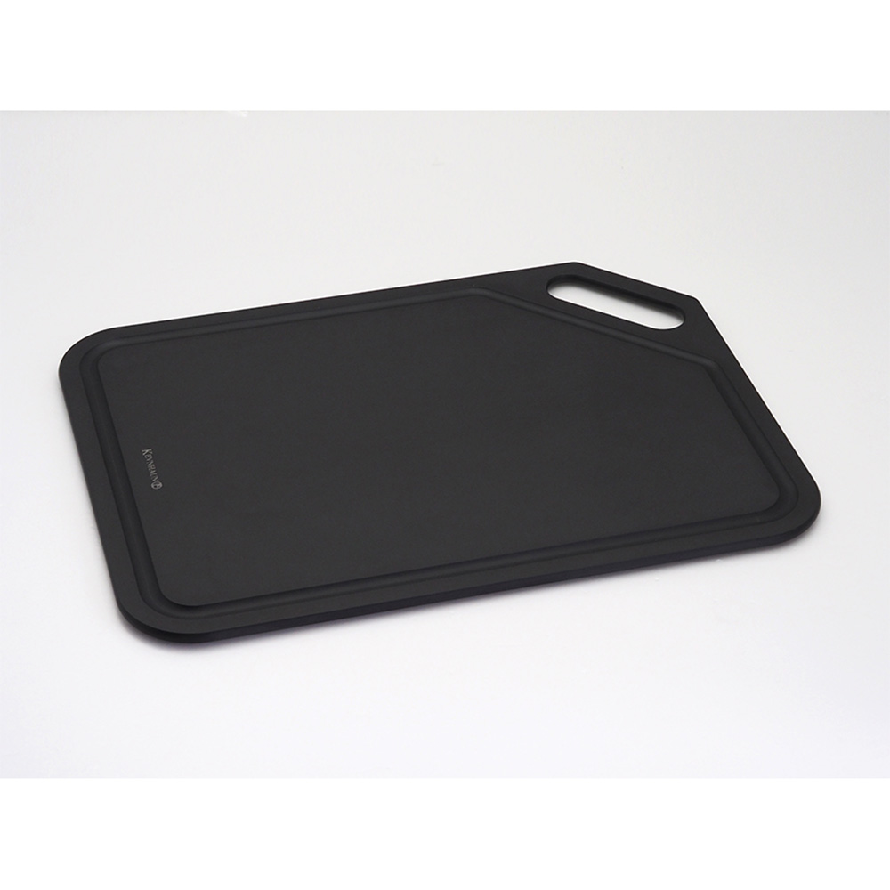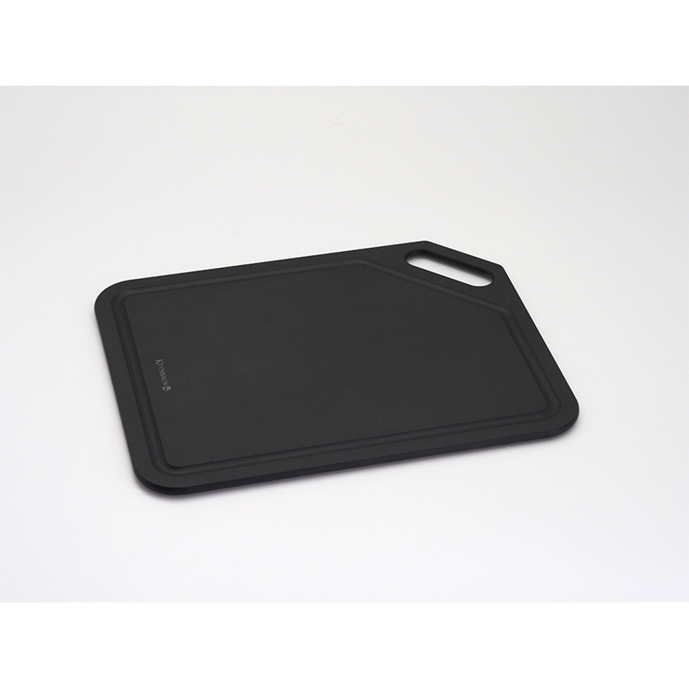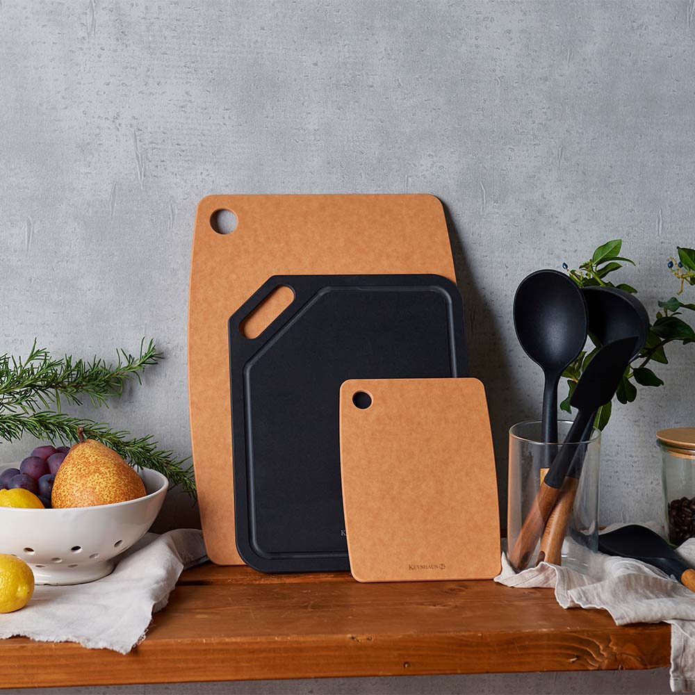 天然木の風合いと高い耐久性。水切れよくお手入れ簡単、抗菌性能※で清潔。多用途に使える美しいデザインのウッドファイバーカッティングボード。※JIS Z 2801による抗菌性評価済み天然木の風合いと高い耐久性ウッドファイバーカッティングボードは、天然木の繊維を合成した特殊素材を使用しています。しっかりとした硬さと、長く愛用できる耐久性を備えた一枚。プラスチック製の製品と比べて、深い傷がつきにくい素材です。いつも清潔、水切れの良さ水はけが良く、お手入れも簡単。乾きやすいので、使った後もすぐに収納できます。JIS Z 2801検査済みです!JIS Z 2801とは、抗菌加工された非繊維製品の表面における抗菌性を評価するための試験方法です。この試験では、黄色ブドウ球菌と大腸菌の2種類の菌が用いられます。第三者機関においてこの規格に基づいて試験を行った結果、抗菌性能が認められました!(検査機関 一般財団法人カケンテストセンター)キッチンを彩る美しいデザイン落ち着いたカラーとシンプルなデザインが、どんなキッチンにも違和感なく馴染みます。本体の端に穴が開いているので、吊り下げ収納も可能です。厚みは約6mmと薄く、収納の際に場所を取りません。用途広がる多機能まな板食材によるにおい移りも気になりにくいので、サイズごとに使い分けが可能。まな板としてはもちろん、プレートとしてフルーツやクッキーを乗せたり、耐熱温度170℃の耐熱性を活かしてカップやポットを置くこともできます。(調理直後の鍋やフライパンは置かないでください)使い勝手のよいサイズバリエーション溝付きなので、パンくずや肉汁がこぼれにくく、テーブルを汚しにくい工夫も凝らされています。