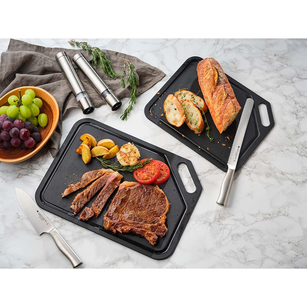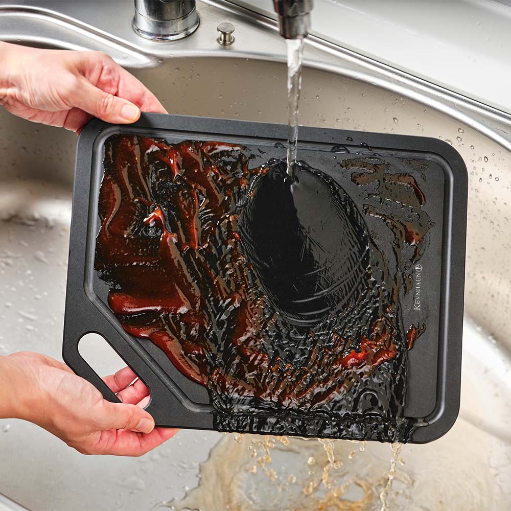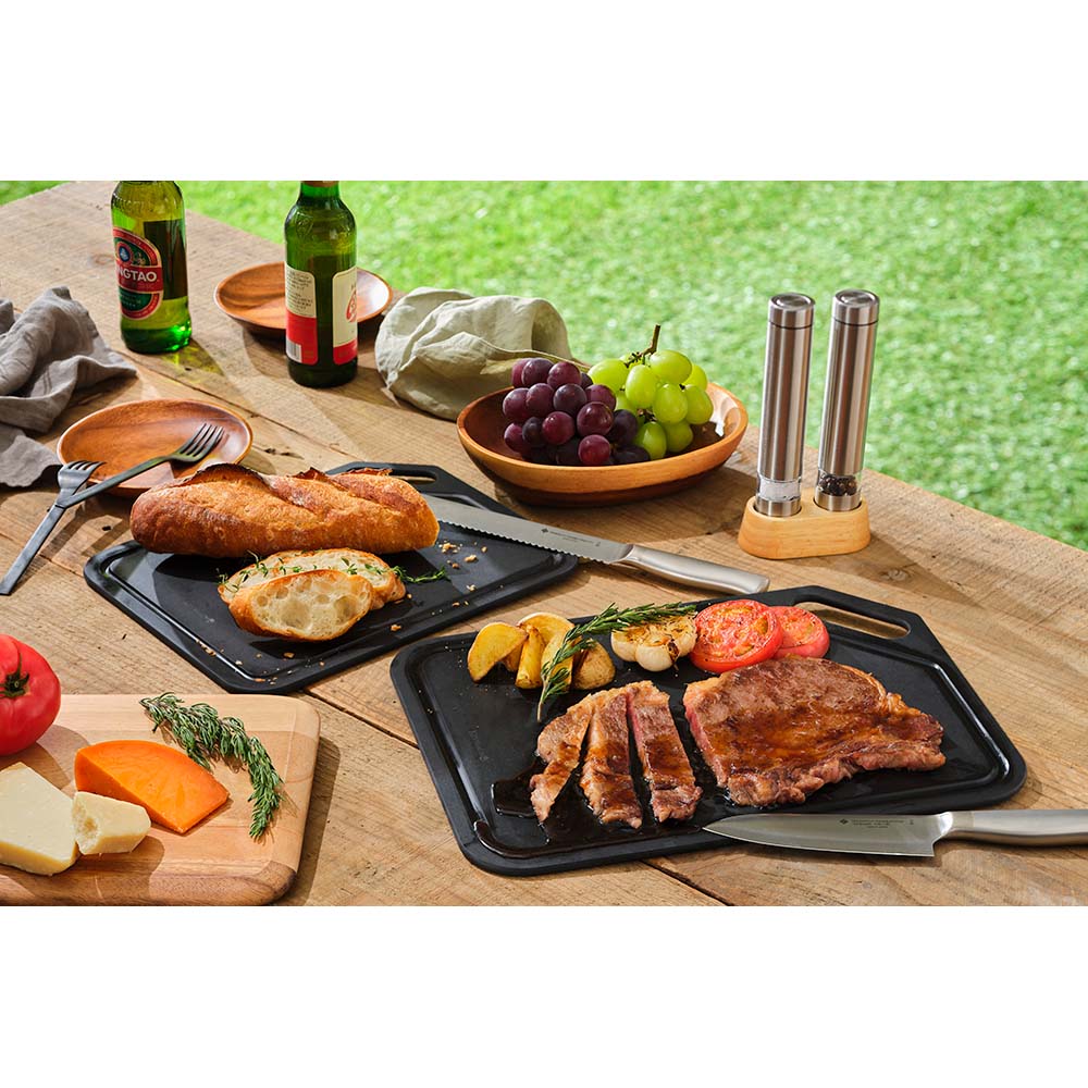 溝付きなので、パンくずや肉汁がこぼれにくく、テーブルを汚しにくい工夫も凝らされています。