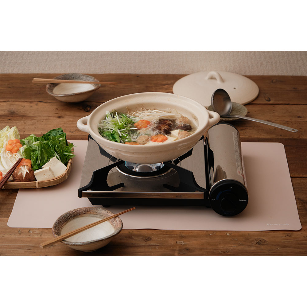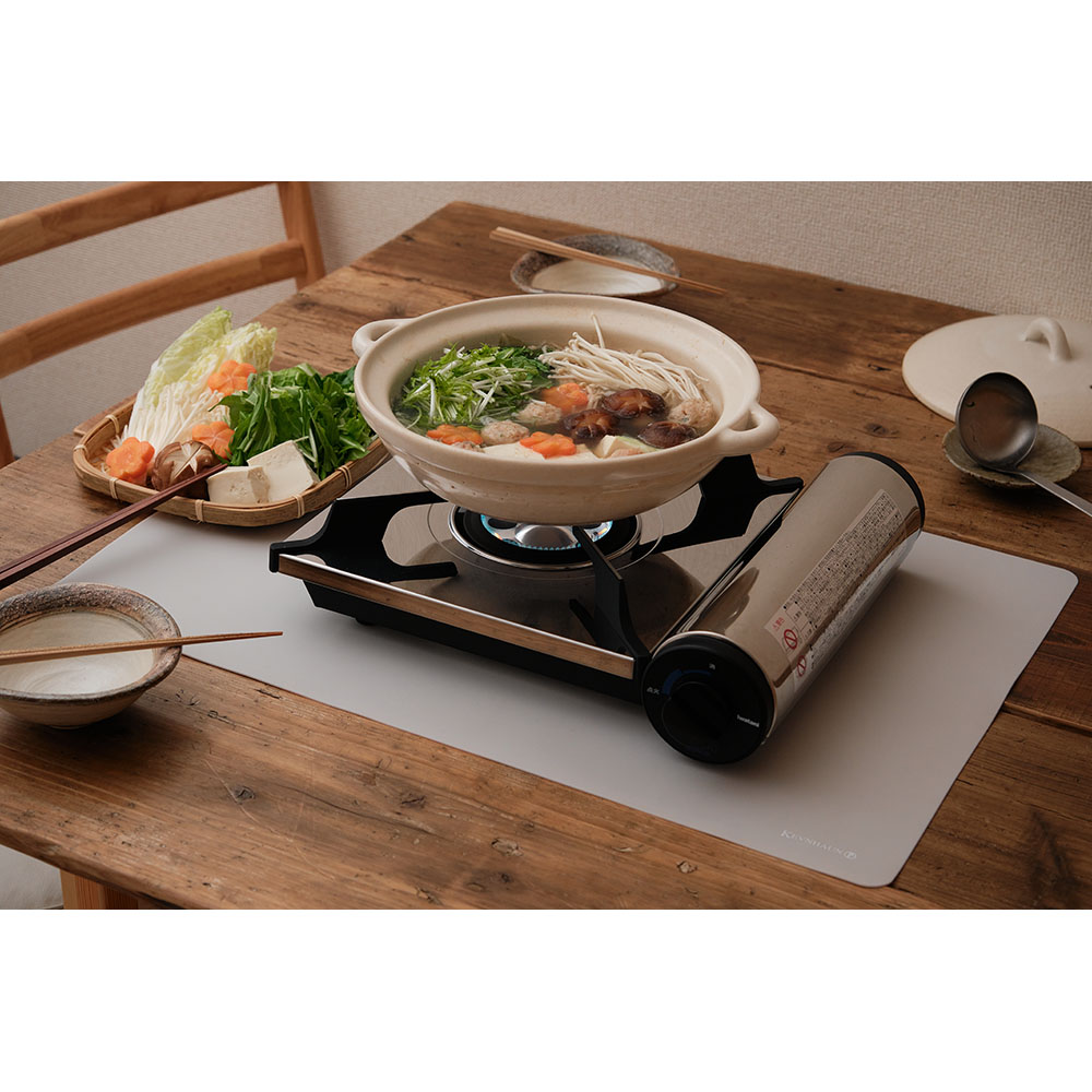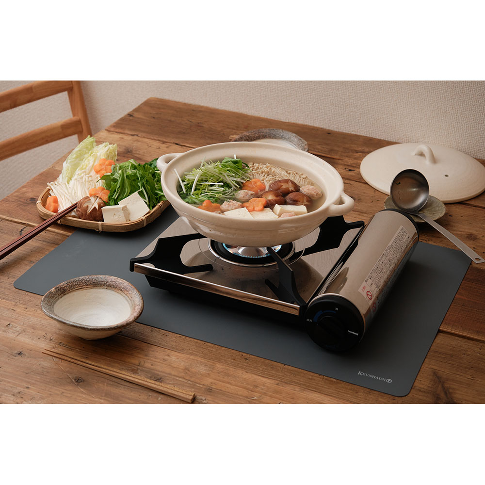 ホットプレートやカセットコンロ使用時の熱や油ハネ、タレの汚れからテーブルを守る60×40cmのシリコンマット。耐熱220℃で安心、お手入れ簡単&丸めて収納もOK。ディノス限定のシックなダークグレーで食卓の印象もワンランクアップ。テーブルを守る頼れる一枚カセットコンロやホットプレートを囲む楽しい食卓。でも、テーブルの熱や油ハネ、タレの飛び散りが気になることはありませんか?このシリコンマットなら、耐熱220℃の安心素材が、大切なテーブルをしっかりガードします。お手入れ簡単&オールシーズン活躍油やタレが飛んでも、サッと拭くだけのお手軽さ。さらに、大皿や鍋料理の汁もマットがキャッチ。年間を通してさまざまな料理シーンで活躍してくれます。使わない時も場所をとりませんこのマットは、くるくる丸めてコンパクトに収納が可能。便利な穴付きで、フックに掛けて乾かすこともOK。丸ごと水洗いできて、毎回清潔に使えます。食卓を引き立てる限定カラー落ち着いたダークグレーはディノスだけの限定色。どんなインテリアにもなじみ、ワンランク上のおしゃれな食卓を演出します。