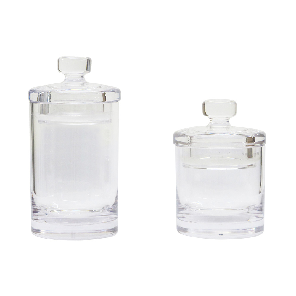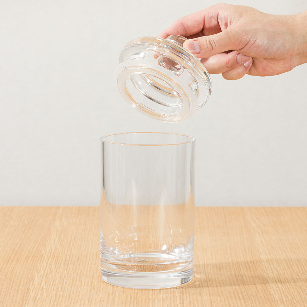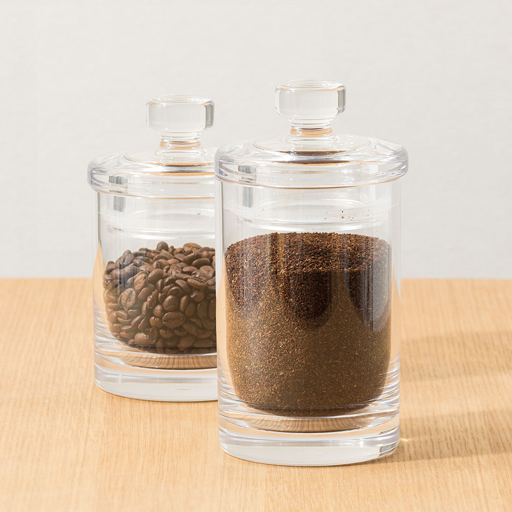 ガラスのような美しさなのに割れない樹脂製。小さいサイズが便利な密閉クリアキャニスター。ガラスのような透明度なのに割れない樹脂製キャニスターまるでガラスのようなクリアでキラキラとした見た目のキャニスター。衝撃に強いポリカーボネートという樹脂素材で作られているので、割れる心配なく使用できます。密閉ふた付きでちょっとした乾物の保存にコーヒー豆やティーパック、ペットフードなど少しだけ保管しておきたい乾物の保存に便利なサイズ。しっかりとした密閉ふたがついています。クリア素材で中身が見えるので、キッチンに出しっぱなしにしても可愛く映えます。小さな2サイズが便利本体高さ10cmのH10サイズ(ふた含む高さ15)、本体高さ15cmのH15サイズ(ふた含む高さ20cm)の2サイズ展開。少し小さくも感じるこのサイズが、ちょっとした保管にとても便利。