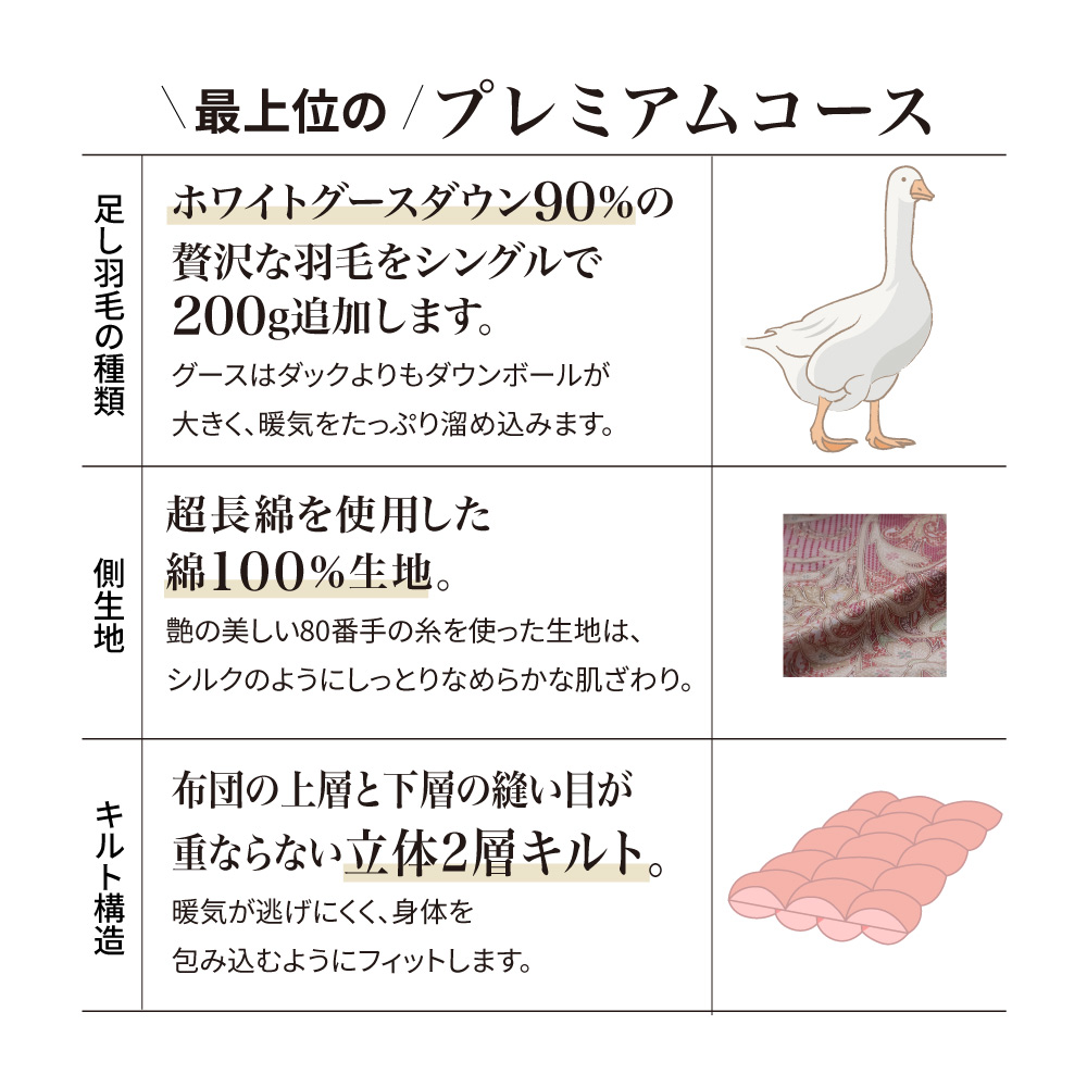 買い換えSTOP!羽毛布団フルリフォーム【全てが「ハイクラス」の贅沢プレミアムコース】中の羽毛を取り出し、徹底的にキレイにして、破れ・汚れ・ニオイ・ヘタリなど長年ご使用の羽毛布団に新たに羽毛を追加し、新しい側生地で縫製。ヘタった羽毛布団が新品同様のふっかふかによみがえります!素材・仕様・機能全てにおいて上質な羽毛布団に仕上がるよう、追加補充する足し羽毛には、ダックよりもダウンボールの大きいグースダウンを、側地には超長綿の中でも細くやわらかい80番手の高級生地を使用。贅沢な掛け心地をお求めの方に是非!【只今ご注文いただきますと年明け以降より順次お届けいたします】ご注文から1週間程度で布団の「回収キット」をお届けします。回収後リフォームにおよそ1か月程度のお時間をいただき、順次お届けとなります。只今ご注文いただきますと年末年始休暇を挟むため、リフォーム後のお布団は年明けから順次お届けとさせていただきます。予めご了承のうえ、ご注文ください。※システム上お届け予定に日にちが出ておりますが、こちらとは異なります。