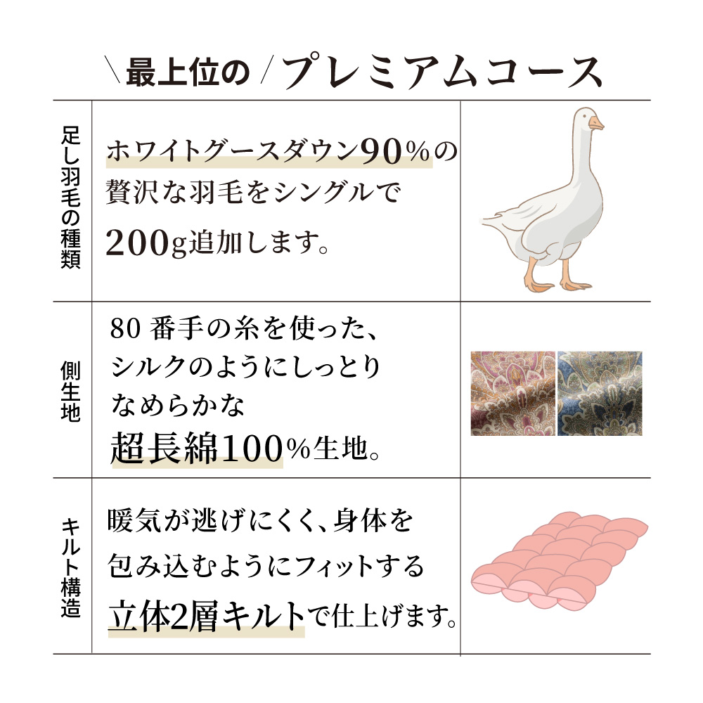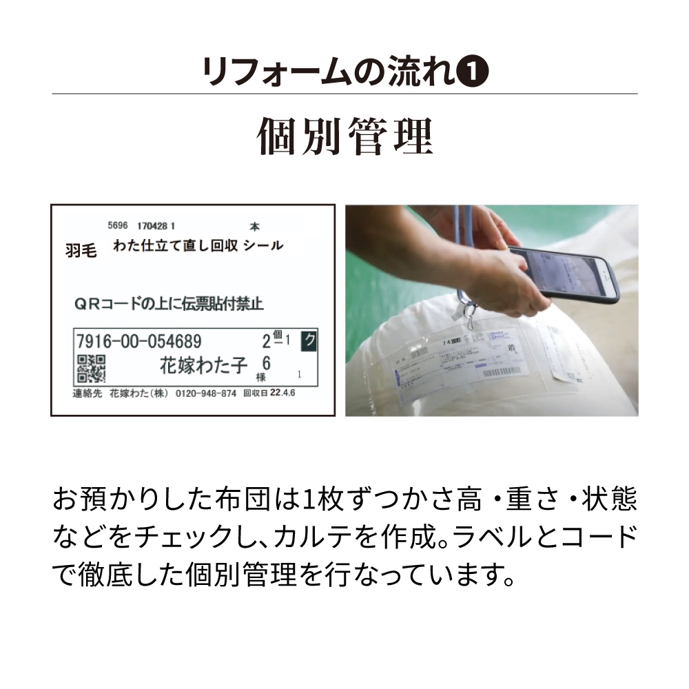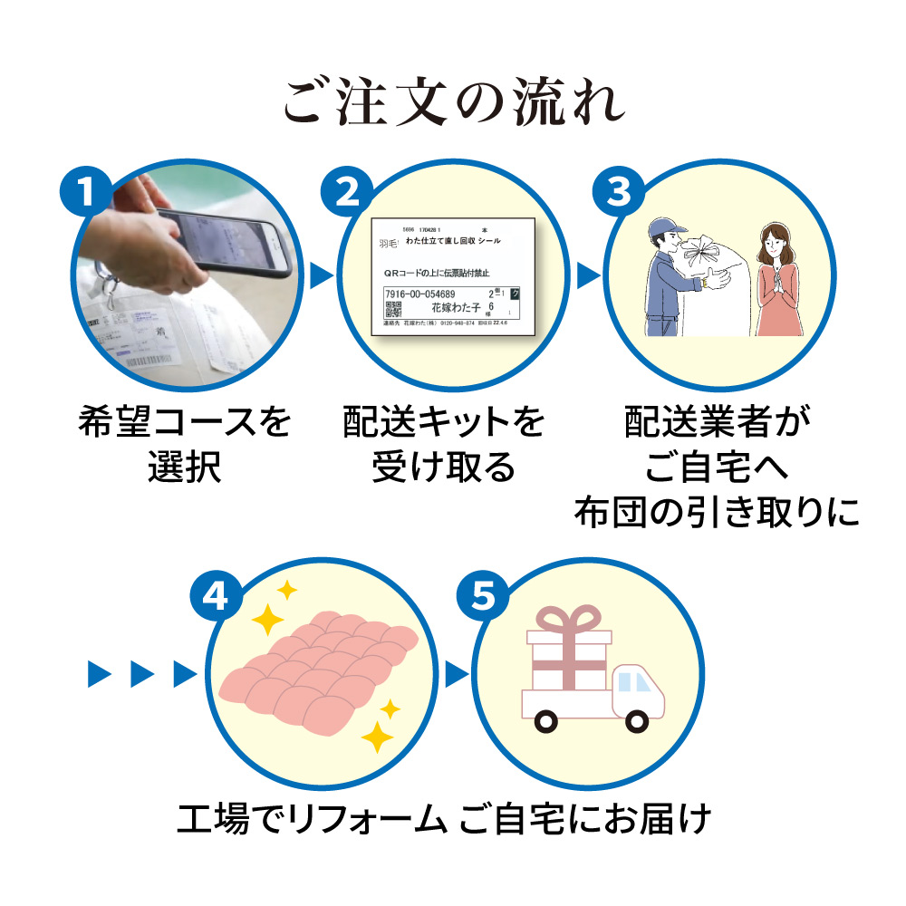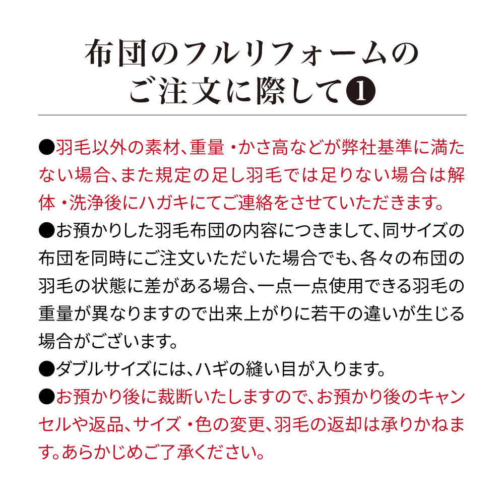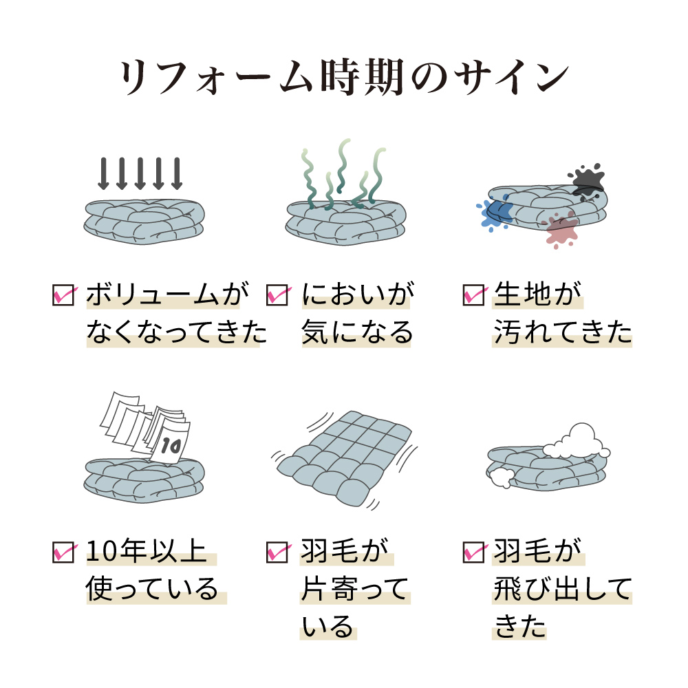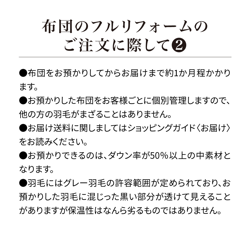 買い換えSTOP!羽毛布団フルリフォーム【全てが「ハイクラス」の贅沢プレミアムコース】中の羽毛を取り出し、徹底的にキレイにして、破れ・汚れ・ニオイ・ヘタリなど長年ご使用の羽毛布団に新たに羽毛を追加し、新しい側生地で縫製。ヘタった羽毛布団が新品同様のふっかふかによみがえります!素材・仕様・機能全てにおいて上質な羽毛布団に仕上がるよう、追加補充する足し羽毛には、ダックよりもダウンボールの大きいグースダウンを、側地には超長綿の中でも細くやわらかい80番手の高級生地を使用。贅沢な掛け心地をお求めの方に是非!リフォーム枚数14万枚突破!※2000年〜2025年12月の羽毛布団フルリフォームシリーズのディノス利用実績数。ご注文から1週間程度で布団の「回収キット」をお届けします。回収後リフォームにおよそ1か月程度のお時間をいただき、順次お届けとなります。※システム上お届け予定に日にちが出ておりますが、こちらとは異なりますので予めご了承ください。