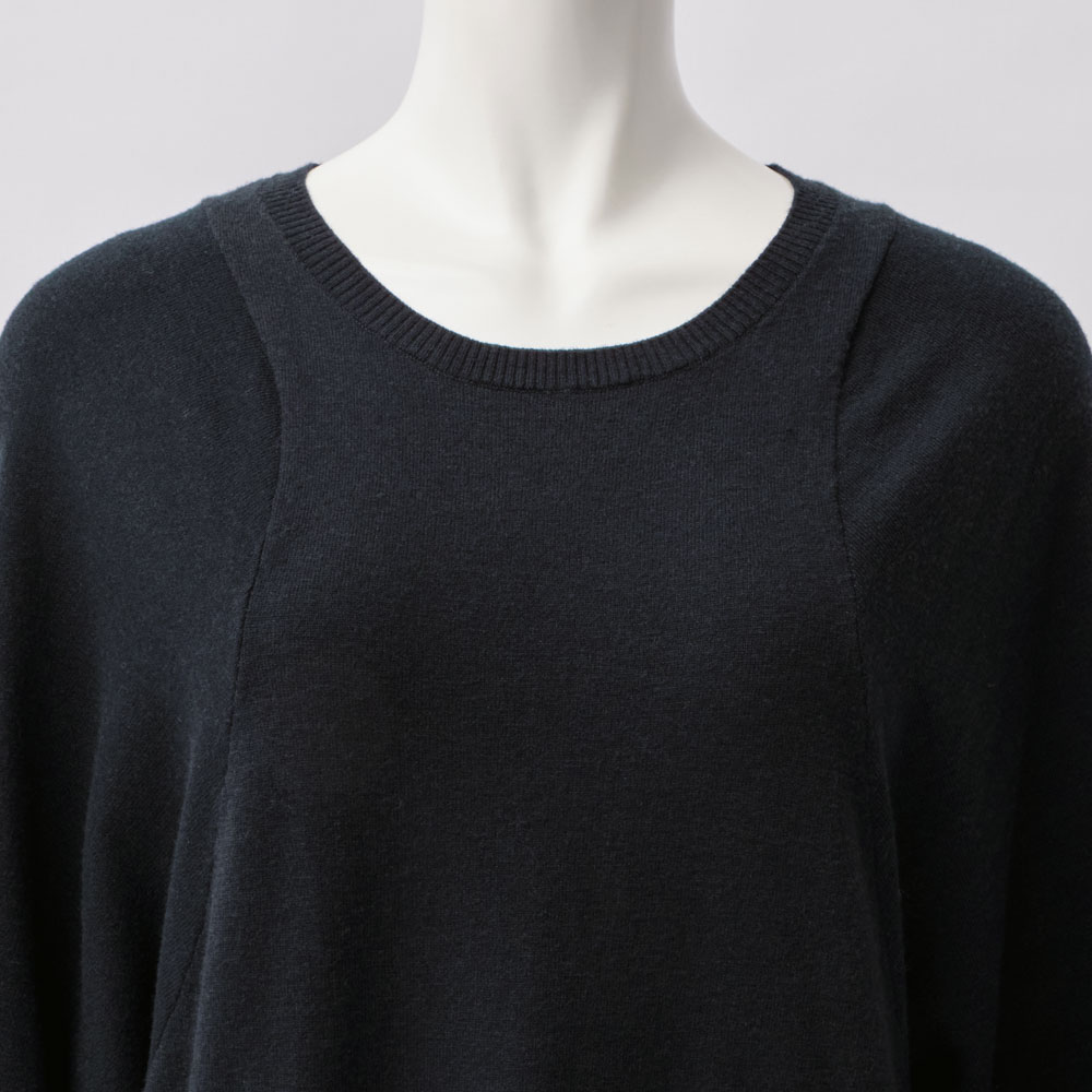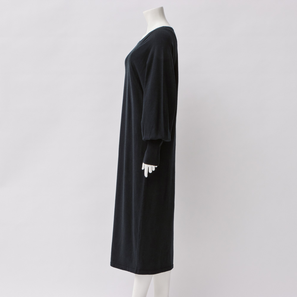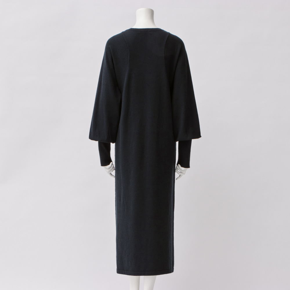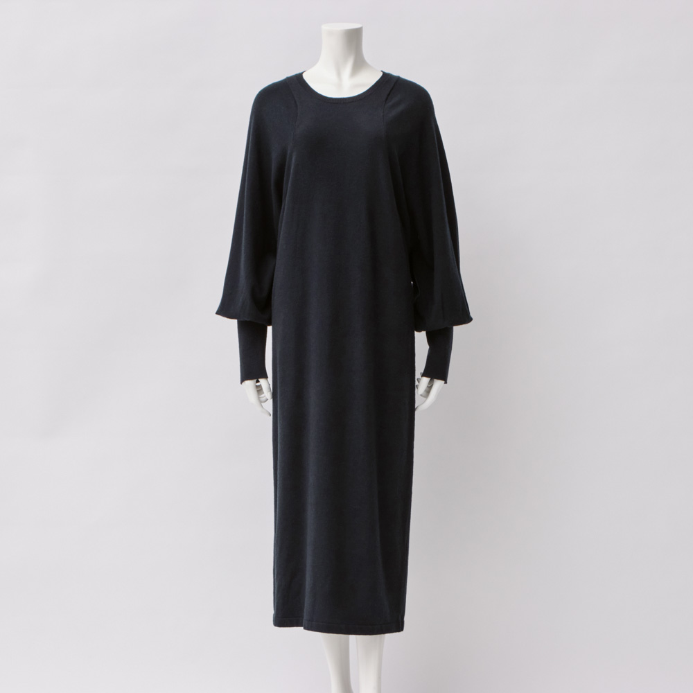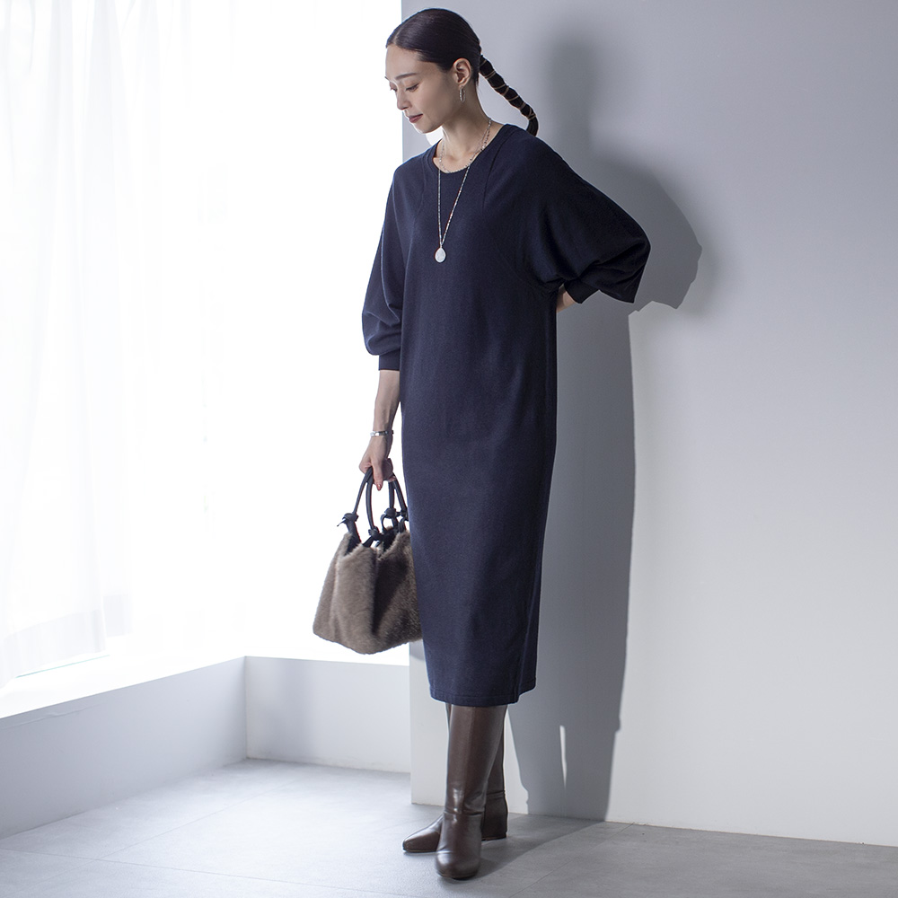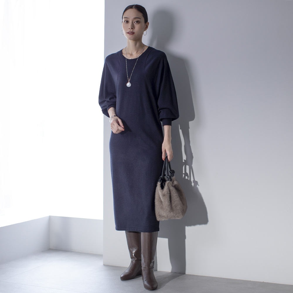 オフィスからカジュアルな日常まで、さまざまなシーンで活躍するニットワンピースは、長めのリブでデザインされた変形スリーブがポイント。袖をまくりブラウジングすると、簡単にニュアンスをプラスできます。リブのクルーネックで首元はすっきりと、身頃はストレートシルエットで身体のラインを拾いにくく、スタイルアップを叶えます。