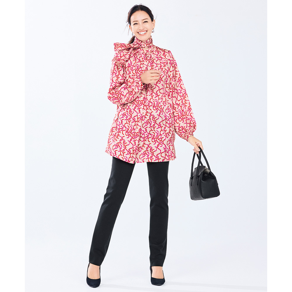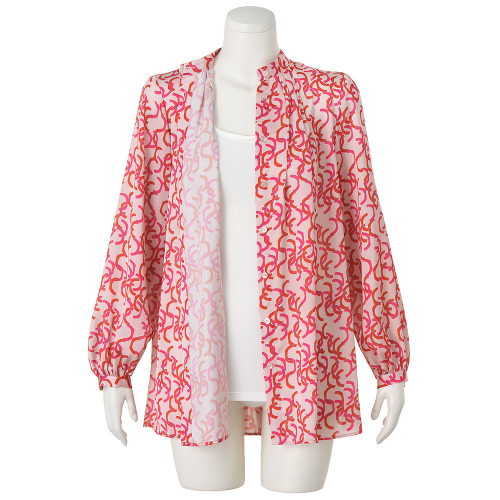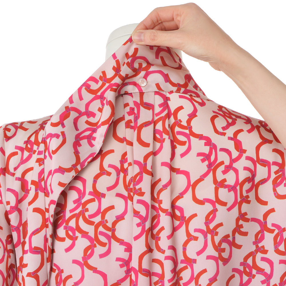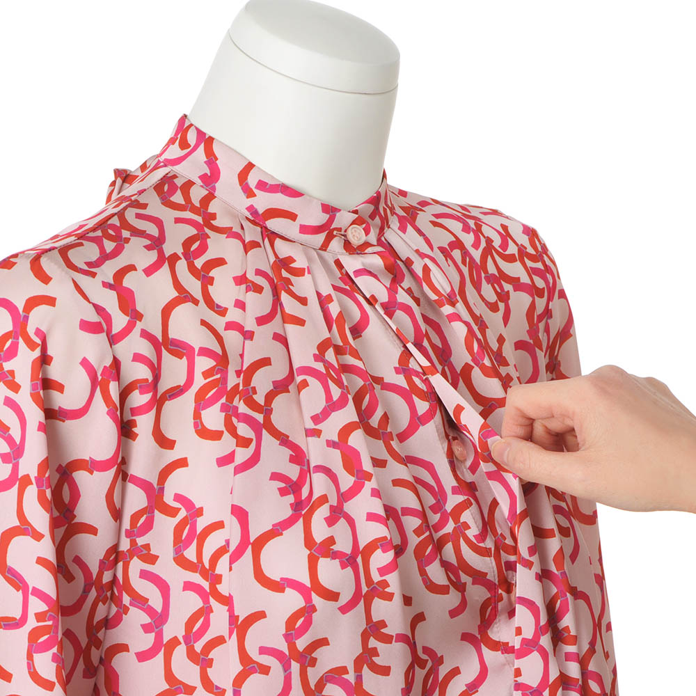 Tunic SPRING Style春のスタイルアップは、きれい見えチュニックにお任せ楽しい予定が目白押しの季節、纏うだけで旬の着こなしが完成するチュニックの出番です。フレンチエレガンスが薫る華やいだプリントを纏って春の装いに華やかさを与えてくれるボウタイチュニックを、麗しのフランス製プリントで。マテリアルはドレープが美しく、滑らかさと光沢感が艶やかなサテン生地。ピンクとレッドのリボンテープが舞うような柄は、微配色で複雑な奥行きを表現しています。気分も顔色も華やぐ色使いながら、モダニズム溢れる柄行きは甘さを程良くセーブ。パフスリーブ、襟元と背中心に入れたタックも柄行きに躍動感をもたらします。ボウタイは後ろ襟中心のボタンで取り外しができる嬉しい仕様。ある日は気高く優美に、別の日はボウタイなしでスマートに、と違う印象を楽しめます。