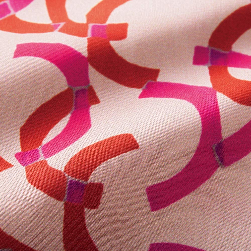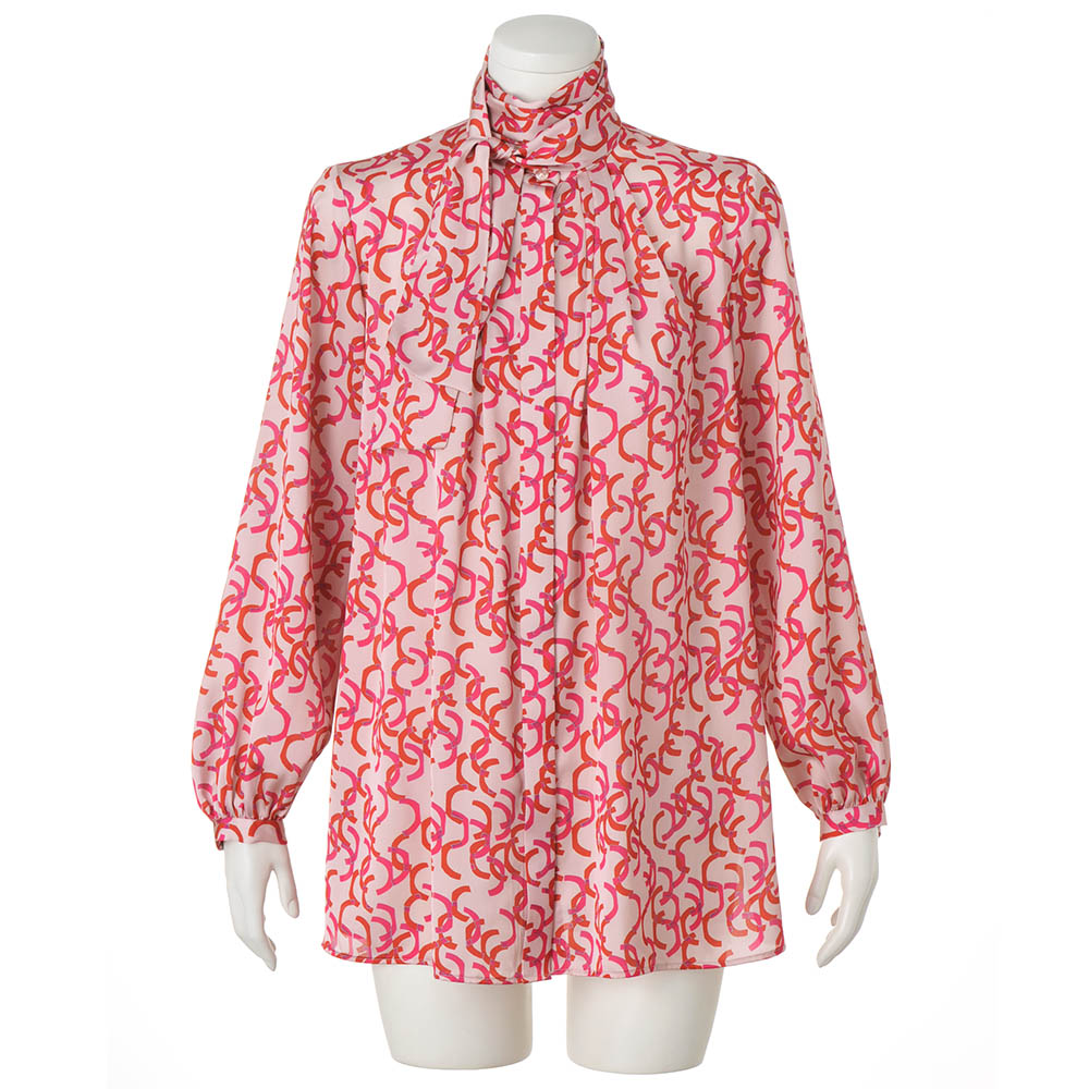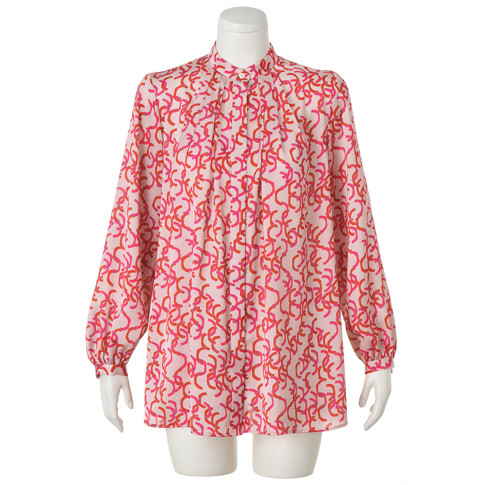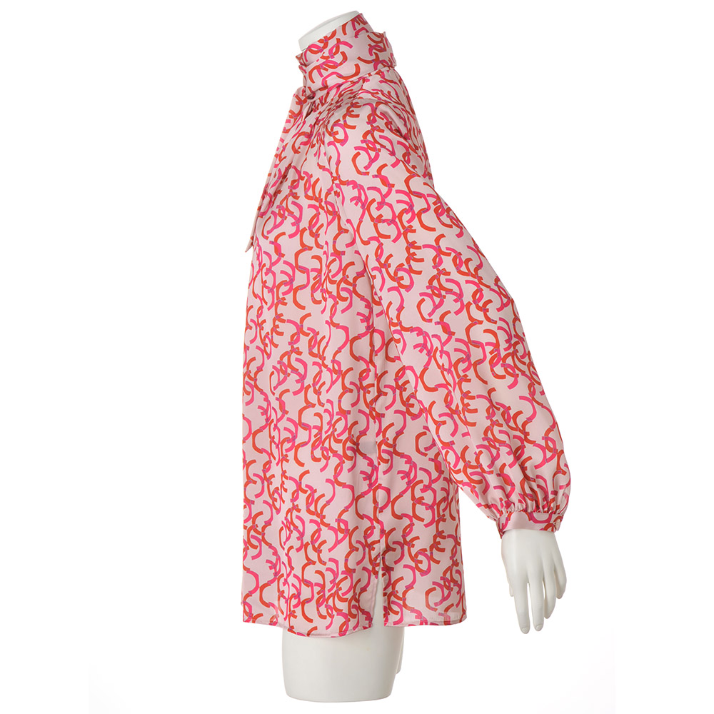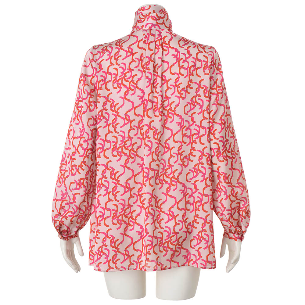 Tunic SPRING Style春のスタイルアップは、きれい見えチュニックにお任せ楽しい予定が目白押しの季節、纏うだけで旬の着こなしが完成するチュニックの出番です。フレンチエレガンスが薫る華やいだプリントを纏って春の装いに華やかさを与えてくれるボウタイチュニックを、麗しのフランス製プリントで。マテリアルはドレープが美しく、滑らかさと光沢感が艶やかなサテン生地。ピンクとレッドのリボンテープが舞うような柄は、微配色で複雑な奥行きを表現しています。気分も顔色も華やぐ色使いながら、モダニズム溢れる柄行きは甘さを程良くセーブ。パフスリーブ、襟元と背中心に入れたタックも柄行きに躍動感をもたらします。ボウタイは後ろ襟中心のボタンで取り外しができる嬉しい仕様。ある日は気高く優美に、別の日はボウタイなしでスマートに、と違う印象を楽しめます。