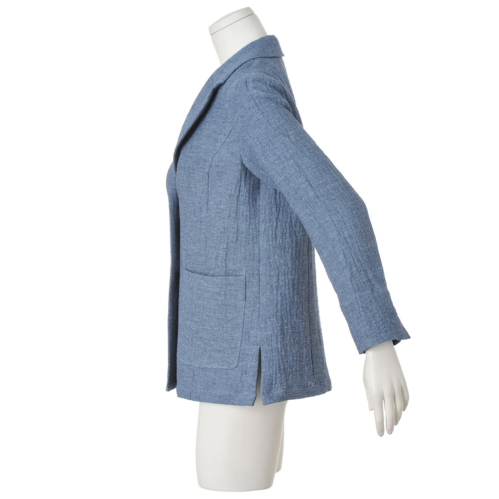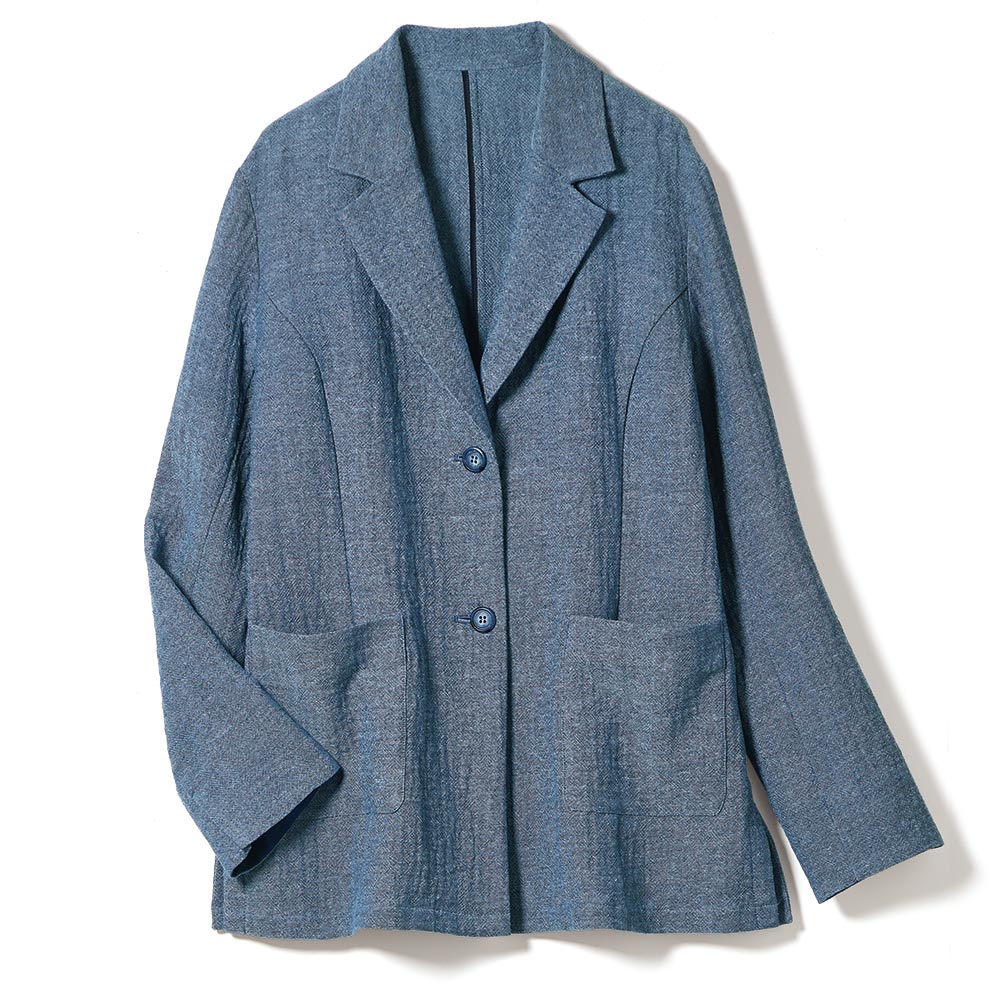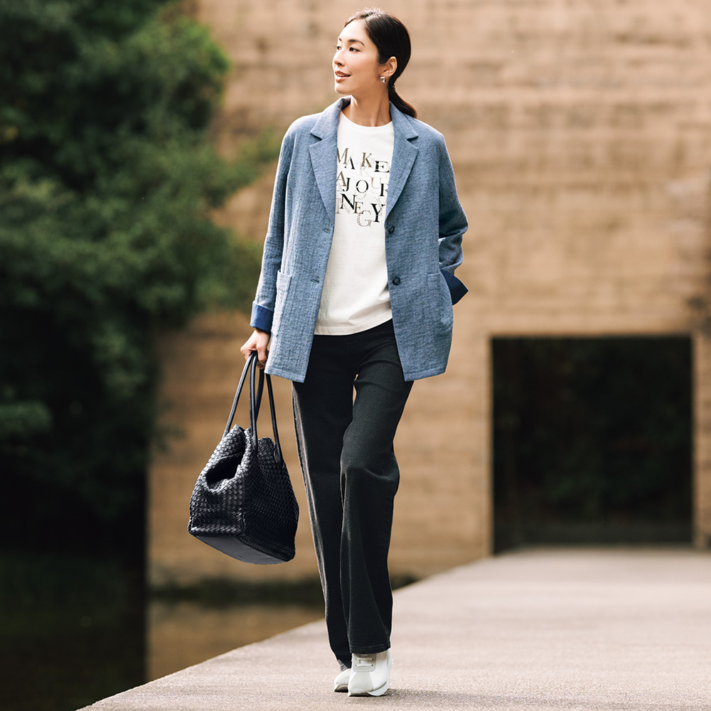 洗練を纏い、週末のエスケープへ日々の喧騒を離れて向かうショートトリップ。自然やアートで感性を刺激する旅のお洒落は、リラックス感がありながらも洗練された落ち着きが欲しいもの。着心地と品の良さを両立した、感度の高い旅カジュアルをご提案。ラグジュアリーな旅にふさわしい品格とこなれた風合いを両立するなら、こんなジャケットスタイルで。セレクトしたのは表面のシボ感が爽やかな着心地を叶える、デニム調のイタリア製リネンブレンド生地。リネン混であってもシワになりづらく、持ち運びにも便利な優れものです。裏地や肩パッドなどは潔くなくし、両脇裾にはスリットを入れたことでカーディガン感覚で軽く羽織ることができます。≫ POINT大きめのパッチポケットがなるべく身軽でいたい旅の利便性をアップ。袖口はベント入りで折り返しも可能。