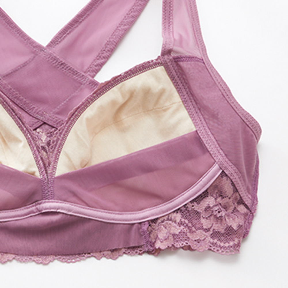肩甲骨がギュッと寄る感覚がスゴい!美姿勢に導くノンワイヤーブラノンワイヤーでストレスなく美姿勢に。姿勢が美しい人って、実年齢よりもずっと若く見えますよね?背中クロスで肩甲骨をキュッと引き寄せる美姿勢ブラが今のイチ推しです。「補整インナー」の着心地が、近年驚くほど良くなっていることをご存知でしょうか。カップにはワイヤーを使わずパワーネットで補強してバストを整え、肌に食い込みにくいハイストレッチレースを多用しているこちらのブラは、とにかく着心地がラク。クロスした幅広ストラップが肩甲骨周りを背の中央に引き寄せるから、前胸がぐ〜っと開いて背筋の伸びた姿勢をキープできます。商品Point■ノンワイヤー&ノンフックで着心地ラク■光沢感のあるレース仕様で気分も上がるデザイン■幅広の肩紐だから食い込みにくい■下からはけばカンタンにバストメイク