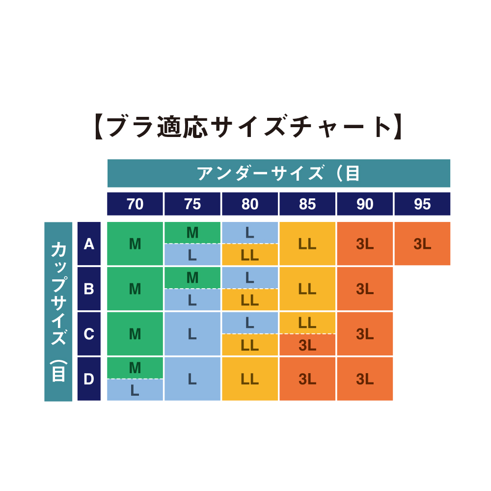 ※あくまでブラのサイズ目安になります。サイズ選びに迷われた場合は1つ大きいサイズをおすすめします。