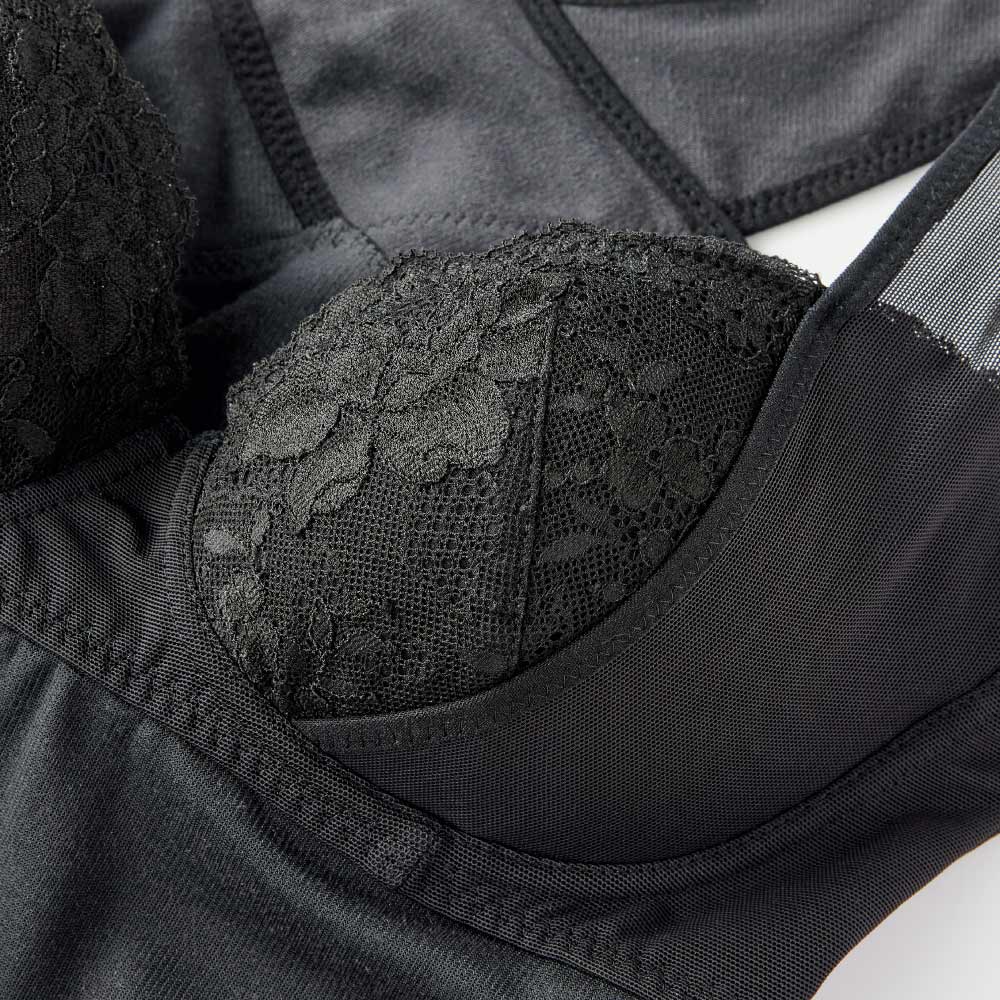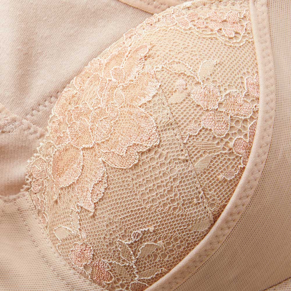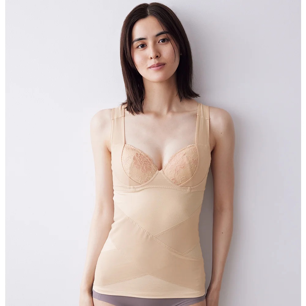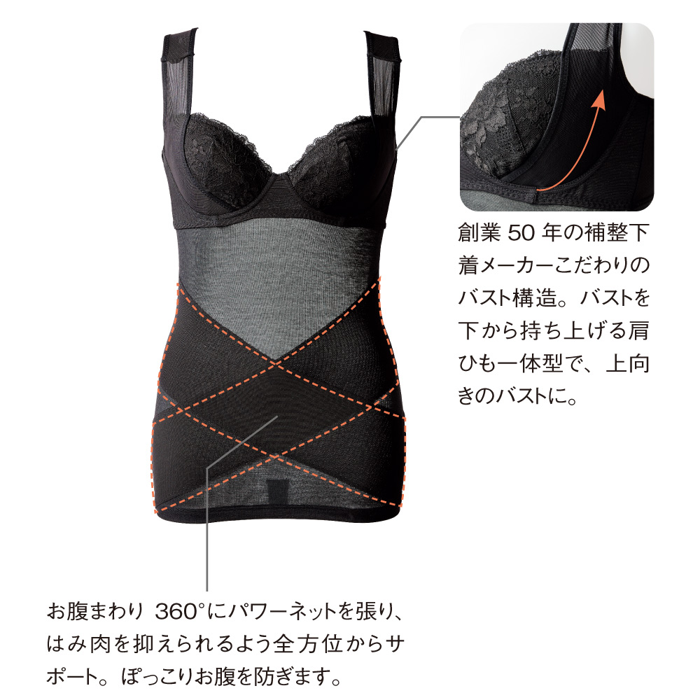 創業50年の補整下着メーカーが手がけているから、バスト構造にもこだわりが。バストを下から持ち上げる肩ひも一体型で、上向きのバストに。