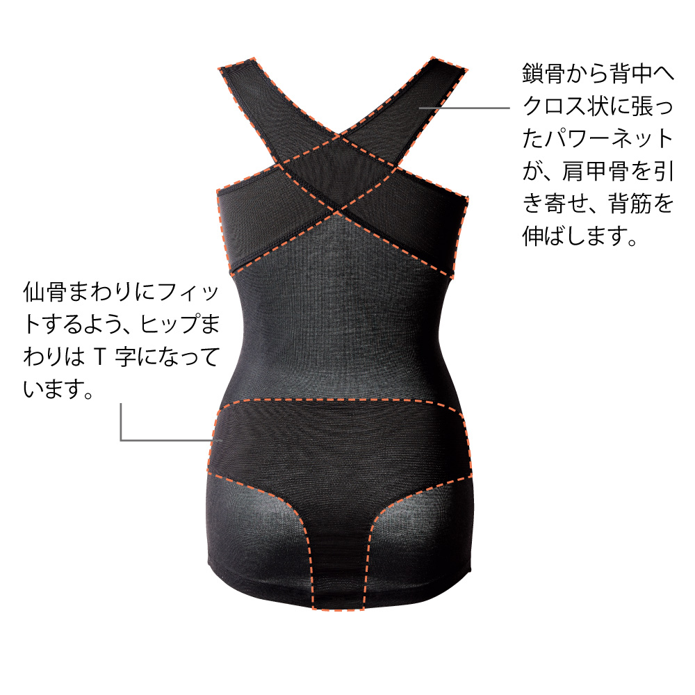 (イ)ブラック 背面には肩甲骨と仙骨をサポートするパワーネットを配置。
