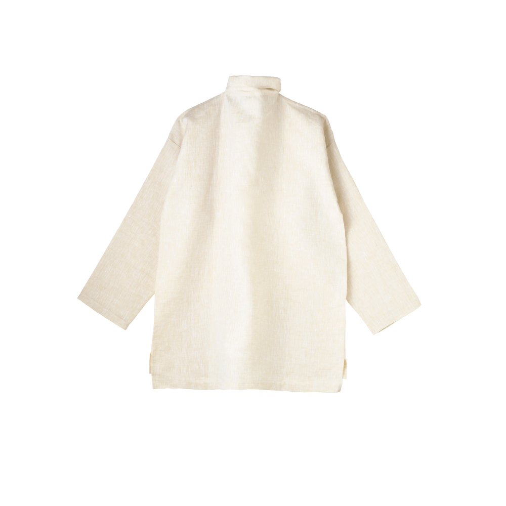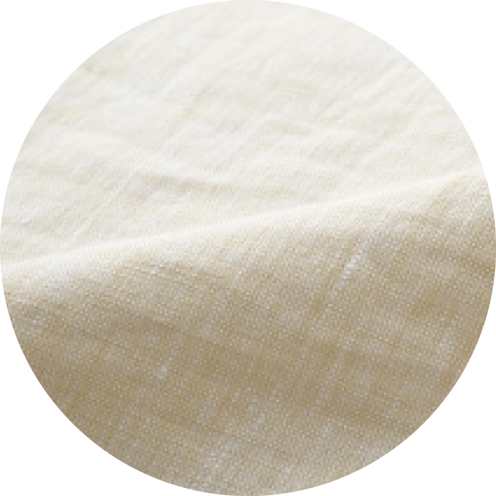 (ア)生成り 麻100%素材はドライタッチで、サラッとした着心地。使い込むほど柔らかくなる風合いも魅力でオールシーズン快適に着用できます。