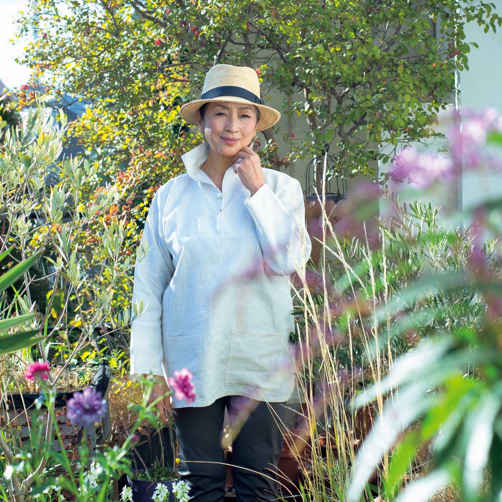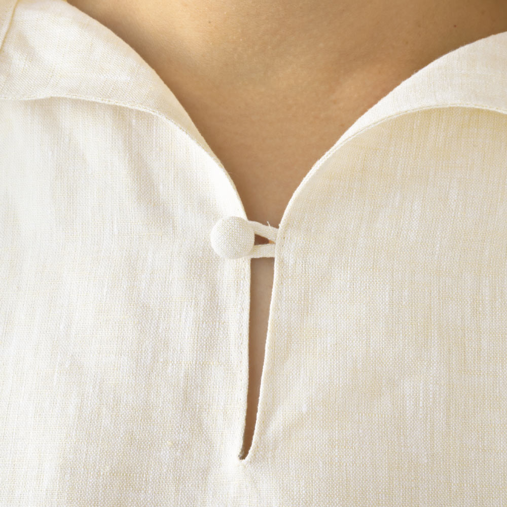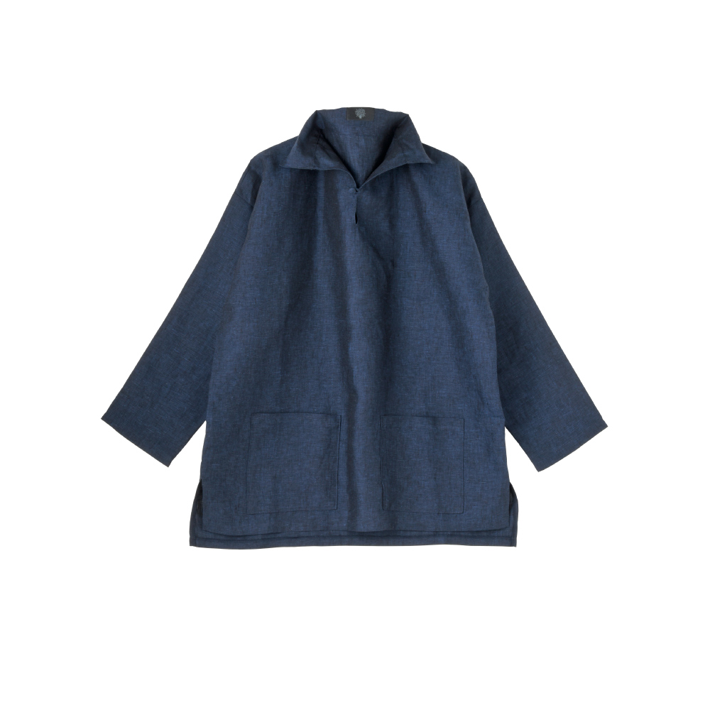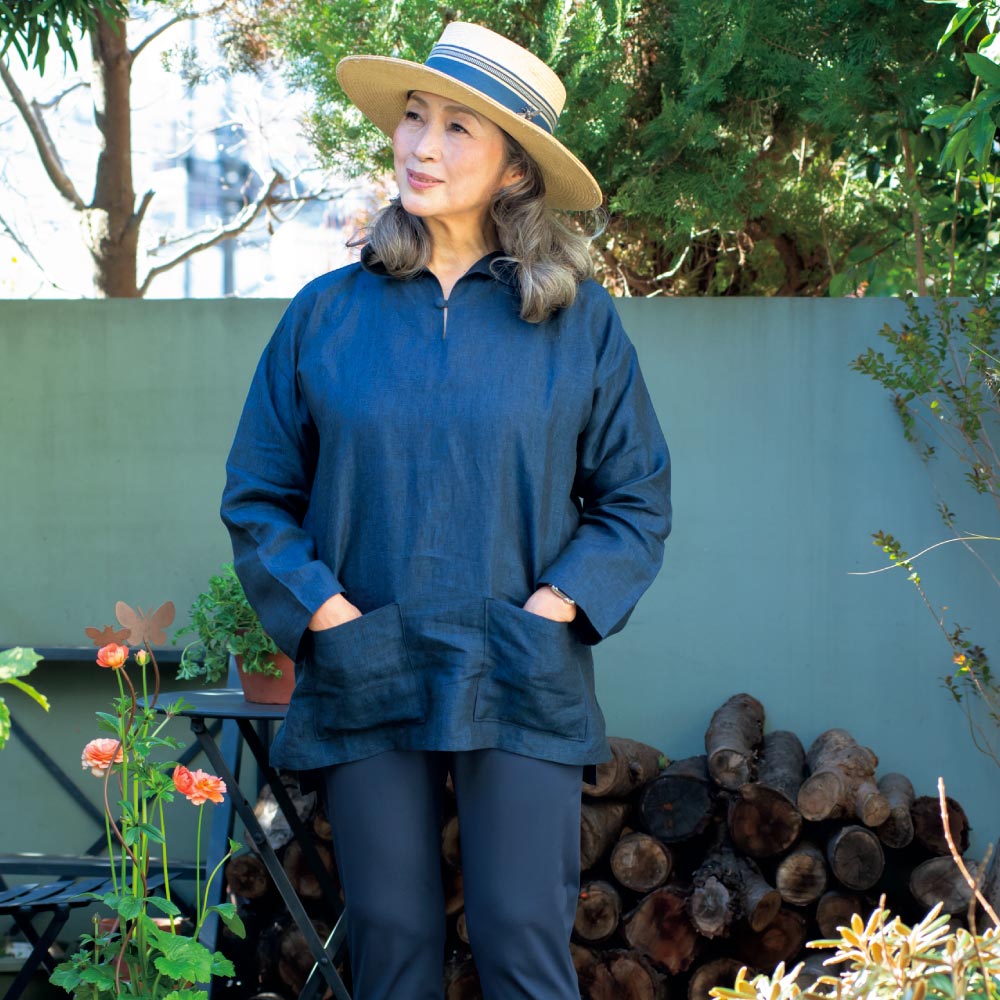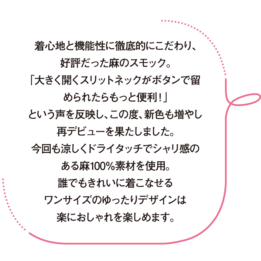 テクニックいらずで決まる!着る人を引き立てる麻スモック人気の麻のスモックが、涼やかな着心地、前ポケットなどの機能性はそのままに胸元が大きく開かないようループを取り付け、くるみ釦で留められるよう改善して再登場。「サッと上から被って着ることができ、一枚でスタイリッシュに決まるから便利。着こなしはネイビー×ネイビー、生成り×ライトグレーのワントーンコーディネートがおススメです」。