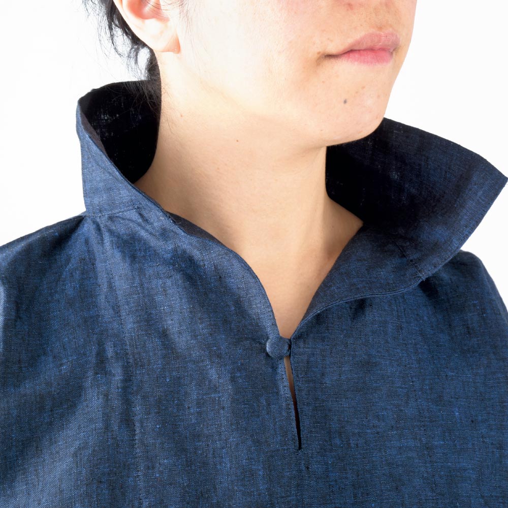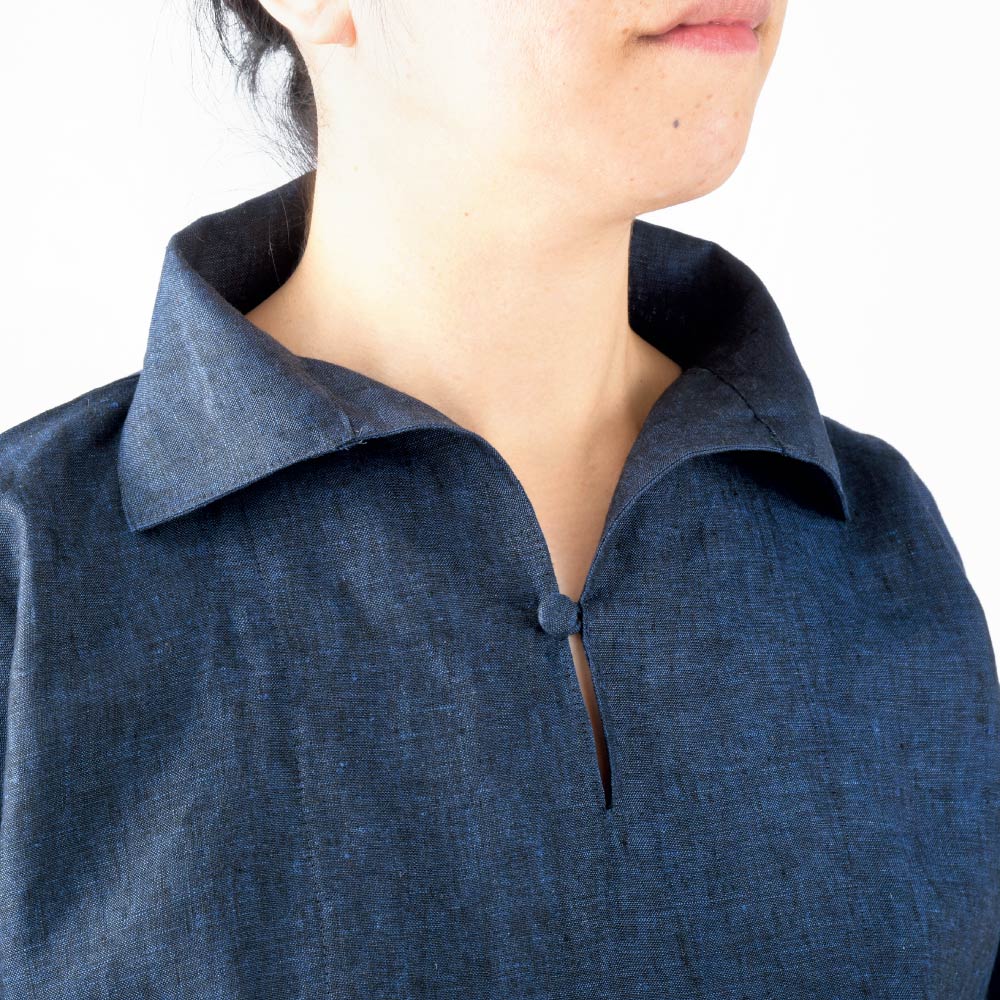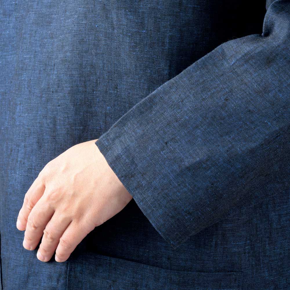(イ)ネイビー 麻100%素材はドライタッチで、サラッとした着心地。使い込むほど柔らかくなる風合いも魅力でオールシーズン快適に着用できます。
