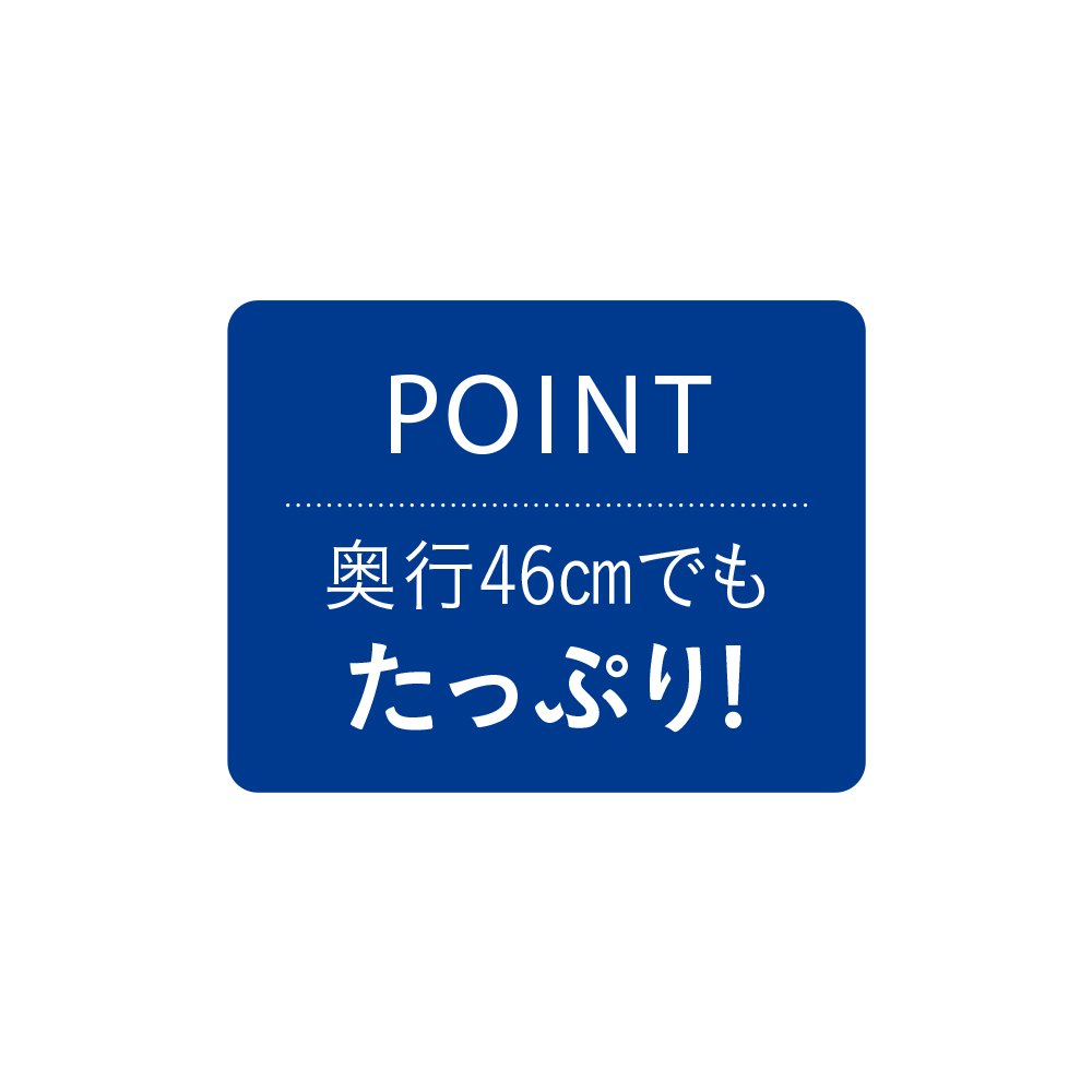 奥行46cmなので、狭いベランダにもOK!しかも布団2枚を通気性よく並べて干せます。室内のわずかなスペースにも置けるので、布団を畳まず掛けておく使い方も。 ※写真は伸縮レギュラータイプです。