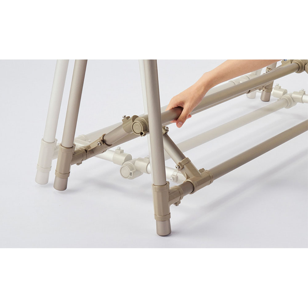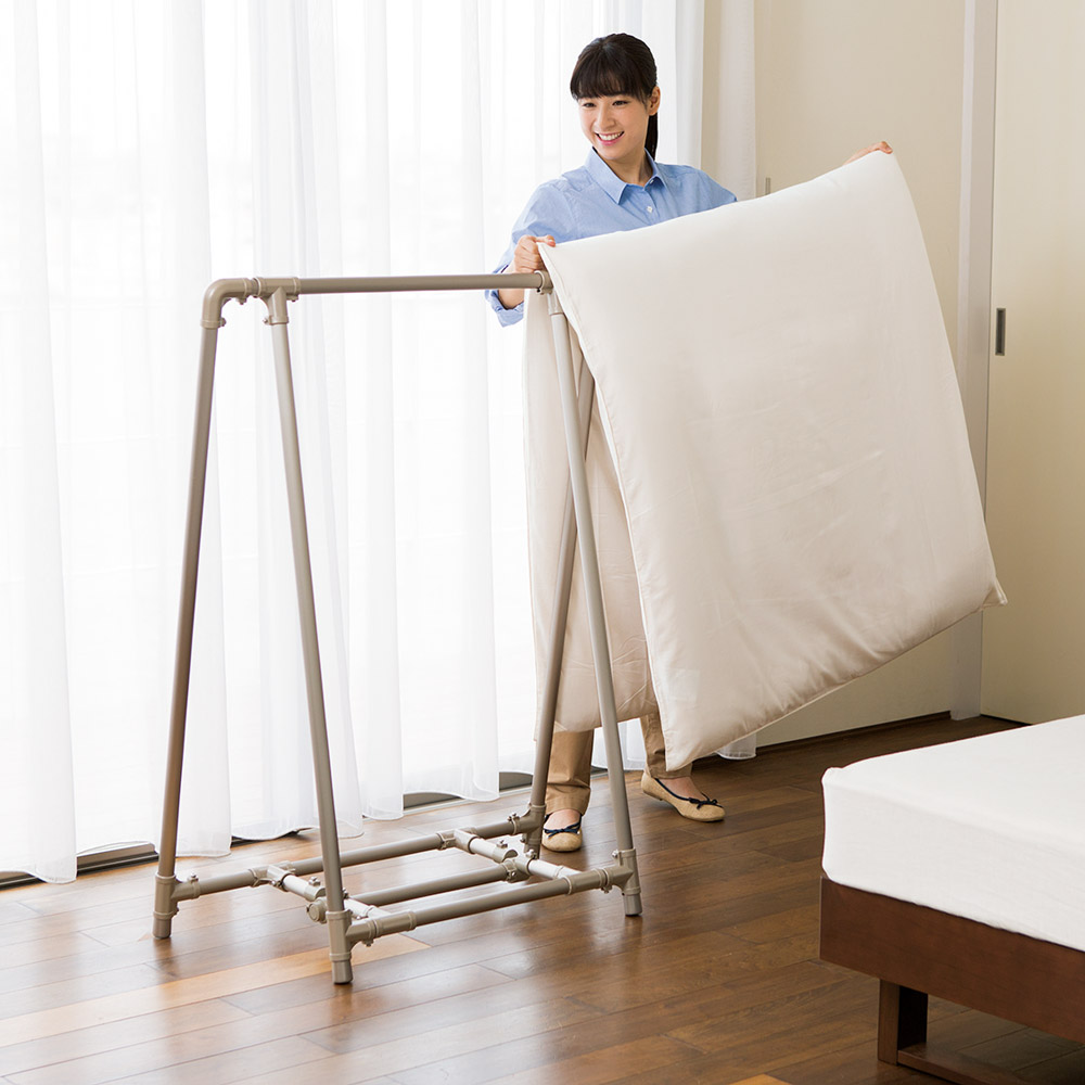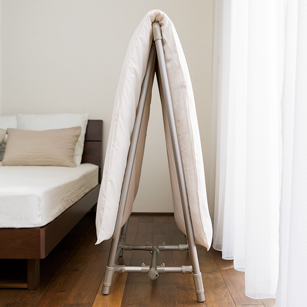 コンパクトタイプは寝室に置いて毎日干しながら収納できます。A型なので通気がよく軽量なアルミ製で持ち運びも楽。