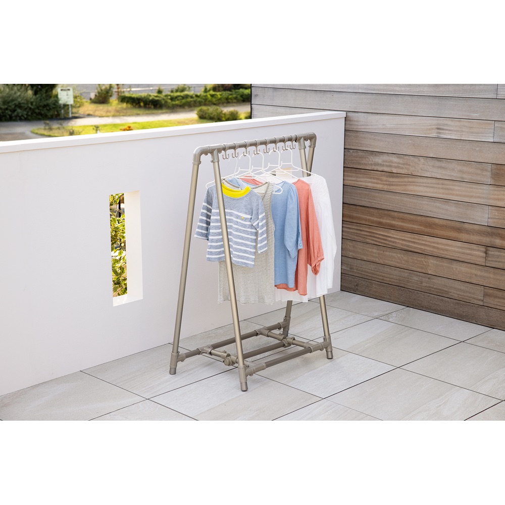 奥行きが狭くても、洗濯物や布団がラクに干せる実力派。マンションでも布団が干せる!たっぷり干せる便利な伸縮タイプと、部屋干しに便利なコンパクトタイプの2サイズをご用意しました。使わないときの収納方法も、より簡単に!狭いベランダや屋内にも設置できる、奥行わずか46cmのA型物干し。ハンガー用のフックも10個付いているので干しやすく便利です。布団は横からスライドさせて干すことができ女性でもラクチン!約3kgと軽くて丈夫なアルミ製で持ち運びも簡単。使わないときはワンタッチで折り畳み可能です。マンションでも布団が干せる!たっぷり干せる便利なA型物干しです。『最近のマンションには、布団を干すことのできる設備がない』という声から生まれました。横からスライドさせて干すことにより楽に干せます。高さも約119cmと低めの設定。使わないときの収納も、簡単にたためて軽いのが特徴。わずか7cmの厚みにたためて重さも3.2kgは魅力です。シングル布団にぴったりな幅89cmのコンパクトタイプのお届けです。(1)ご要望の多かった「物干しを開閉する際、中央のバーがもっと操作しやすいといいのに…」というお客様の声に応え、より開閉しやすいように改良設計致しました!(中央バーの仕様を改良)(2)衣類を干す際に便利な専用フックを10個付属しました!○A型物干しの基本の特徴(1)布団が干しやすい、乾燥しやすい。・女性や高齢者にも干しやすいように、高さ約120cmの設計。・A型の特性として、干している布団の面と面の間に空間ができる=通気性が良いです。室内でも効果的に布団が乾燥します。(2)コンパクト、軽量・奥行約46cmと場所をとらないので狭いベランダや室内でも使いやすいのが特徴。・室内干しにもおすすめ。雨の日に限らず花粉、黄砂、PM2.5など外に布団を干せないときにもお部屋で干せるコンパクトサイズです。・脚部中央のバーを持ち上げるだけで簡単にたためて、重さも約3kgと片手で運べる軽量設計。移動も楽々です。(3)デザイン、素材・アルミ製なので軽く、錆びにくいのが特徴。屋外でも安心してご使用いただけます。・人気のシャンパンゴールド色。インテリアにもなじみ、外に出してもおしゃれです。※こちらはコンパクトタイプのお届けです。