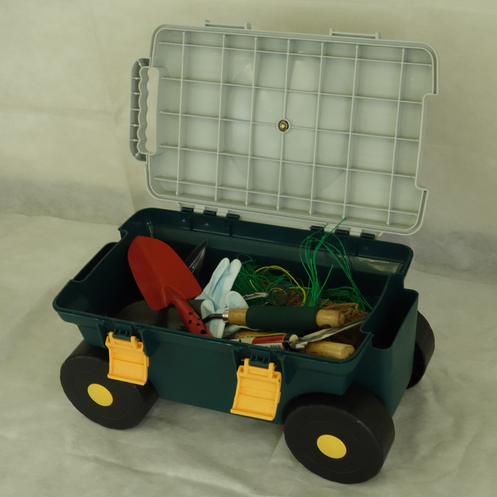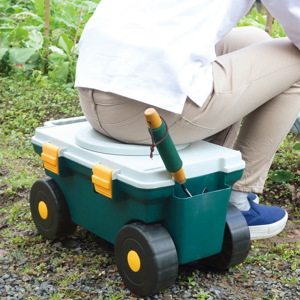 キャスター付きで、作業しながらそのまま移動できる回転いす。座面も回転するので、座ったままでの作業も便利。ガーデニングや、車のお手入れ、ガレージ作業に。■キャスター付きで移動も作業も楽!座ったまま移動できる作業チェア。太めのタイヤで、庭作業にも。■フタを開ければたっぷり収納!肥料や簡単な小物を入れておける収納スペースも。作業に必要なグッズが入れられて便利です。■両サイドの収納ポケット付きで、ツールの収納も簡単スコップや剪定はさみなどを入れておける収納ポケットが両側に。