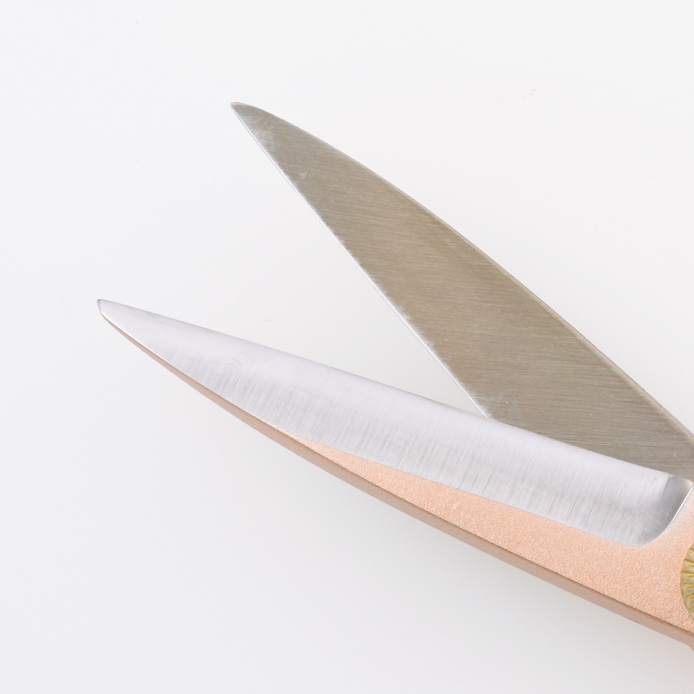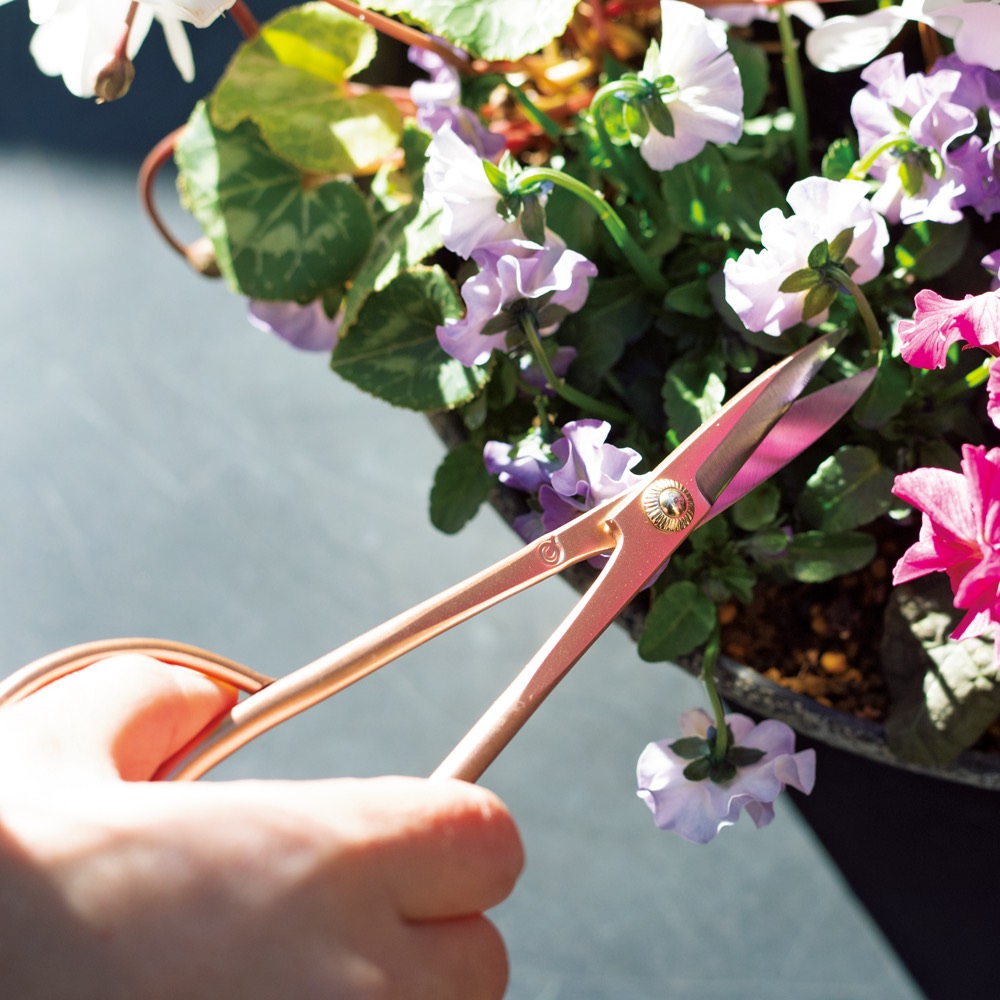 【吉谷先生企画商品】花がら摘みや剪定などの細かな作業時に使いやすい職人技が光る園芸鋏。吉谷さんのおすすめシャンパンピンク色が素敵。柄が長く刃先が細い、機能的でスタイリッシュな園芸鋏。刃には特殊な熱処理で強度を高める加工を施しました。「シャンパンピンクは庭の中に置いても目に留まって探しやすいですし、明るい気分で庭仕事に励めます。スパッと切れるから作業もはかどりますね」。自慢したくなる一品です。新潟県三条市にある諏訪田製作所は盆栽・園芸用鋏のブランドとして世界中の園芸愛好家から高く評価されています。今回のモデルは諏訪田製作所が企画し、三条内の工場でひとつひとつ職人が仕上げています。使いやすいサイズ感で手も疲れにくい!「このハサミは刃先が細く切れ味もいいので茂った株間にもスッと入り、枝葉を痛めることなくカットできるので重宝しています。花がら摘みや芽摘みなどの細かな手入れも苦にならない所に職人技を感じます。