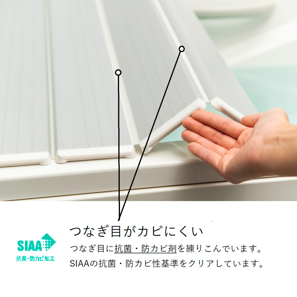 いつも清潔、お手入れ簡単!SIAA(抗菌製品技術協議会)の安全性と抗菌・防カビ性の基準をクリア!気になるヌメリも抑制。小さく畳めてお風呂を広々使えます。抗菌・防カビの機能を備え、お手入れラクラク!JIS/ISO抗菌試験で、SIAA(抗菌製品技術協議会)が定めた基準をクリア。細菌の増殖を抑制し、長期に亘って菌を増やさないようにする「抗菌」仕様。さらに「防カビ」も備え、お風呂を清潔に使えます。イヤなぬめりが付きにくく、お手入れも簡単です。小さく畳めてお風呂を広々使える!入浴時も浴槽脇にスリムにおける折り畳み式。圧迫感がなく、広々と入浴できると人気の形状です。縁にはくぼみがあり、持ち上げやすく、折り畳みやすさにもこだわりました。面が平らでお掃除しやすいのも嬉しいポイントです。安心の日本製日本の風呂蓋を長年つくりつづけているメーカーで、丁寧に仕上げます。