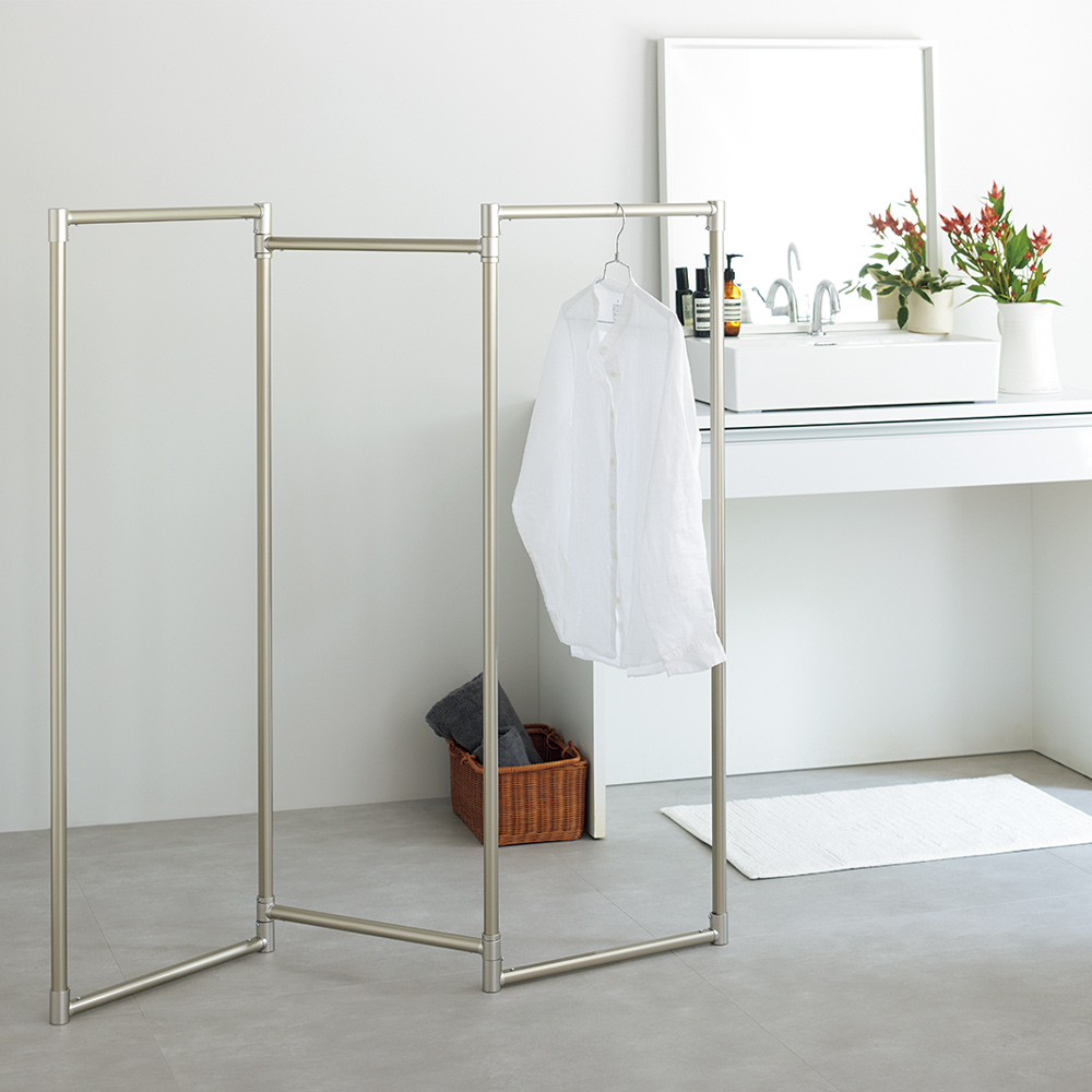 人気シリーズがさらに改良となりました!!結合部分もメッキ加工となり、オブジェのようにスマートでスタイリッシュ!。インテリアに映えるアルミ物干し。出しっぱなしで美しいので、バッグやコートをかけるハンガーとしても便利です!シンプルなアルミ製で、驚くほど軽量なスタイリッシュ物干しがリニューアル。継ぎ目部分の樹脂がメッキ塗装に変わり、より美しく高級感のあるデザインに!洗濯物に合わせて屏風のように広げたり、コの字型や三角形にできたりと、室内でも生活感なく、おしゃれに干せます!コンパクトな3連は、脱衣所や玄関など狭い空間に。ハイタイプは高さ約150cmで丈の長いワンピースにも対応。竿付きは、シーツを干す時にも活躍します。高級感のあるデザイン色はシルバーとシャンパンゴールドの2色。折りたたんで家具のすき間に収納できます。
