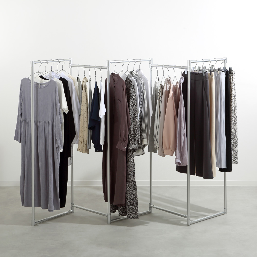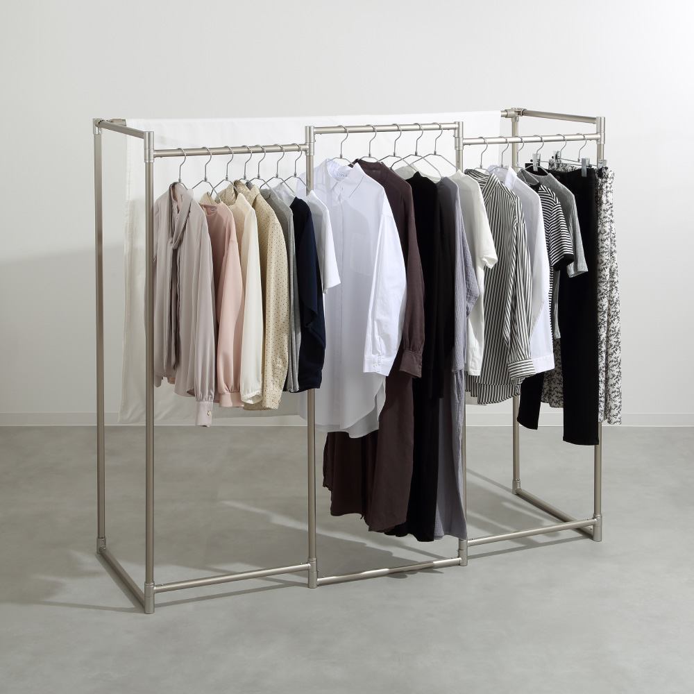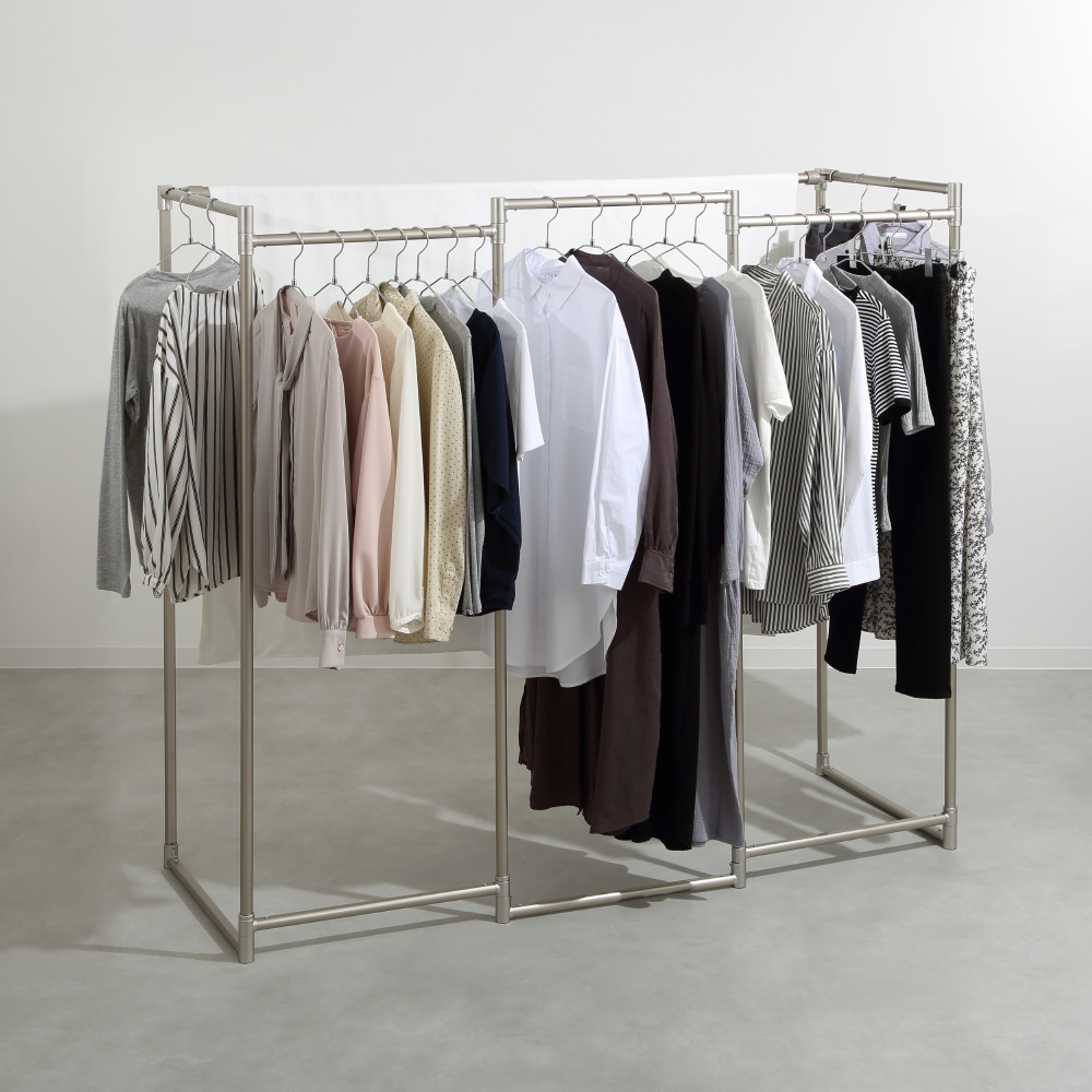 人気シリーズがさらに改良となりました!!結合部分もメッキ加工となり、オブジェのようにスマートでスタイリッシュ!。インテリアに映えるアルミ物干し。出しっぱなしで美しいので、バッグやコートをかけるハンガーとしても便利です!シンプルなアルミ製で、驚くほど軽量なスタイリッシュ物干しがリニューアル。継ぎ目部分の樹脂がメッキ塗装に変わり、より美しく高級感のあるデザインに!洗濯物に合わせて屏風のように広げたり、コの字型や三角形にできたりと、室内でも生活感なく、おしゃれに干せます!コンパクトな3連は、脱衣所や玄関など狭い空間に。ハイタイプは高さ約150cmで丈の長いワンピースにも対応。竿付きは、シーツを干す時にも活躍します。高級感のあるデザイン色はシルバーとシャンパンゴールドの2色。折りたたんで家具のすき間に収納できます。