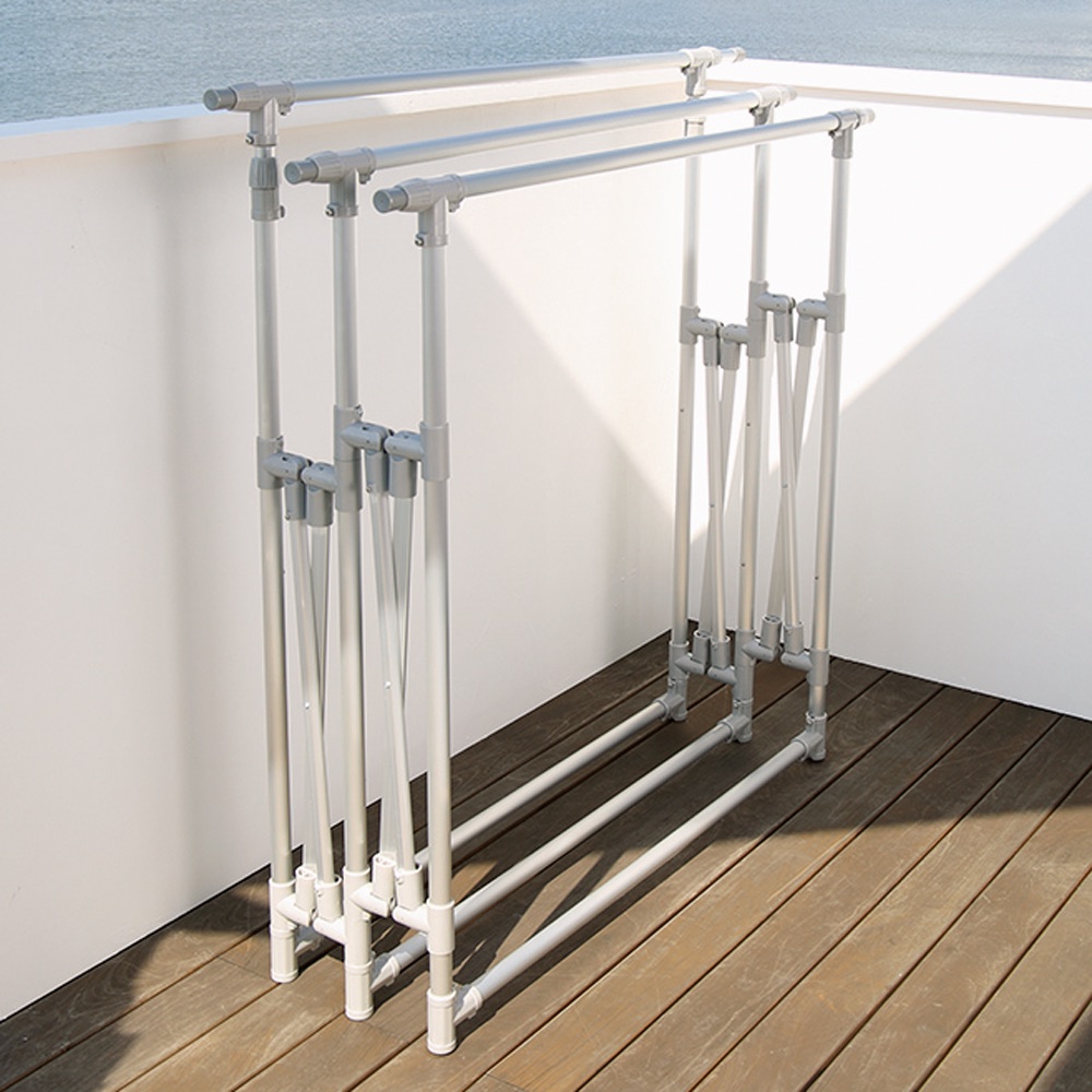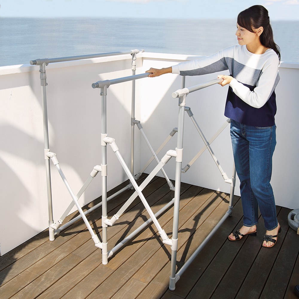 幅と奥行きを調節でき、洗濯物の量に合わせて省スペースでも大容量でもOK!固定のバーは高さ120cmと低めなので、干したものが外から見えにくいのも◎〜洗濯物に合わせて、幅・奥行き・高さを調整〜 ◆洗濯物の量や干す物に合わせて便利に伸縮できる、自立式の物干し竿です。(※高さ伸縮するバーは1本のみです。)◆普段の洗濯物では、ベランダにコンパクトに置けて省スペース。◆家族全員分の洗濯や、ベッドシーツ・布団干しの際には大きく広げて大容量の物干に!◆奥行きを広げれば、空気の通り道を確保してより乾きやすい環境づくりができます。〜ベランダからの景観に配慮した高さ設計〜 ◆固定バーの高さは120cmと、マンションのベランダの塀の高さに配慮しています。◆外から見た時に洗濯物が見えにくくなる高さにこだわりました。◆低めの位置に下着などの見られたくない洗濯物を干すことができるので安心です。〜耐久性も使い勝手も◎〜 ◆本体はアルミ製の軽量パイプを使用しています。◆竿は表面に凹凸のあるローレット加工を施し、滑りにくく強度もUPしています。◆ハンガーが風で外れにくい、ハンガーフック(10連)がついています。