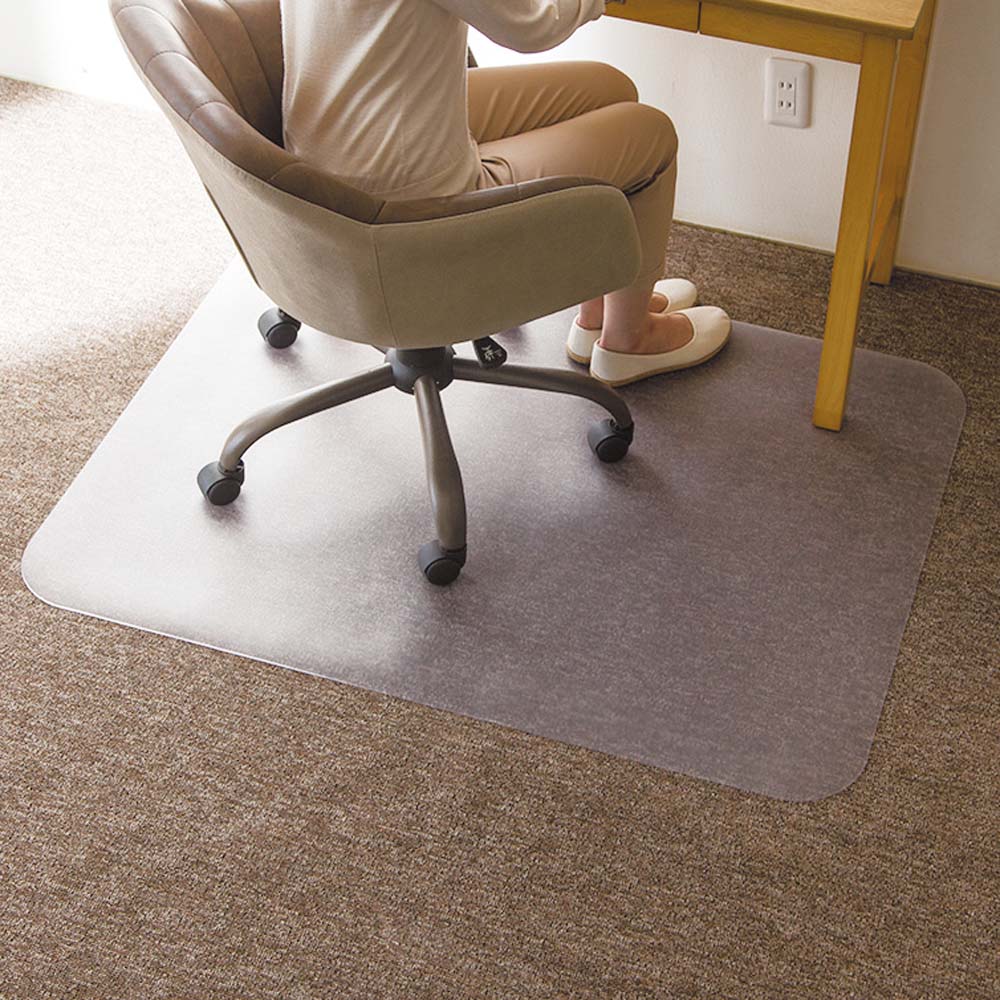 アキレス透明マットシリーズのチェアマット!キズつきやすいデスク回りの床や、重い椅子の下に。アキレス透明マットシリーズのこだわりはそのまま。チェアマットにもこだわりを!【ポイント1】貼りつかないのに、ズレにくい。裏面には見えないほど小さな凹凸が。空気の層を作り、マットが床にベタっとくっつかず、適度な密着を実現しました。【ポイント2】アキレス×ディノスの特殊コーティングで長く使える丁寧なつくりにこだわった日本製の透明マットは、特殊コーティングで経年劣化によるべたべたを大幅に軽減。大切な床を守ります。【ポイント3】厚さ約2.5mmで丈夫!キャスター付きチェアや重量のあるマッサージチェアなどの下に弾いても大丈夫です。床のキズやへこみをしっかり防ぎ、キャスターの音も響きにくいです。【ポイント4】床暖房対応床暖房対応しており、毛足の長いカーペットの上でも使用できます。【ポイント5】マットにつまずきにくい厚さ約2.5cmとしっかり厚みがありますが、マットの段差が気にならないように、断面が斜めになっているため、マットにつまずきにくいです。