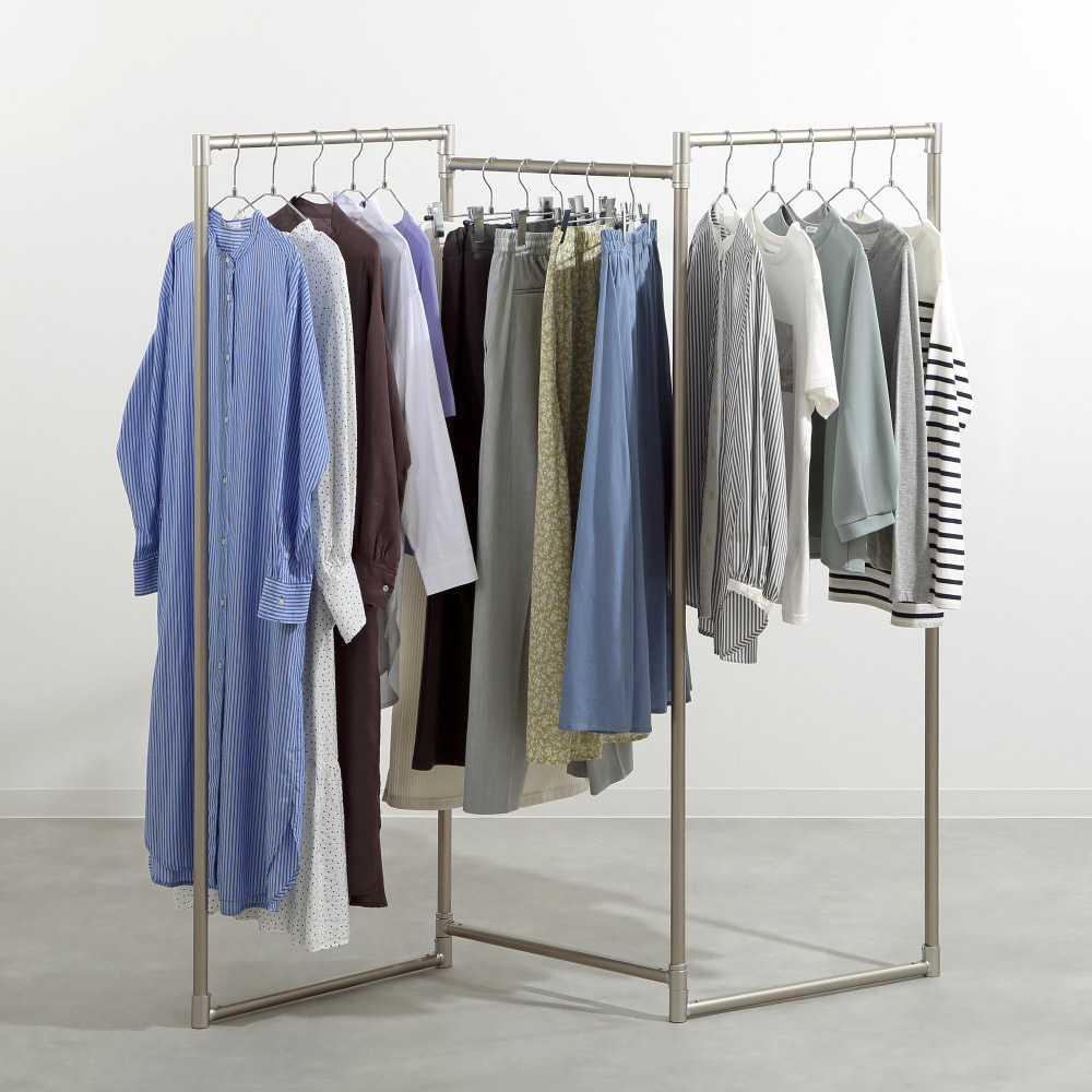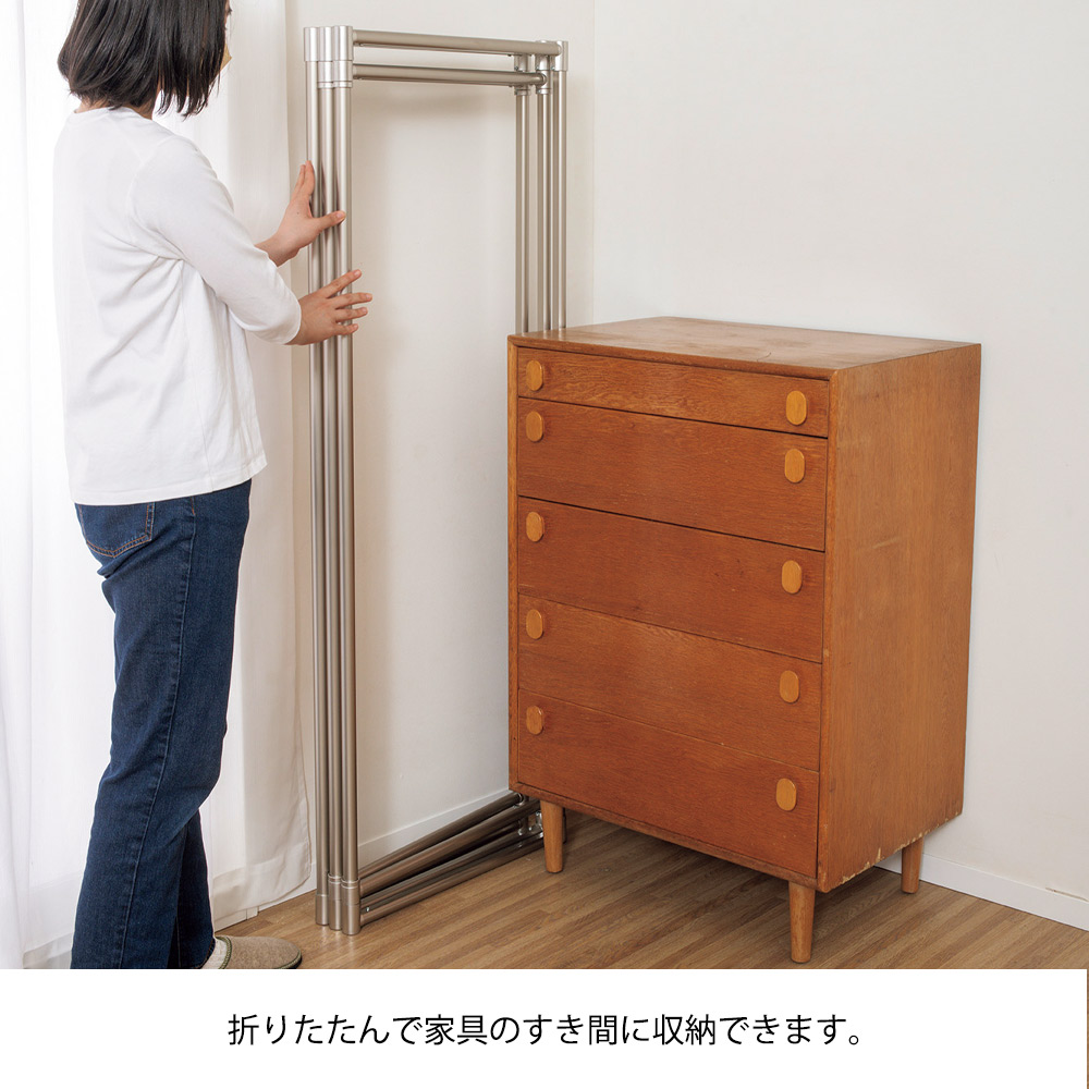 人気シリーズがさらに改良となりました!!結合部分もメッキ加工となり、オブジェのようにスマートでスタイリッシュ!。インテリアに映えるアルミ物干し。出しっぱなしで美しいので、バッグやコートをかけるハンガーとしても便利です!シンプルなアルミ製で、驚くほど軽量なスタイリッシュ物干しがリニューアル。継ぎ目部分の樹脂がメッキ塗装に変わり、より美しく高級感のあるデザインに!洗濯物に合わせて屏風のように広げたり、コの字型や三角形にできたりと、室内でも生活感なく、おしゃれに干せます!コンパクトな3連は、脱衣所や玄関など狭い空間に。ハイタイプは高さ約150cmで丈の長いワンピースにも対応。竿付きは、シーツを干す時にも活躍します。高級感のあるデザイン色はシルバーとシャンパンゴールドの2色。折りたたんで家具のすき間に収納できます。