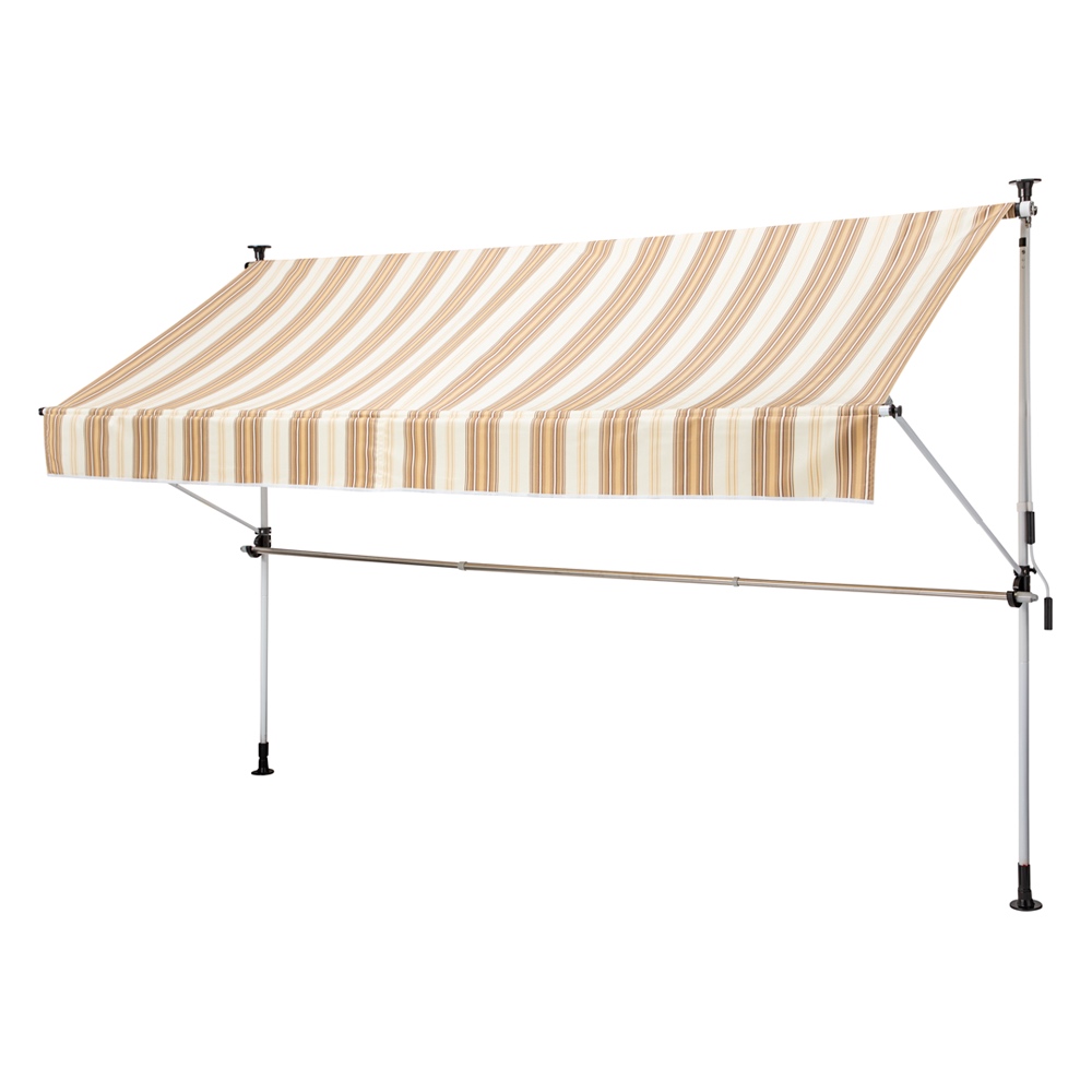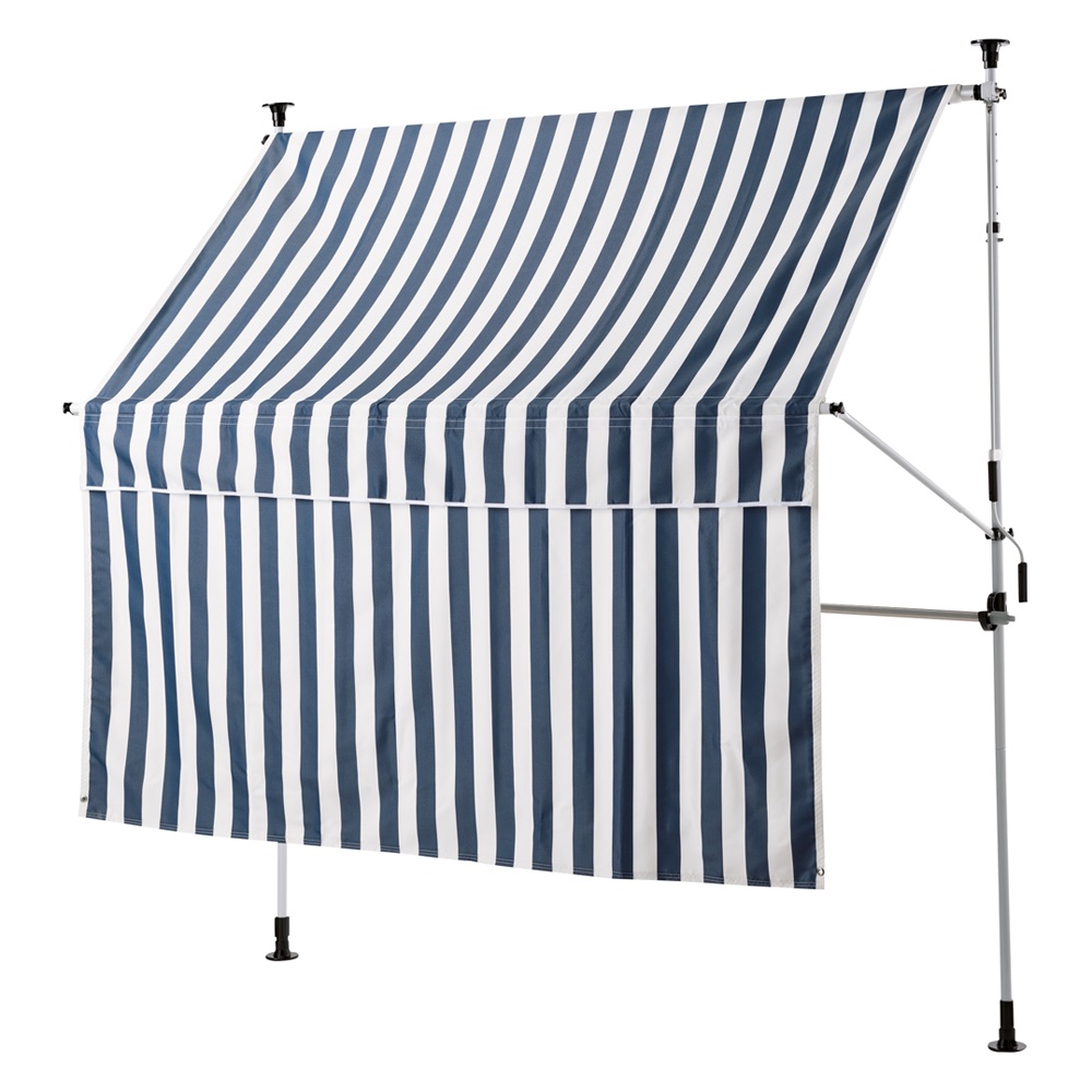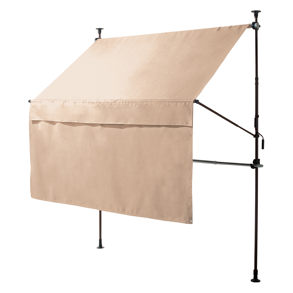 ※スチール製品は素材の特性上、経年変化でサビが発生致します。長くお使い頂くために、お届け直後の錆止め材の塗布をお薦めしております。 また、ご使用開始後も定期的なお手入れをお薦めします。(お手入れ方法&取り付け方法)暑さ対策&雨対策&物干し!欲しい機能がたっぷりつまった、施工工事不要のつっぱり日よけ。ちょっとした雨にも対応する撥水仕様&物干し竿付です。取り外し可能な前幕付で、日除けも雨対策もより万全に。まるでお店のような日除けが、施工工事不要で設置可能!■突っ張るだけの楽々施工。軒下があっという間に涼しくて“暮らす”ためのスペースに変わります!物干し竿付で、洗濯物干しスペースとしても■取り外し可能な物干し竿付。日除けのみならず、洗濯物干しスペースがどこにでも作れます。撥水加工を施した生地で、雨対策も■急な雨などにも対応する撥水加工済。急な雨から洗濯物を守ります。(大雨や台風には対応していません。)取り外し可能な前幕付で、日差しも雨対策もより万全に■付属の前幕(長さ95cm)は、面ファスナーで取り外し可能。前幕をつけたら、真夏の日差しも雨もより遮ります。色は選べる5色展開■モダンなブラウン、ナチュラルなグリーン、爽やかなストライプネイビー、そしてディノスでしか買えないグレイッシュベージュとストライプベージュの計5色展開!外壁や、植栽に合わせてお選びください。
