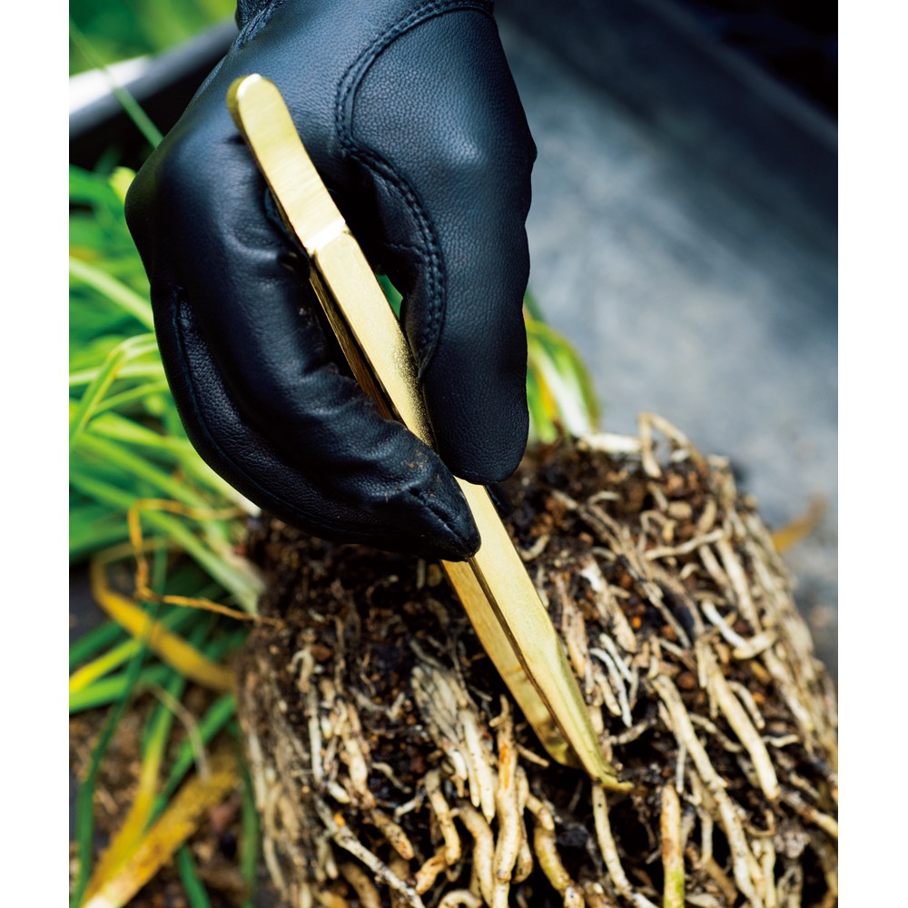 高級感漂うカラーリング!女性でも楽に使えて便利な園芸用のピンセット。吉谷先生がセレクトしたゴールドカラーで。盆栽の葉摘み道具を園芸用に改良したピンセットです。鍛造や焼き入れの工程を経て仕上げているため精密さと頑丈さを兼ね備えているのが特徴。植物の植え替えや根崩し、葉の裏に付いた虫取りなど日々の繊細な作業で幅広く活躍します。●職人技が光る精巧な作り細かい作業に最適な園芸用のピンセット。ぴったり合った先端は強く握っても先が開かず、確実に対象物を掴むことができます。●植物の虫取りに、多肉植物の植え替えに、寄せ植えの根ほどき作業に薔薇の葉の裏につく虫を地道にとっていく作業はバラ愛好家の必須作業です。こんな素敵な自慢できるピンセットがあれば、いやな作業も楽しくなりそう。サボテンの植え替え、寄せ植えの内側の枯れ葉摘み、種蒔きや不要な小さな芽の間引き、コケの貼り付けや授粉、根をほぐす時などにお使いいただけます。●安心安全の国内生産材料選びから仕上げまで、全て新潟県三条市の工場にて、職人が1つずつ手作業にて製造しています。刃物鋼を材料とし、鍛造や焼き入れといった工程を経ているため、精密さだけでなく丈夫さも兼ね備えており、長い間愛着を持ってお使いいただけます。