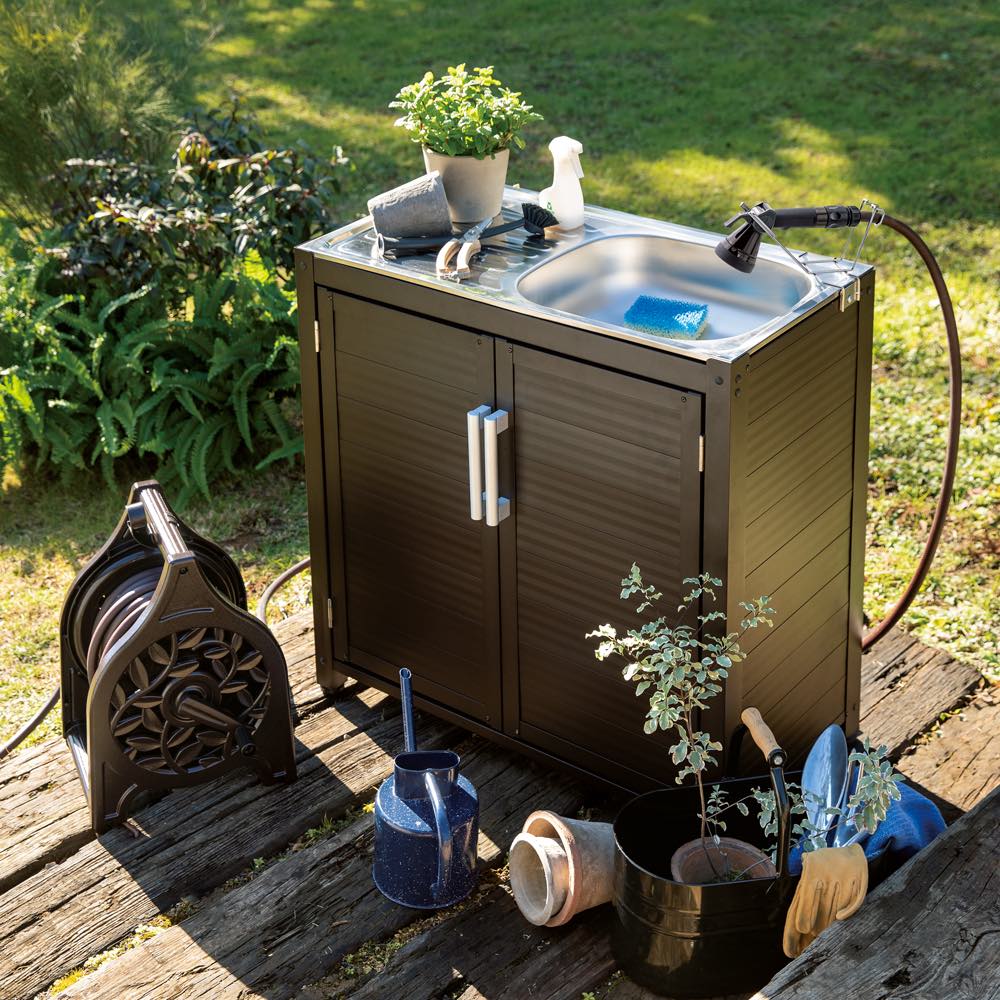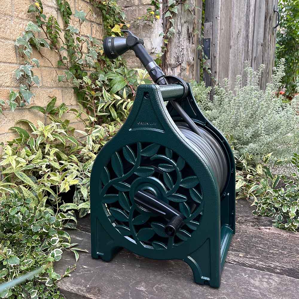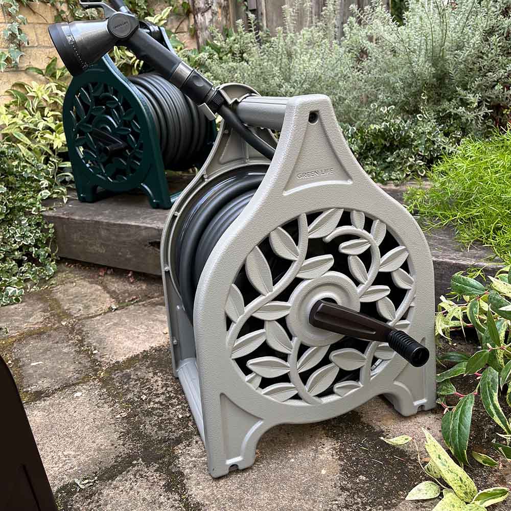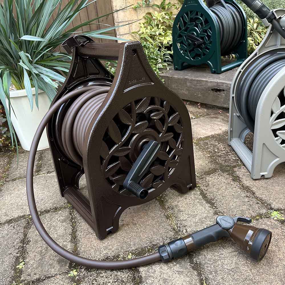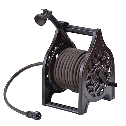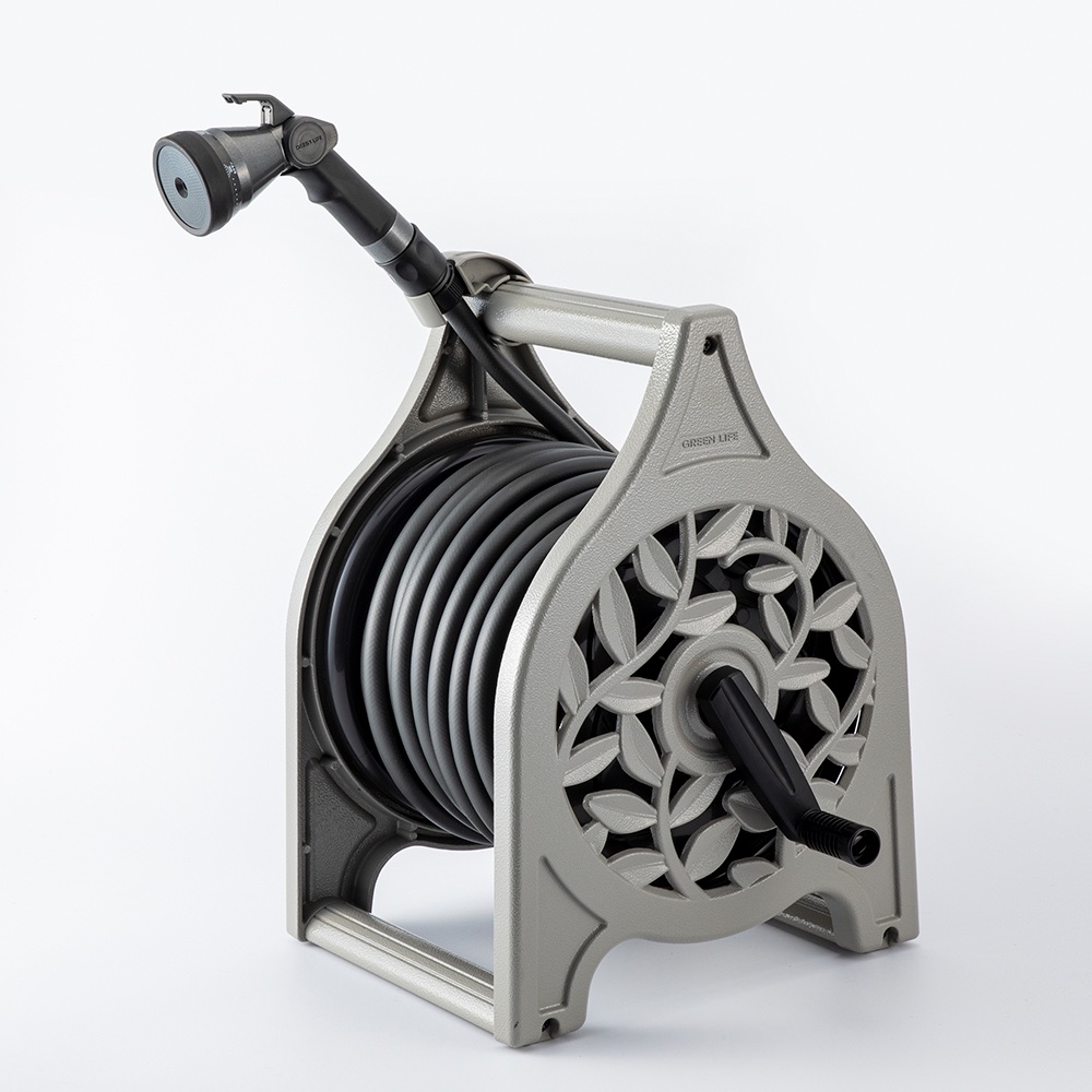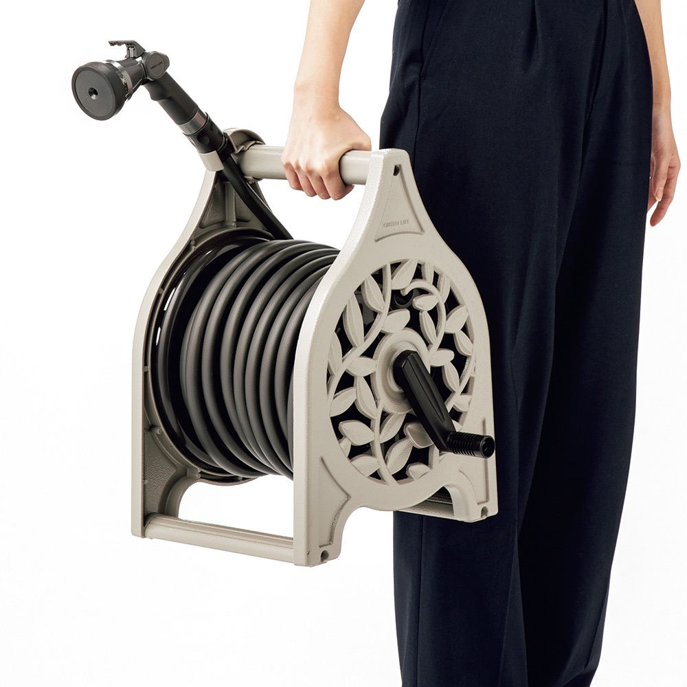 お庭に溶け込む美しさと機能性を両立!植栽にしっくりなじむ、ブラウン色とグリーン色のホースリール。◆植栽になじむ、高級感のある見た目・ホースは出しっぱなしのものであるからこそ、見た目にもこだわりたい。・リーフモチーフを、重厚感あふれる鋳物風に表現。・植物になじむ、ブラウン色・グリーン色・サンドグレー色の3色をご用意。・アルミ素材でそこまで重たくないため、鋳物製品と比べ移動も楽です。◆ホース長25mで使い道いろいろ・ホースの長さはたっぷり25m。・広めのお庭のお水やりから、洗車、ちょっとした庭のお手入れまで便利に役立ちます。