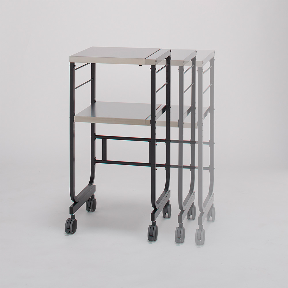 調理、配膳、収納など、使用シーンやスペースに合わせて無段階に幅伸縮が可能。 ※写真は別売りの棚付きタイプです。