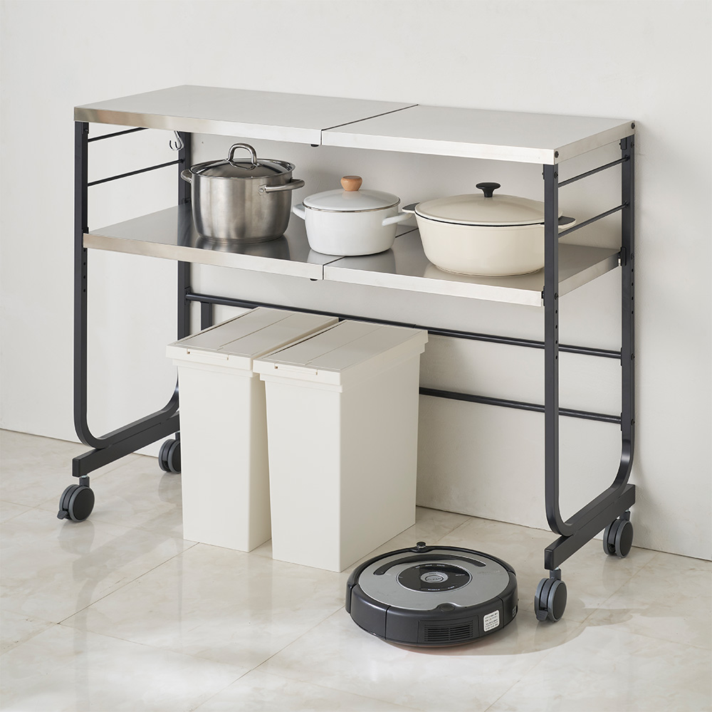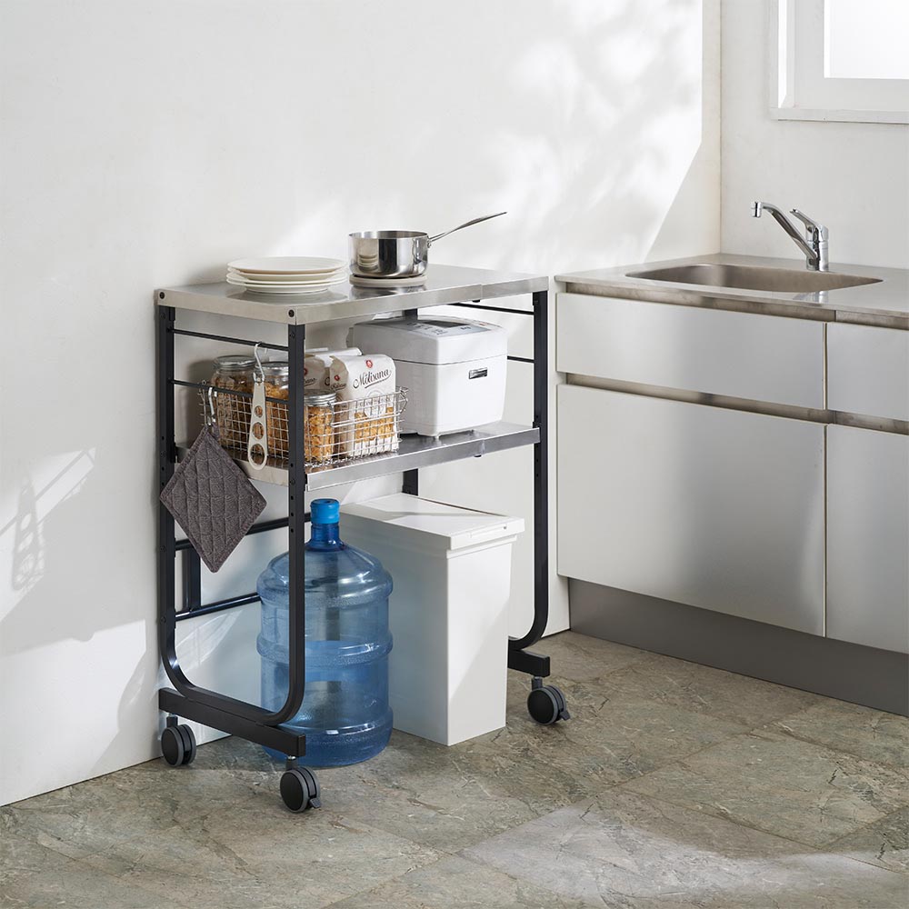 調理、配膳、収納など様々な用途に使えて、スペースに合わせて無段階に幅伸縮が可能なステンレスカウンター。キャスターはストッパー付きだから本格的な作業もお任せ。メイドイン燕三条ならではの高品質で、こんなカウンターが欲しかった!と誰もが思う逸品です。写真は幅55cm〜幅90cmタイプキッチンの「欲しい!」を叶える燕三条のステンレスカウンター調理、配膳、収納など様々な用途に使えて、スペースに合わせて無段階に幅伸縮が可能なステンレスカウンター。メイドイン燕三条ならではの高品質で、こんなカウンターが欲しかった!と誰もが思う逸品です。写真は幅70cm〜幅120cmタイプ動かせる調理台として、本格的な作業もお任せ本格的な調理ができるステンレス作業台としても活躍。キャスターにはストッパーがついているので、パン作りなどの力をかける作業も安心してできます。写真は幅40cm〜幅65cmタイプ異動も安定設置もできるストッパー付きキャスターを採用キャスターにはストッパーがかけられるので、家電ラックとして決まった場所に置くことも可能。包丁を使ったり、パンをこねたりする時も安心です。豊富な幅展開で置きたい場所にぴったり幅伸縮キッチンカウンターの棚付きタイプは、高品質なメイドイン燕三条。幅は40〜65cm、55〜90cm、70〜120cmの3タイプ。棚板は高さ調節が可能で、フレキシブルに使えます。写真は幅55cm〜幅90cmタイプ金属加工の街から生まれた信頼のキッチンカウンター金属加工の街として知られる新潟県燕三条エリアで製造された、強さと美しさが際立つステンレスカウンターです。写真は幅40cm〜幅65cmタイプスペースや使い方に合わせて無段階幅伸縮が可能無段階で幅伸縮でき、キャスター付きで自由に動かせるステンレスカウンターは、幅40〜65cm、55〜90cm、70〜120cmの3タイプ。調理スペースが少ないキッチンにゆとりが生まれ、まな板を2枚置いての料理やキッチン家電を置いた状態での調理、大皿料理の盛り付けもラクラクです。熱や水、汚れに強く、お手入れも簡単なステンレス製本体は熱や水、汚れに強いステンレス製。天板には熱いお鍋もそのまま置けるので、調理中に手が止まることがありません。汚れや吹きこぼれもサッと拭きとるだけでキレイになり、お手入れも簡単です。安全と使いやすさのための配慮が随所に高い技術力で隅々まで滑らかに仕上げ、コーナーには着脱可能な保護キャップを設置。サイドにS字フックが掛けられるバーを付けるなど、安全性と使いやすさのための配慮を随所に施しました。下段の棚板は3cmピッチで高さ調節が可能棚付きタイプは3cmピッチで高さ調節が可能な棚板1枚付き。使い方や収納したい物に合わせて、効率良く使えます。写真は棚付きタイプ幅70cm〜幅120cmキッチンラックとしてシンクサイドに置いてもシンクサイドに置いても使いやすい高さ92cm。棚板の高さを調整して、下にゴミ箱やストック類を置いたり、調理中のちょい置きスペースとして使ったり、一度使えば納得の便利さです。