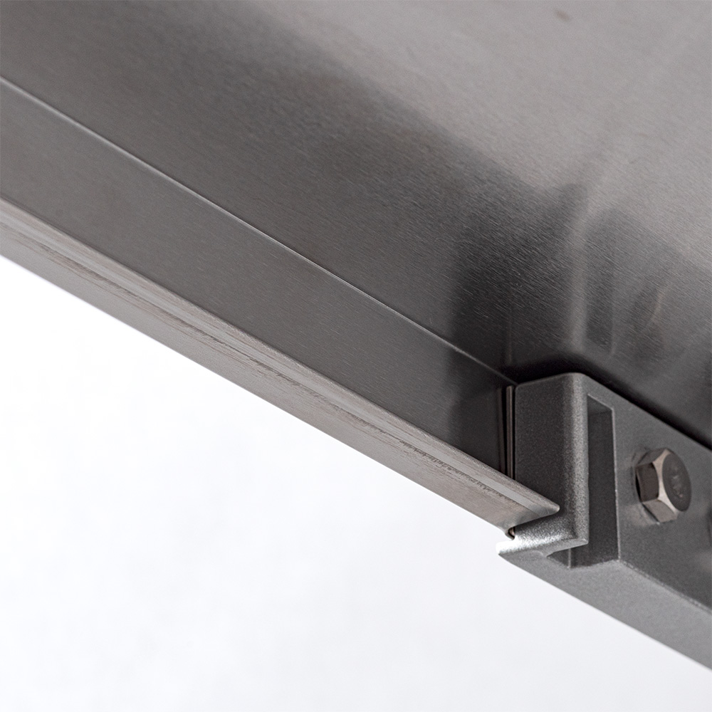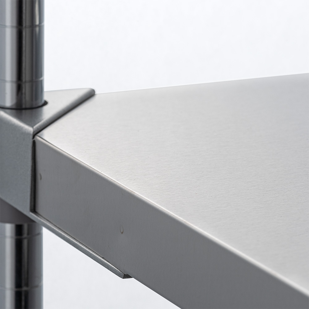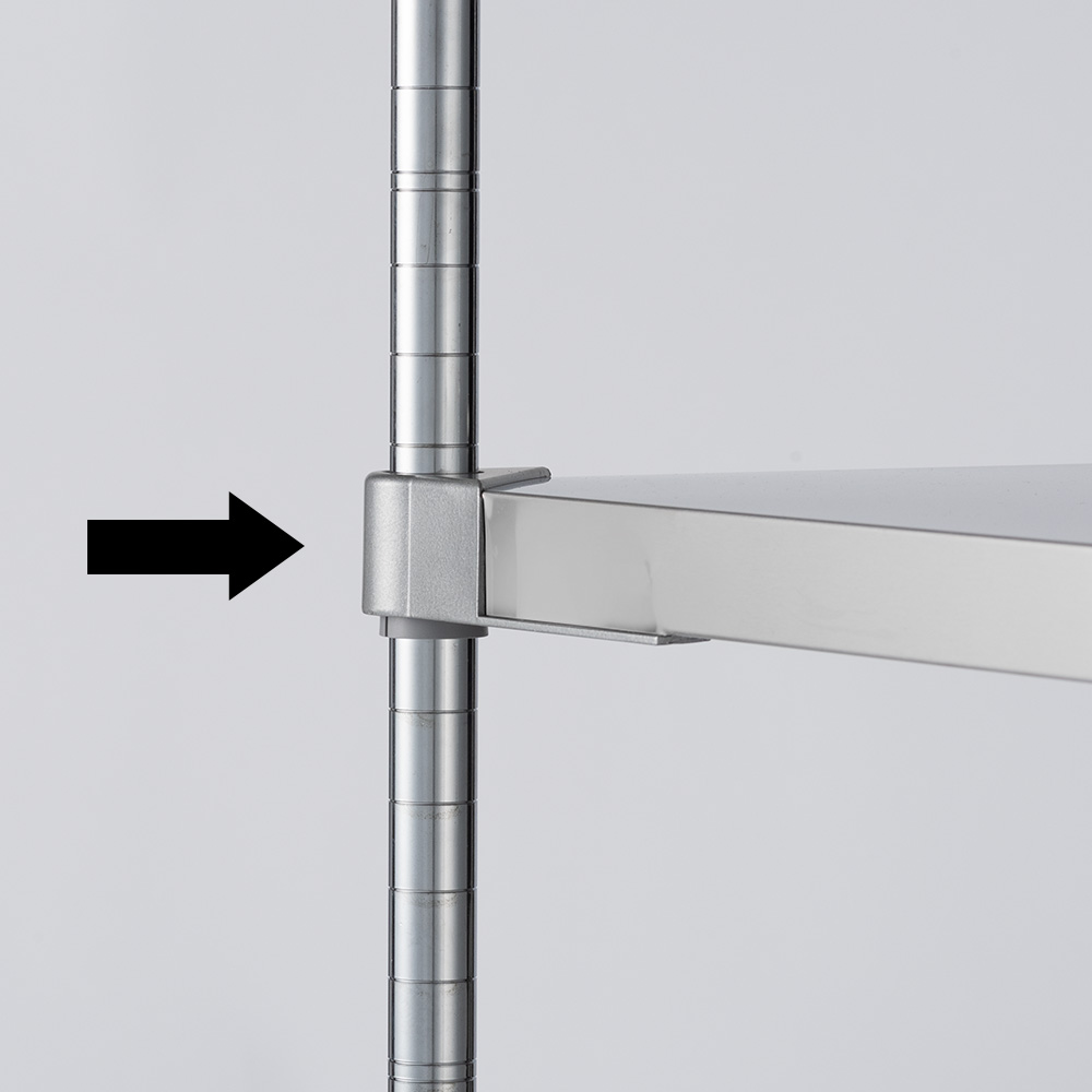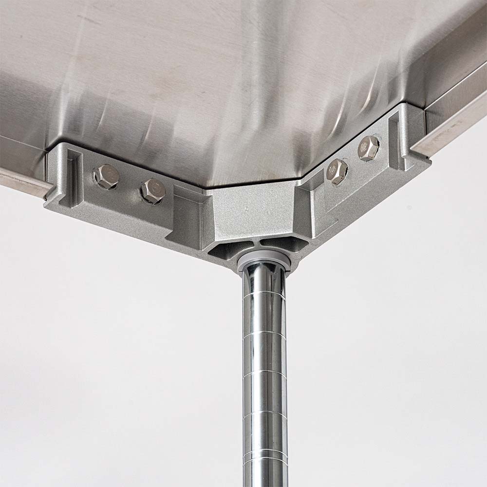コーナーパーツは丈夫なアルミダイキャスト製(実用新案・意匠登録済み)。4か所で固定するので棚板が凹んだりせず、安心して使えます。 ※写真は別売りのステンレス天板タイプです。