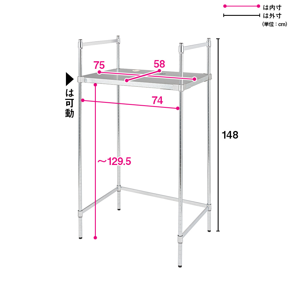 業務用レベルの頑丈さを誇る国産ラック。実用新案、意匠登録済のアルミダイキャスト製コーナーパーツの採用により、約50kgという圧倒的な耐荷重を実現! 金属加工技術で定評ある燕三条で作られた確かな品質です。天板には、水に強く堅牢なガルバリウム鋼板を使用しています。洗濯機から乾燥機へ、スムーズな動線でお洗濯を時短できる頑丈ラック●置き場に困っていた乾燥機が置ける、頑丈さにとことんこだわりぬいて誕生した国産ランドリーラック。●洗濯機上の空間を利用することで、すっきりとしたランドリースペースをつくれます。●天板は使う方の身長や設置場所に合わせて、使いやすい高さに調節可能。●洗濯機のすぐ上に衣類乾燥機を置けるので最短距離で乾燥機に入れられ、作業時間を短縮できます。●大きめの乾燥機の置き場に困っている方、いまお使いのラックでは乾燥時に揺れが気になるという方は、ぜひご検討ください。頑丈さは業務用レベル! 耐荷重約50kgだから安定感が違います●濡れた洗濯物を入れた重たい乾燥機をしっかりと支えられるよう、頑丈さを追求しました。●天板の耐荷重は、驚きの約50kg(耐荷重試験では倍の約100kgをクリア)。●フレームはスチールパイプにクロムメッキ塗装を施しました。湿気が多い場所でも安心です。●脚部にアジャスター付きで、床面のガタつきを調整可能。●さらに、下部をコの字パーツ(高さ調節可能)で補強し、乾燥機の揺れを抑えます。がっちり支える秘密は実用新案、意匠登録済のアルミダイキャスト製コーナーパーツ●天板のコーナー部にアルミダイキャスト製コーナーパーツを採用し、強度を大幅にアップ。●一般的にはネジ止めが2ヵ所のところ、本商品は2倍の4ヵ所をネジ止めして仕上げています。●コーナーパーツは実用新案、意匠登録済。金型から起こして作り上げたこだわりのパーツが棚板をがっちりと支えます。金属加工で定評ある燕三条で製造された、信頼の日本品質●江戸時代に始まる金属加工技術で高く評価される「燕三条」のメーカーが製造。●頑丈さを求められるホテルや病院などでも使われている業務用ラックの技術を応用しました。●徹底した品質管理のもと細部まで丁寧に作られた、安心して使える国産ラックです。お好みで選べる2種類の頑丈素材の天板をご用意●天板部分は「ガルバリウム鋼板」と「ステンレス」からお選びいただけます。●天板は板厚0.8mm。4辺を曲げ加工した、美しく堅牢なつくり。●このページでご紹介しているラックは「ガルバリウム鋼板天板」タイプです。●ガルバリウム鋼板は家の屋根や外壁などにも使われる素材で、水や熱に強く、耐久性の高さが特徴。傷もつきにくく、長く使用できます。●ステンレスと比べ、リーズナブルな価格も魅力です。天板にはホースや配線コードなどを通せる2つの穴付き●お客様からのご要望にお応えして、乾燥機と洗濯機をよりスムーズに連動できるよう工夫。●天板の2ヵ所に直径5cmの穴を設けました。(付属のカバーを付けると直径4cm)●ホースや配線コードなどを通して、見た目もすっきり設置できます。※本商品は置いて設置が可能な衣類乾燥機に対応しています。また、天板耐荷重は設置する乾燥機の総重量(洗濯物の重さを含む)となりますので、ご購入前に衣類乾燥機のサイズ、仕様をご確認ください。なお、設置工事が必要な乾燥機や、ホースのついたガス式の乾燥機には対応しませんのでご注意ください。シリーズ商品のご案内衣類乾燥機も置ける 国産頑丈ランドリーラックは以下のシリーズ商品がございます。※このページはガルバリウム鋼板天板タイプの販売ページです。・ガルバリウム鋼板天板・ステンレス天板
