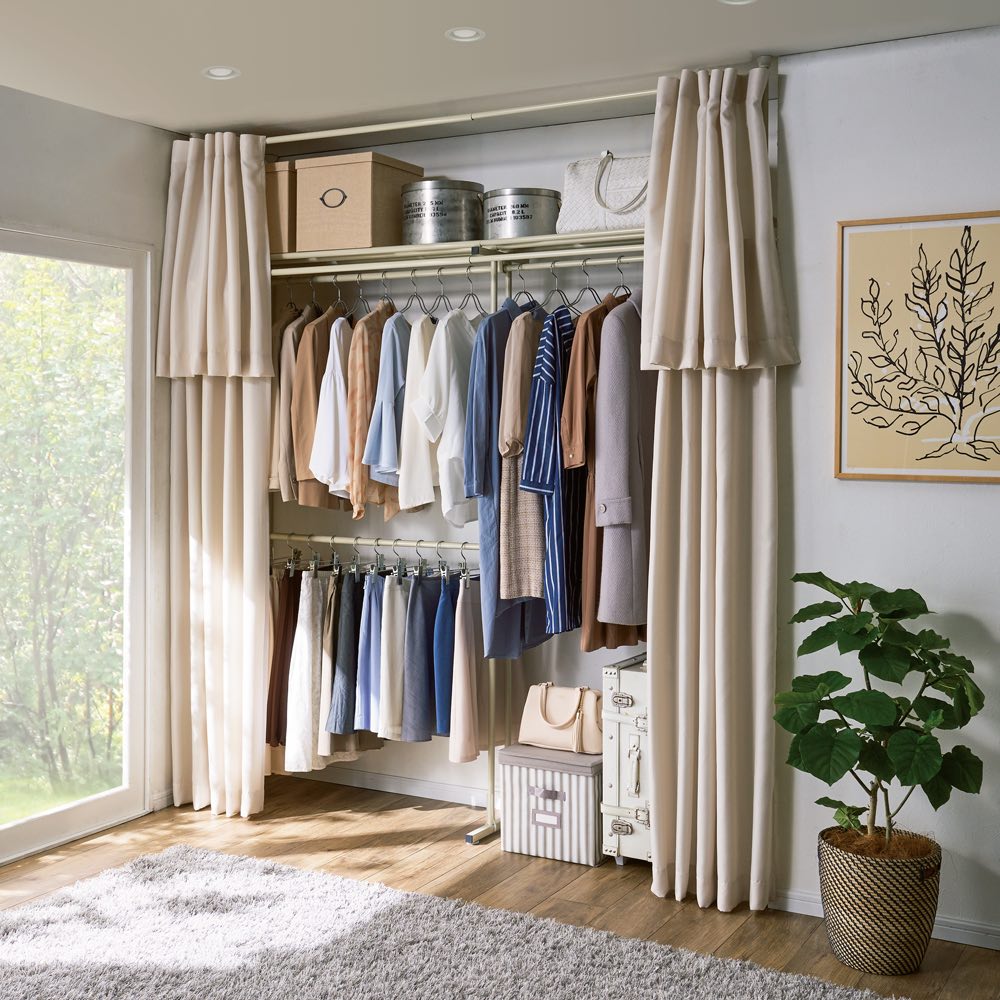 L型設置で壁一面をクローゼットに。 ※写真は幅固定タイプ(120cm) カーテン付きです。