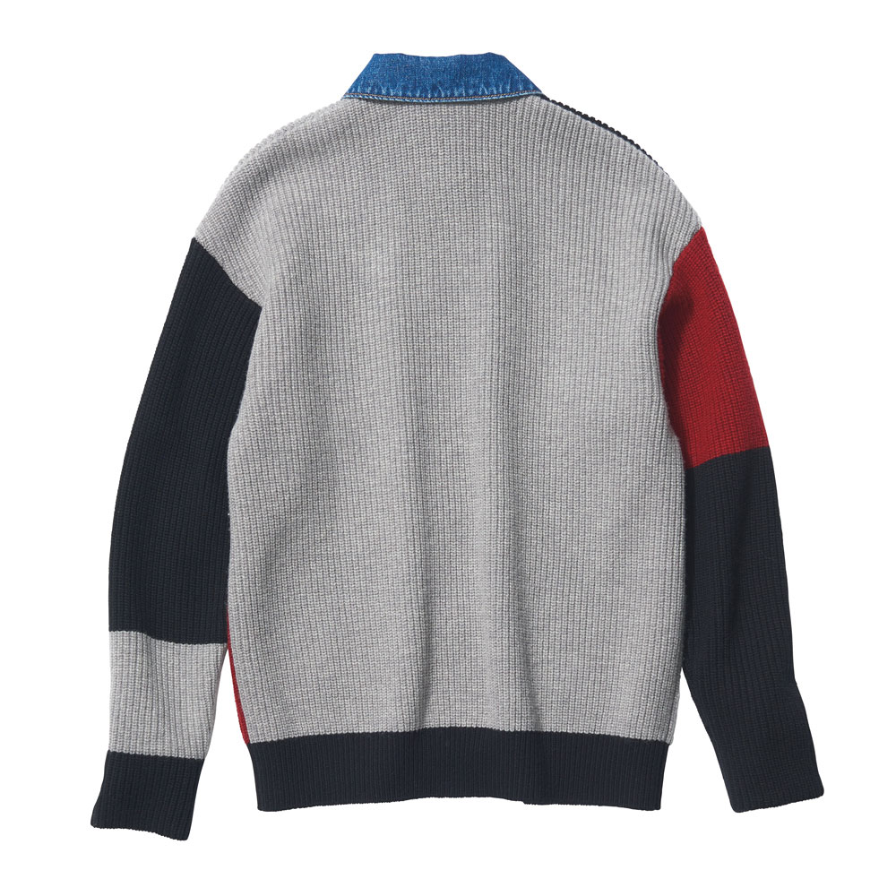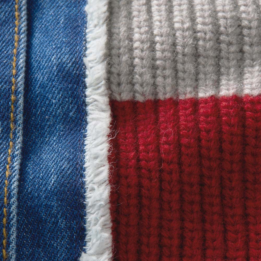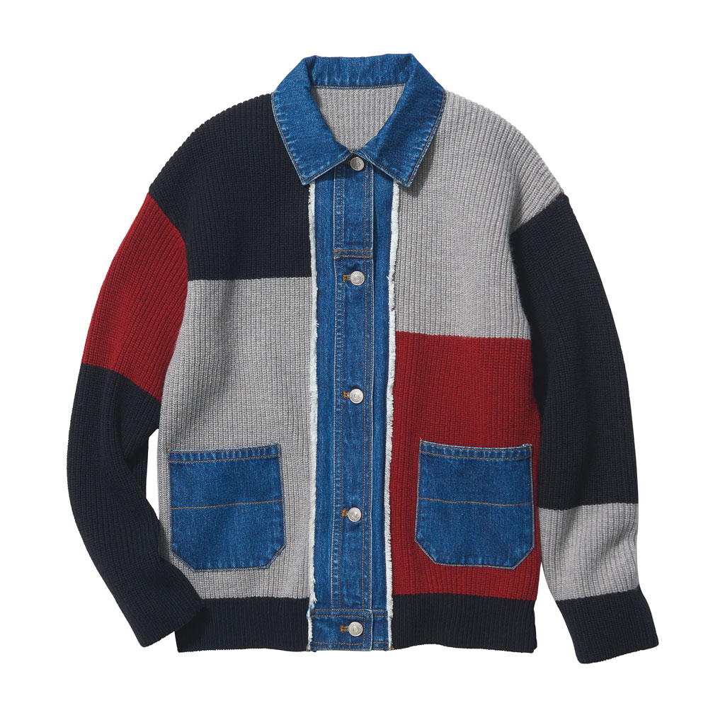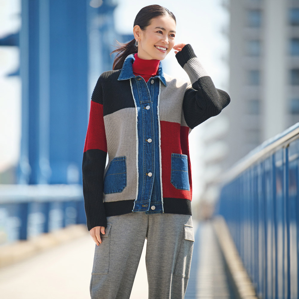 Winter RELAX STYLE冬の日がときめく、プレシャスな温もり外出が億劫な冬も、素敵な一着があればアクティブに過ごせる――。身に纏えば気分も印象もアップする、温もり仕立てのデイリースタイルをご紹介します。「ニット」×「デニム」のプレイフルなドッキング新鮮な一着をお探しなら、合わせ技で魅せるこんなジャケットがおすすめです。ニットの素材は上質なウール100%。ざっくりした畦編みで凹凸を付け、遊びのあるカラーブロックにクラス感を添えています。後ろ身頃は単色ですっきりと編み、ややオーバーシルエットで今年らしく仕上げました。そしてお洒落感の決め手は、襟やポケットのデニム使い。洗いを掛けた美しいブルー、金茶ステッチ、本誌のロゴ入りボタンなど細部まで本格派の作り。前立てのフリンジが爽やかな華やぎを生みます。