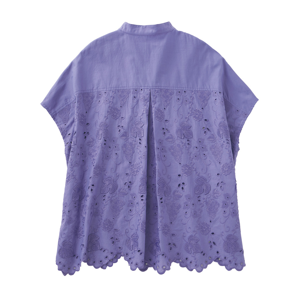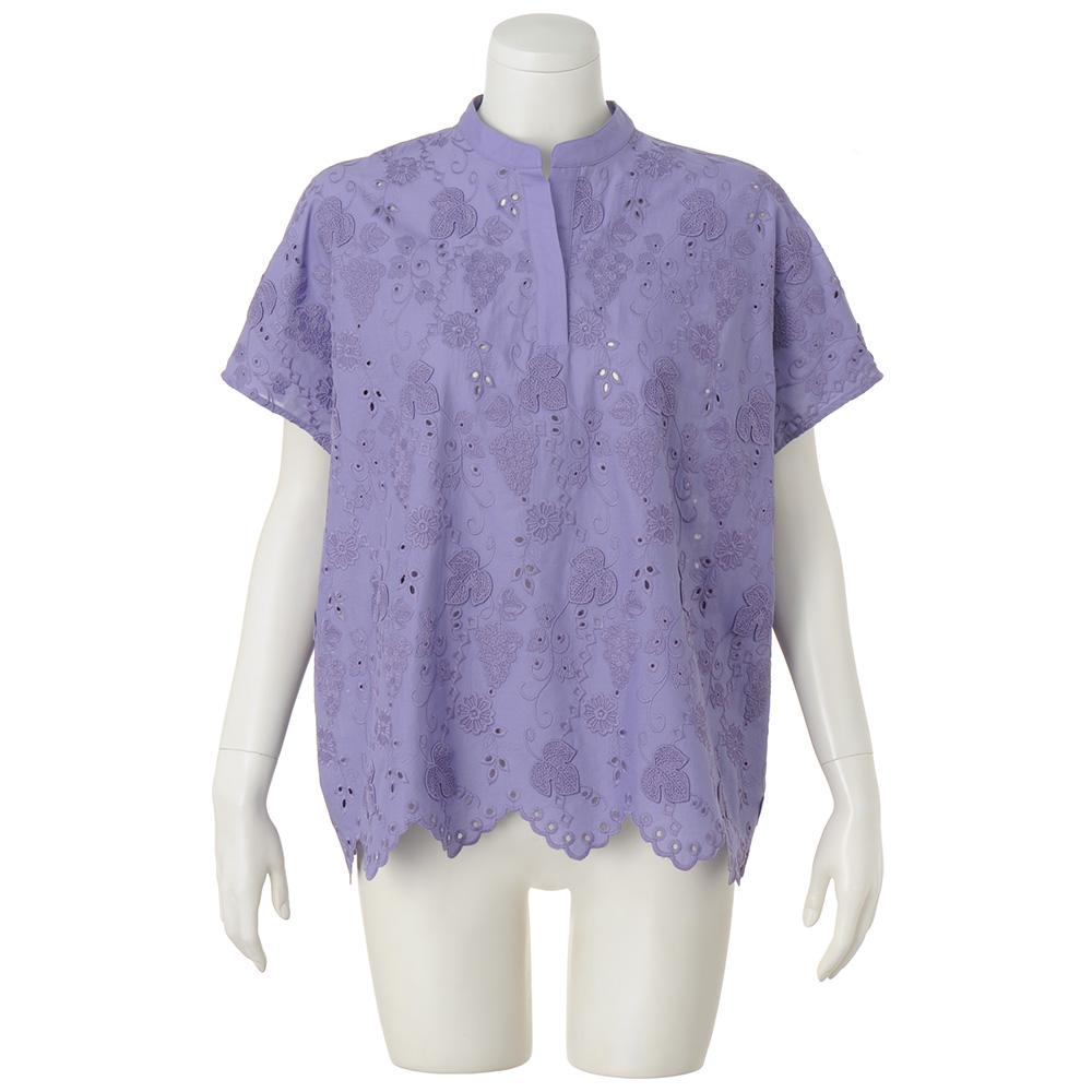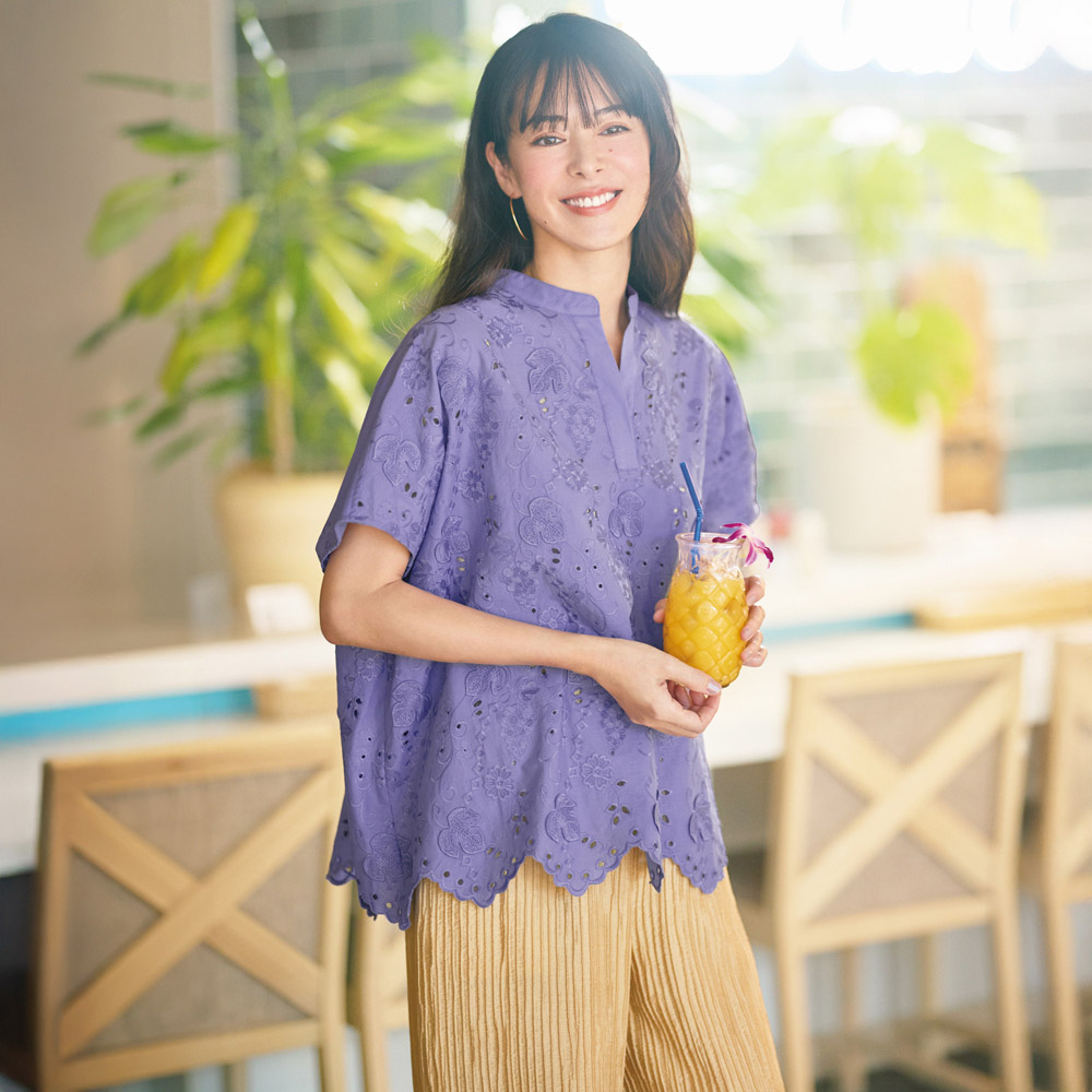 ときめきを連れてくる、ハッピーな夏スタイル。心躍る夏の気配に負けない色使い、グラフィカルな柄をさらりと着こなせたら――。大人好みの上質感と陽射しに映えるインパクトを両立した最新スタイルが揃いました。表情がトーンアップする、綺麗色の3Dレース。ぶどうや草花を艶やかな糸で刺しゅう、葉脈のみで留めた葉が立体感と陰影を高める3Dレースのブラウスです。身幅にゆとりのあるポンチョ風シルエットだから、蒸し暑い日も風が通り抜ける爽やかな着心地。裾のスカラは三角モチーフで、程よく甘さを抑えました。低いスタンドカラーは、デコルテに自然な抜け感を生むスキッパータイプで、内ボタンが開き過ぎを抑え、カジュアルも上品に決まります。≫POINT襟周りと後ろヨークは、同素材の無地使いで切り替えすっきりと。後ろ中心のタックが背中の丸みを、身頃続きの袖が、二の腕をさりげなくカバーします。