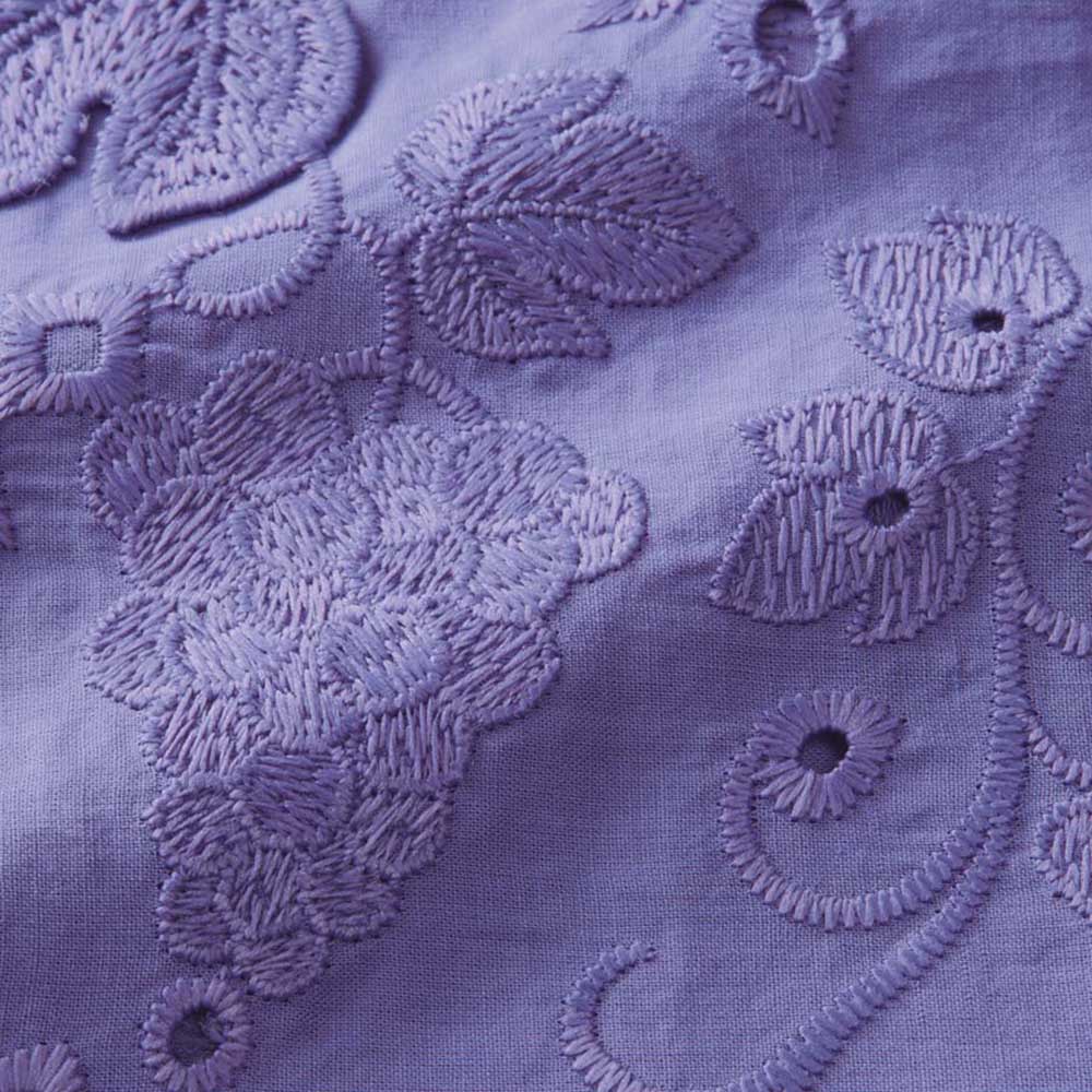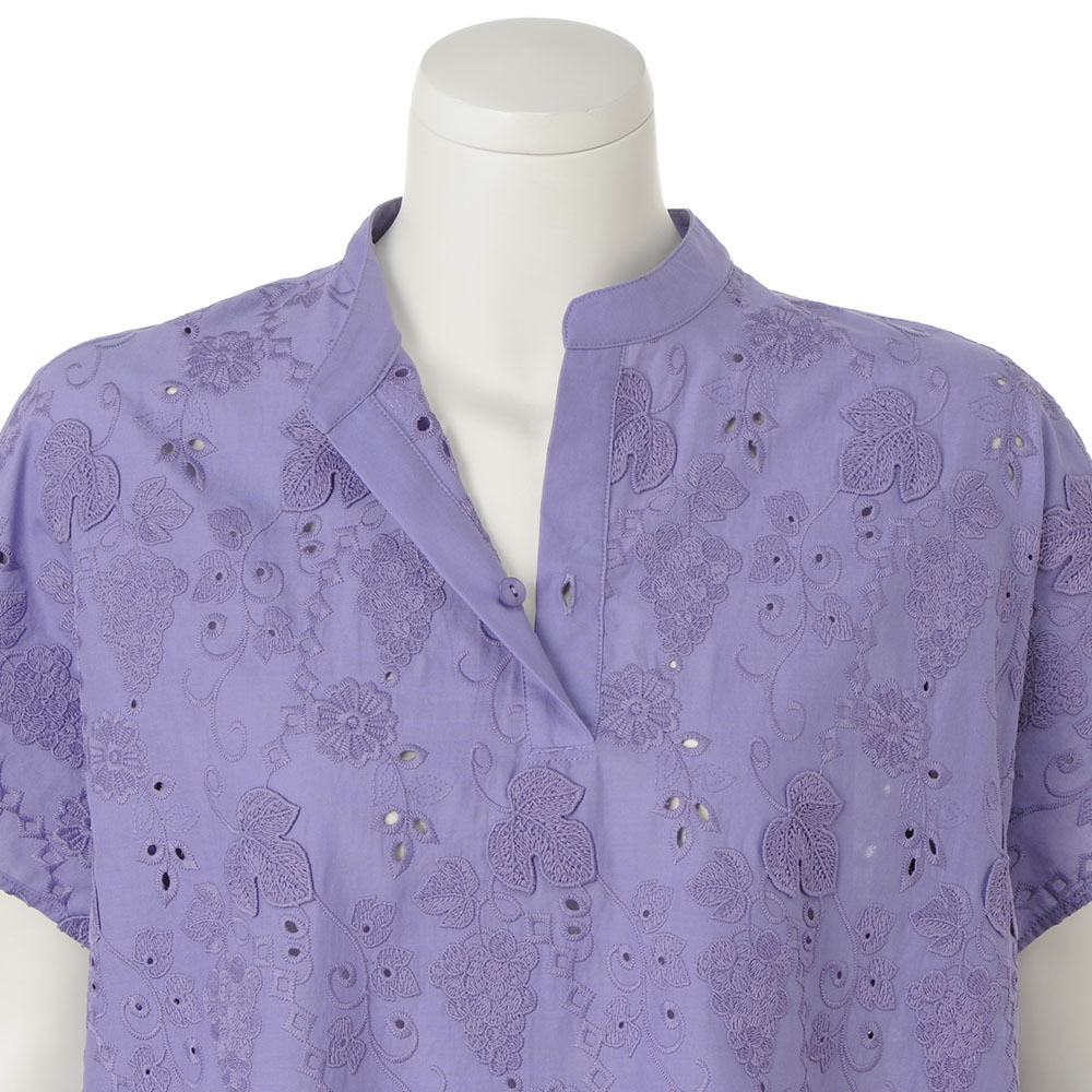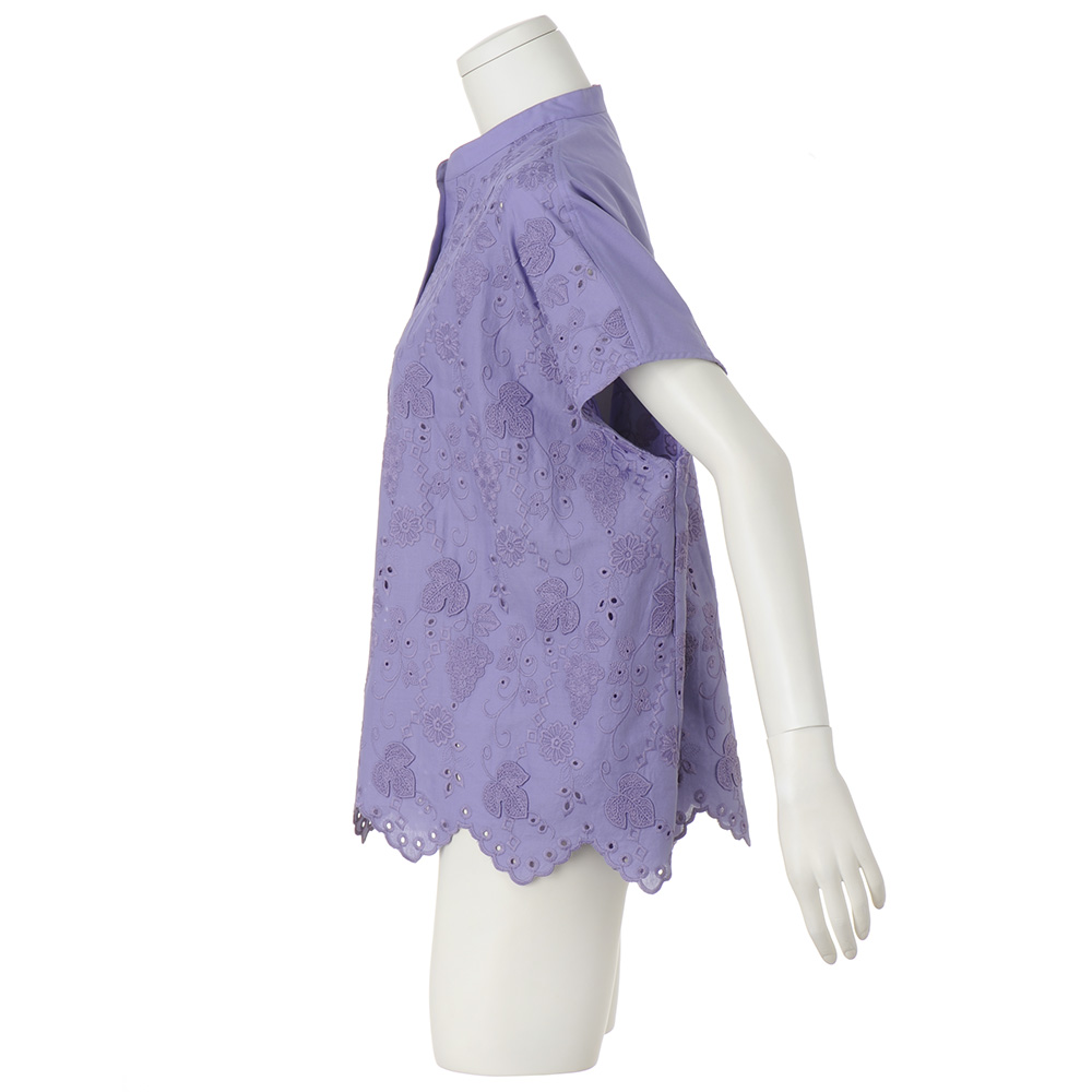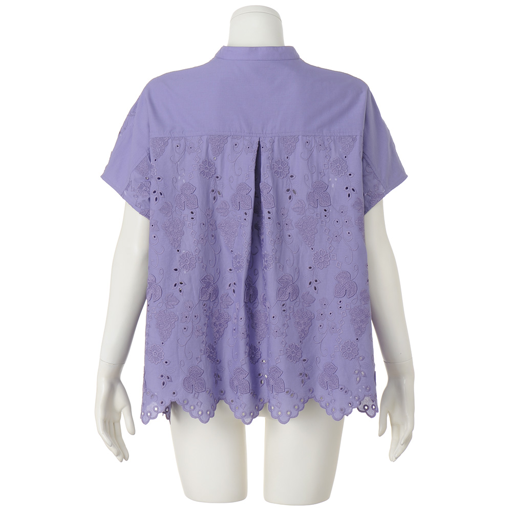 ときめきを連れてくる、ハッピーな夏スタイル。心躍る夏の気配に負けない色使い、グラフィカルな柄をさらりと着こなせたら――。大人好みの上質感と陽射しに映えるインパクトを両立した最新スタイルが揃いました。表情がトーンアップする、綺麗色の3Dレース。ぶどうや草花を艶やかな糸で刺しゅう、葉脈のみで留めた葉が立体感と陰影を高める3Dレースのブラウスです。身幅にゆとりのあるポンチョ風シルエットだから、蒸し暑い日も風が通り抜ける爽やかな着心地。裾のスカラは三角モチーフで、程よく甘さを抑えました。低いスタンドカラーは、デコルテに自然な抜け感を生むスキッパータイプで、内ボタンが開き過ぎを抑え、カジュアルも上品に決まります。≫POINT襟周りと後ろヨークは、同素材の無地使いで切り替えすっきりと。後ろ中心のタックが背中の丸みを、身頃続きの袖が、二の腕をさりげなくカバーします。
