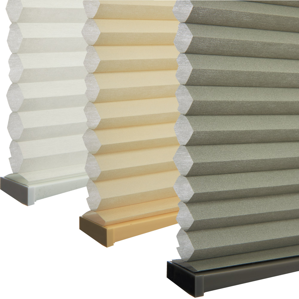 左から(ア)ホワイト (イ)ベージュ (ウ)グレー(素材アップ) ソフトな風合いの素材なので、閉め切ってもやわらかい光が差し込み、オープン時は薄くスッキリ折り畳めます。落ち着いた色合いの3色で、全色共に生地の外側半分は採光を高めるホワイト色です。