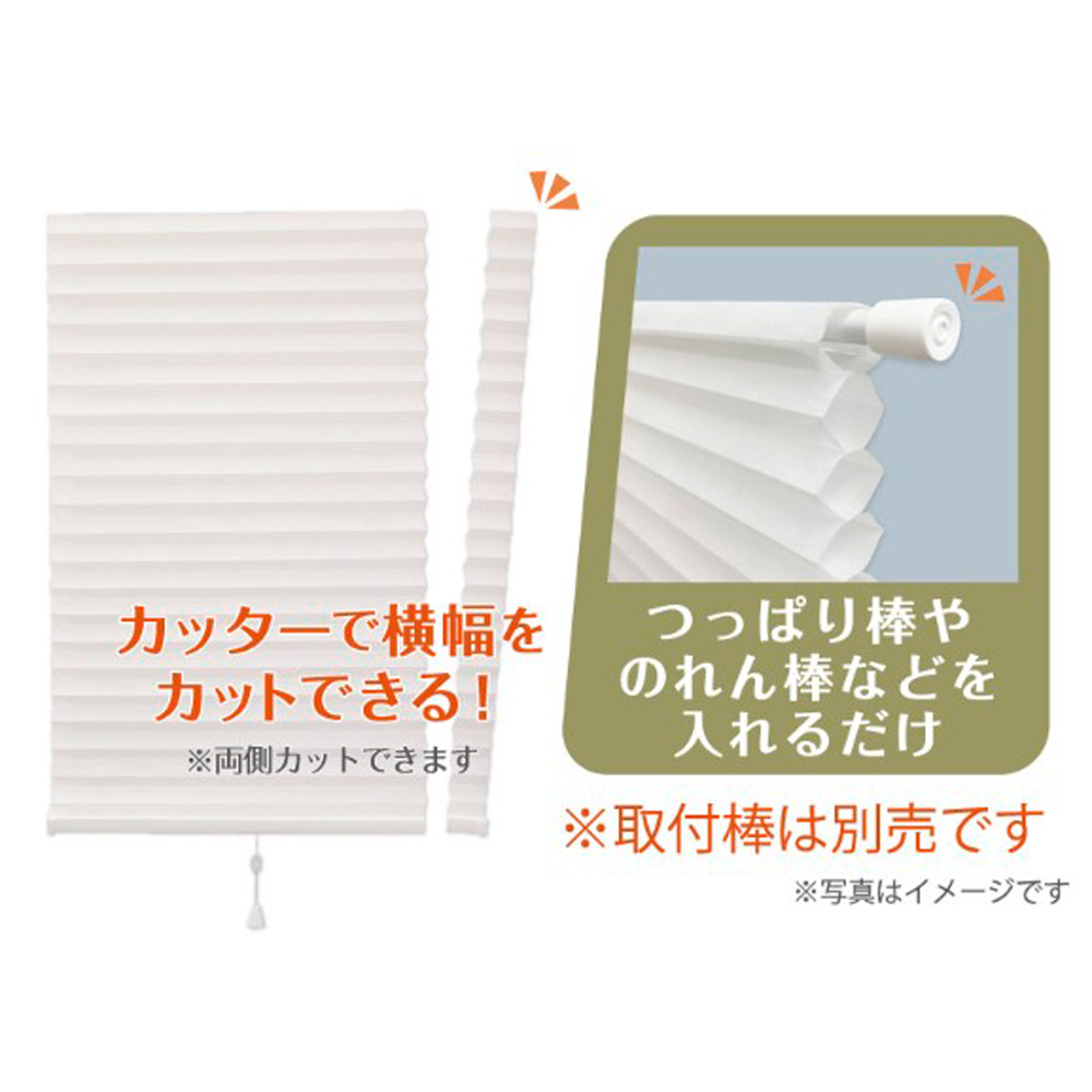 おうちで幅を簡単カット! 暑さをやわらげるハニカム構造シェード。小窓や採光窓にピッタリはまるハニカム構造シェード。カッターでカットでき、軽いので突っ張りポールで簡単に設置できます。自然の光をほどよく取り込みながら、ハニカム構造(蜂の巣構造)で夏は断熱、冬は保温効果を発揮。冷暖房効率を高めて、省エネに貢献します。生地の外側半分は採光性を高めるホワイト色です。【ポイント1】夏涼しく冬暖かく一年中快適六角形の空洞に空気をため込むハニカム(蜂の巣)構造が、窓とお部屋の間に断熱層をつくり、夏は遮熱で温度上昇をセーブ、冬は保温で暖房効率をアップ。一年中心地よく暮らせます。【ポイント2】窓に合わせて幅を調節取り付け場所の幅に合わせて、カッターで簡単にカットできます。※コードが中央にくるように両側を均等にカットしてください。【ポイント3】ラクラク設置お手持ちのつっぱりポールを通すだけ。クギやネジを使わないので窓枠を傷めません。