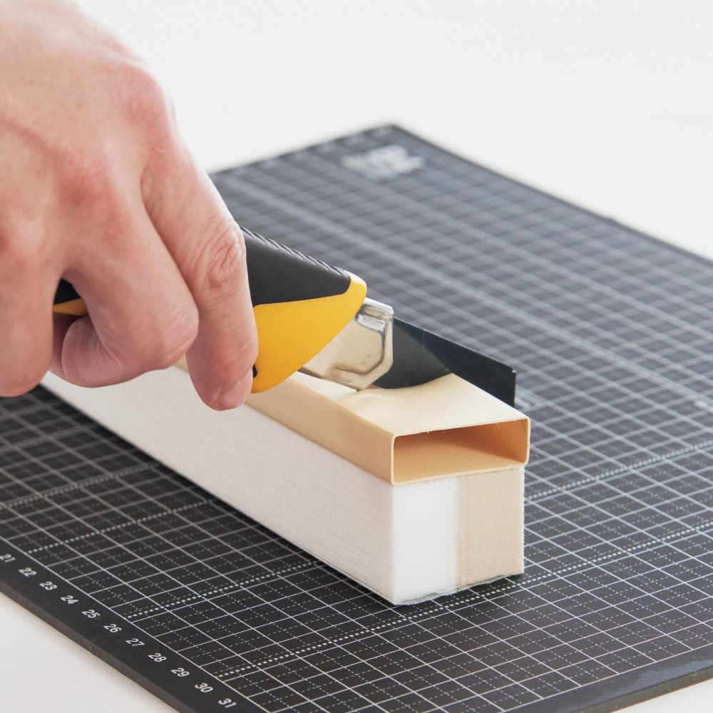 取り付け場所の幅に合わせて、少し大きめのカッターで簡単にカットできます。 ※コードが中央にくるように両側を均等にカットしてください。