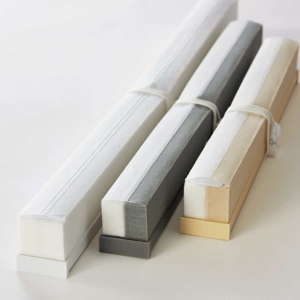 左から(ア)ホワイト (イ)ベージュ (ウ)グレー(素材アップ) ソフトな風合いの素材なので、閉め切ってもやわらかい光が差し込み、オープン時は薄くスッキリ折り畳めます。落ち着いた色合いの3色で、全色共に生地の外側半分は採光を高めるホワイト色です。