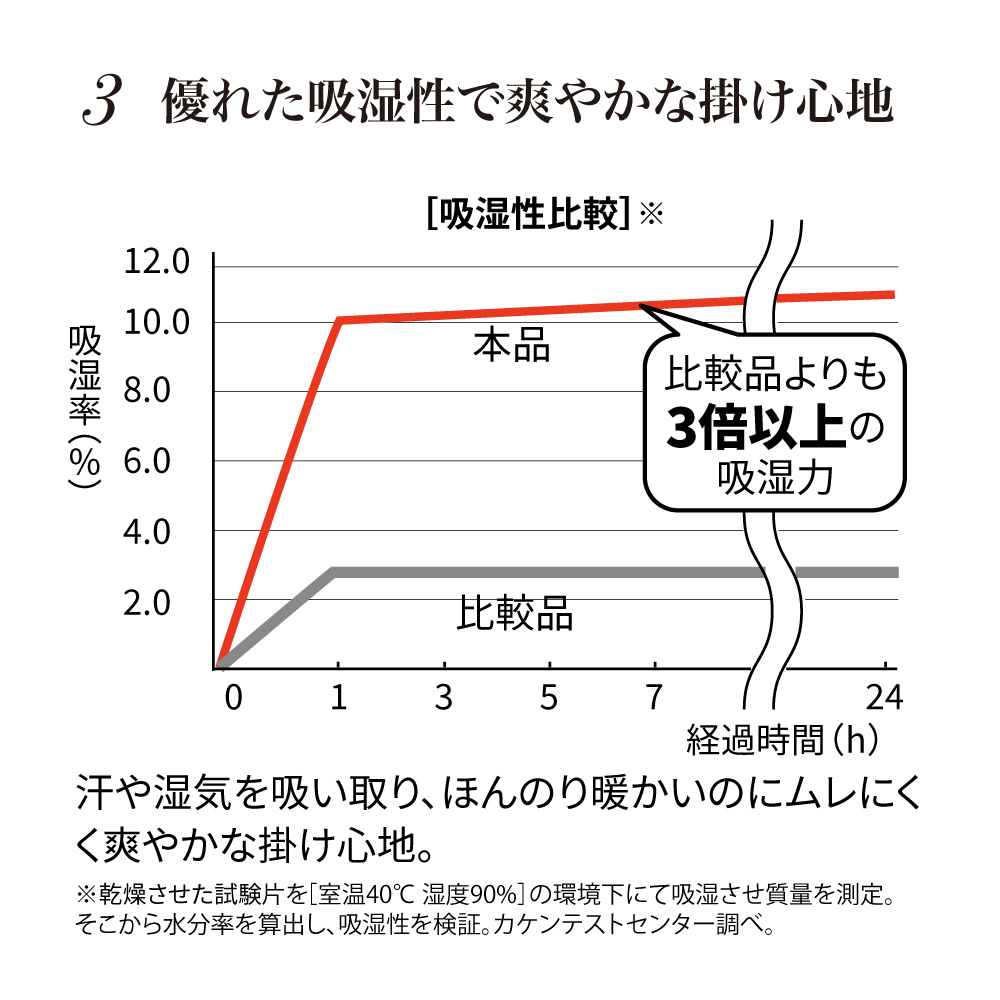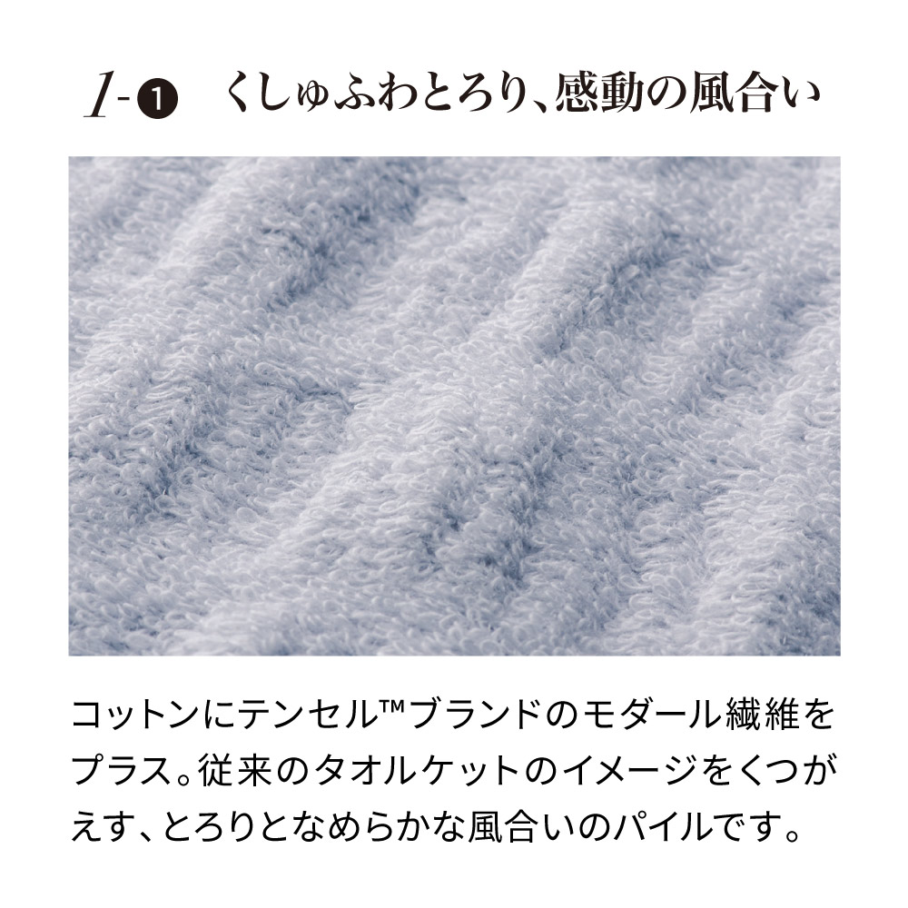 とろけるくしゅふわ感で包んでくれるパイルケット。とろけるようになめらかな肌ざわりと、密着しすぎず身体に寄り添う肌沿いにうっとり。吸湿性が高く、包み込まれる安心感とムレにくい爽やかさを同時に味わえます。寝返りしてもズレにくく快適。夏場は一枚で爽やかに、それ以外の季節は掛け布団の中入れてインナーケットとしても使えて、一年中活躍します。とろけるくしゅふわ感で包んでくれるパイルケット。とろけるようになめらかな肌ざわりと、密着しすぎず身体に寄り添う肌沿いにうっとり。吸湿性が高く、包み込まれる安心感とムレにくい爽やかさを同時に味わえます。寝返りしてもズレにくく快適。一枚でもインナーケットとしても使えて、一年中活躍します。選べるおしゃれな3カラー。上から(ア)オフホワイト、(ウ)モーヴピンク、(イ)ムーングレー 気分が上がるカラーバリエーション。大人の寝室に似合う落ち着いたトーンです。
