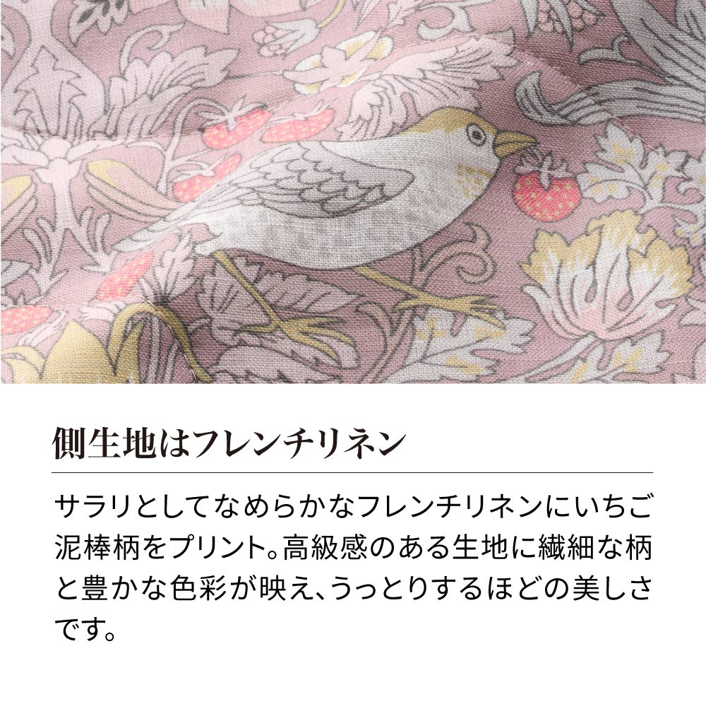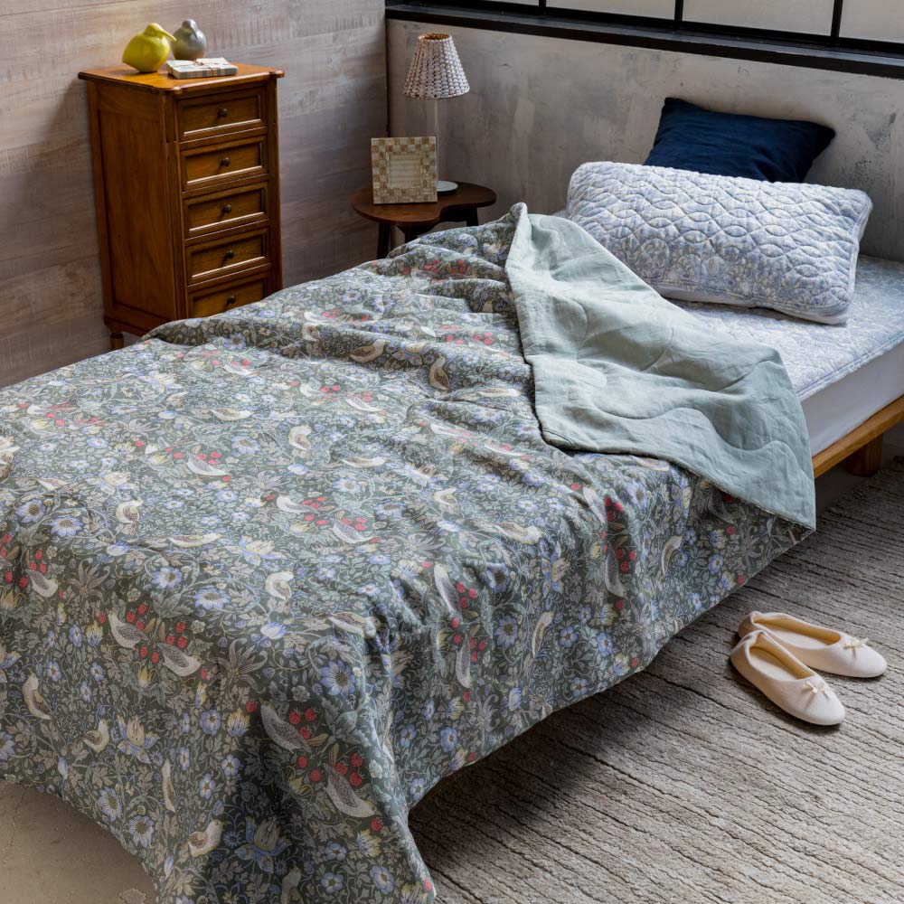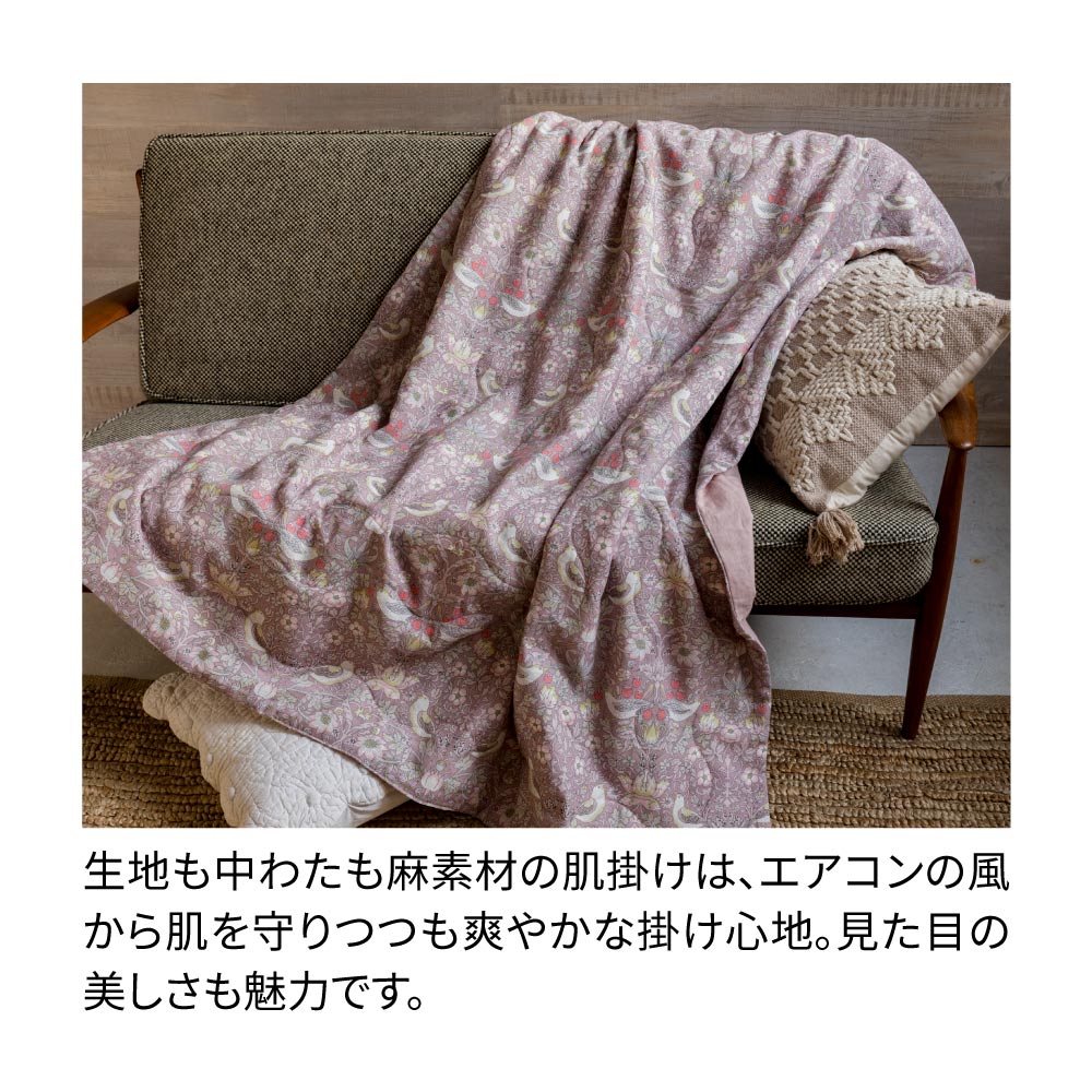 ウィリアム・モリスの人気デザイン「いちご泥棒」柄のリネンケット。生地から中わたまでオール麻素材にこだわりました。ウィリアム・モリスの人気デザイン「いちご泥棒」柄のリネンケット。生地から中わたまでオール麻素材にこだわりました。(ア)グリーン系(イ)ピンク系麻わた入りの寝具はドライクリーニング指定が多い中こちらは自宅で丸洗いOK左:肌掛け(イ)ピンク系、ピローパッド、敷パッド ベージュ系 右:肌掛け(ア)グリーン系、ピローパッド、敷パッド ブルー系 ※お届けは肌掛けです。